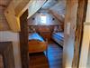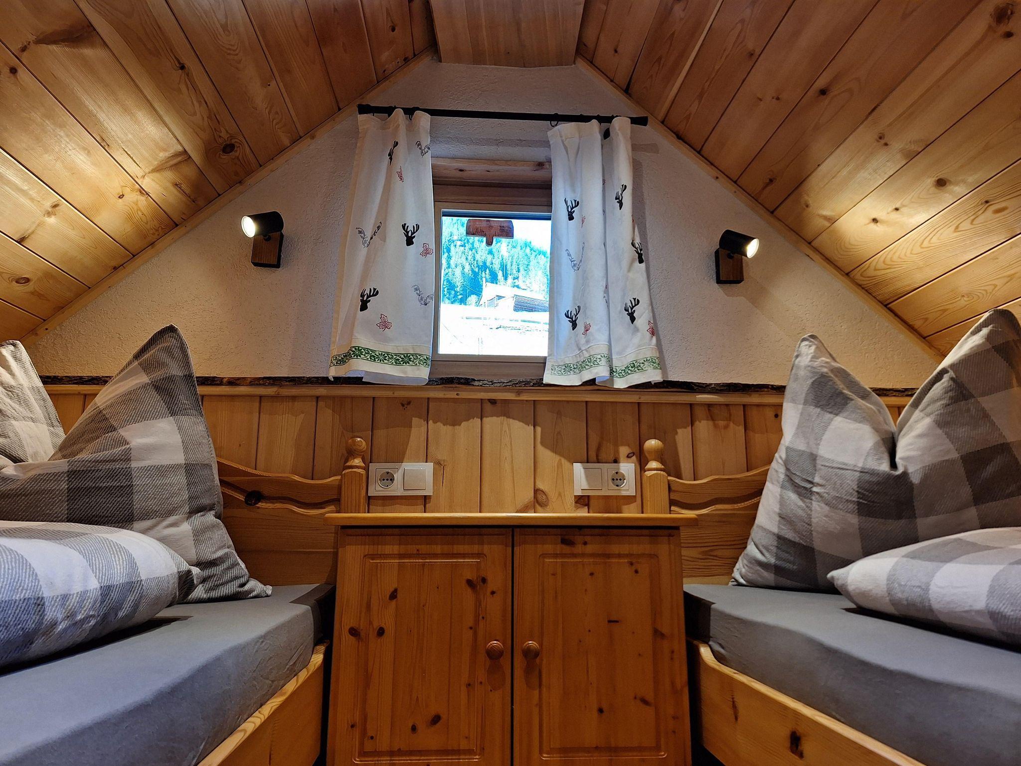 Im Obergeschoss sind zwei Schlafnieschen mit einem Doppelbett und zwei Einzelbetten und genügend Stauraum für Kleidung.