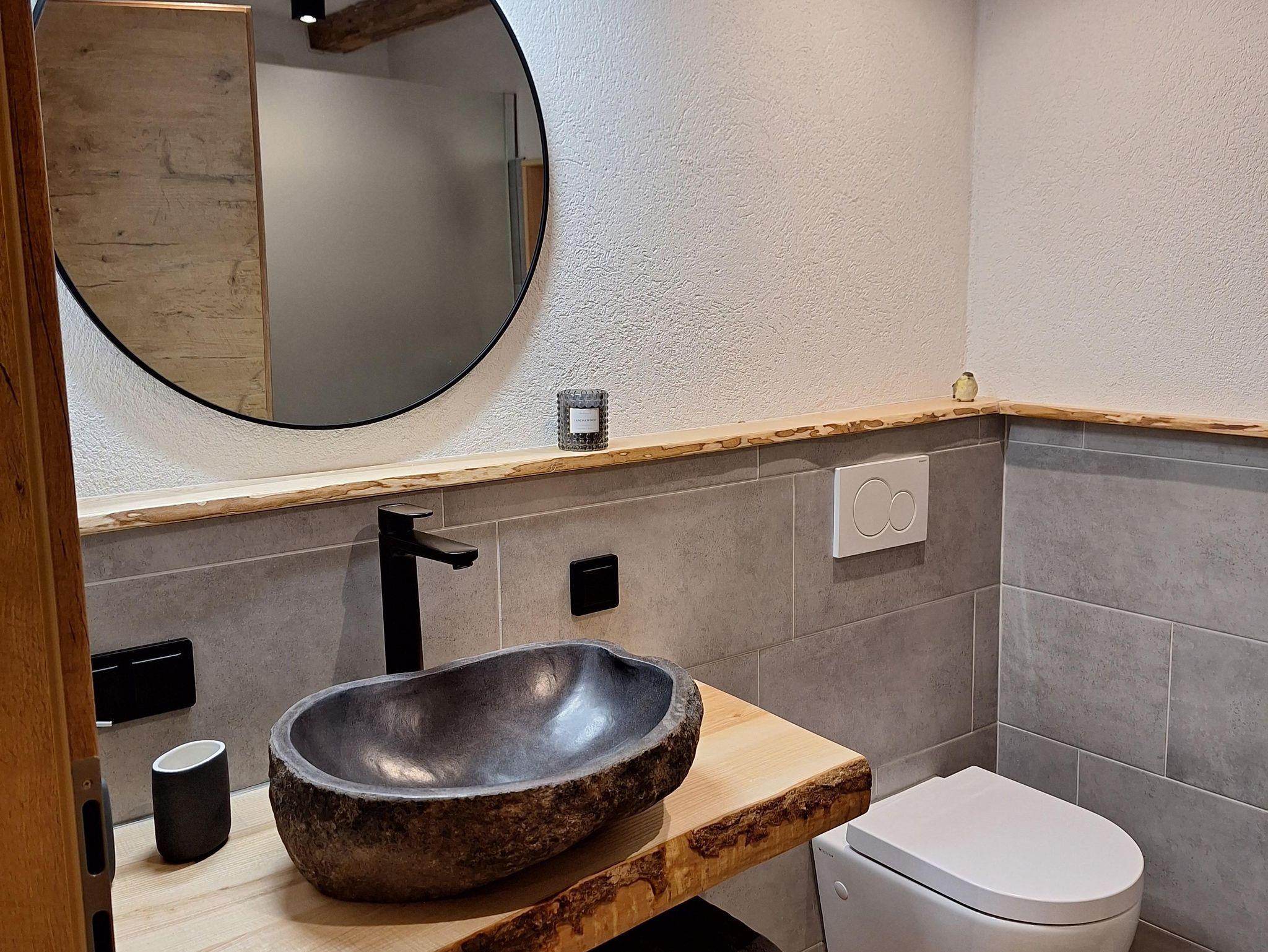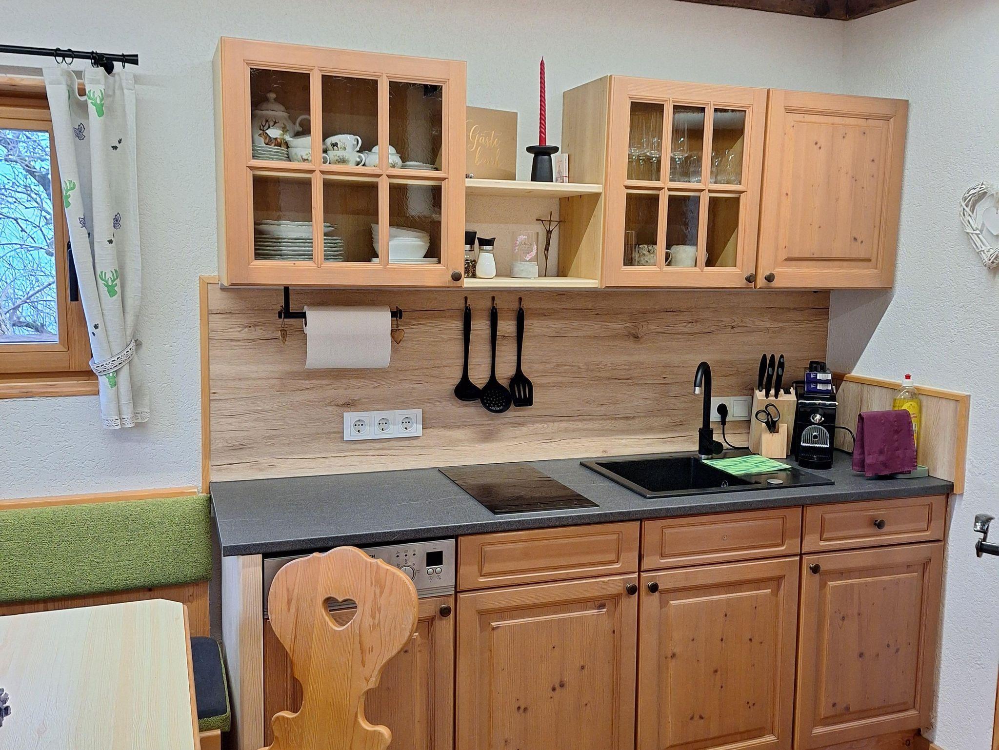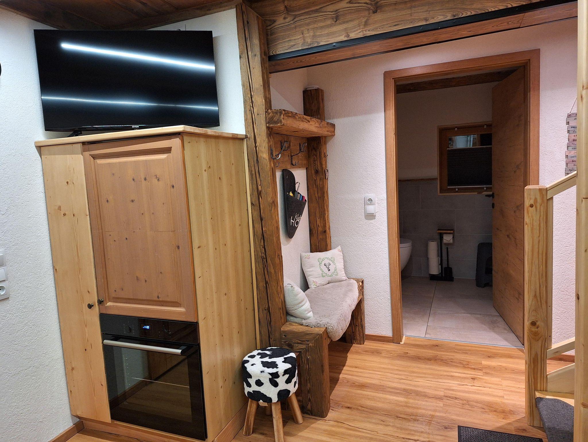 Unser Troadkasten ist ein rustikal-modern eingerichtetes Appartement. Im Erdgeschoss befindet sich eine voll ausgestattete Küche mit Geschirrspüler, Kühlschrank, Kaffeemaschine usw., eine gemütliche Eckbank mit Blick zum Fernseher, eine Garderobe und ein modernes Bad mit Dusche und WC.