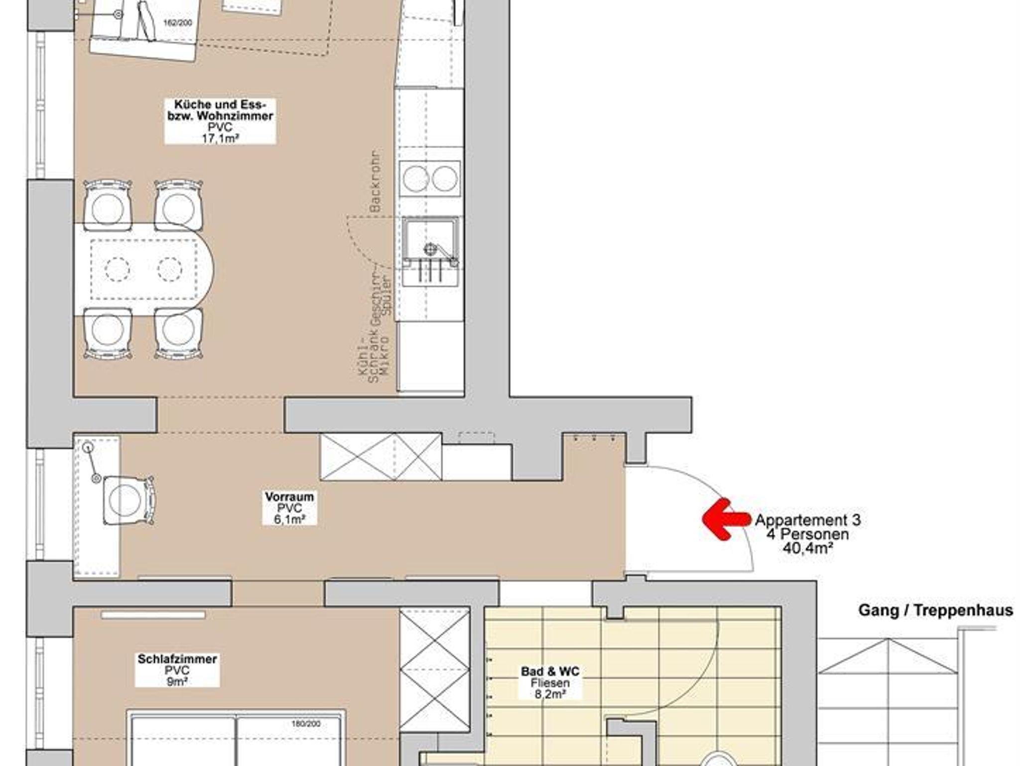• Wohnschlafraum mit komplett eingerichteter Küchenzeile, Kühlschrank mit kleinem Gefrierfach, Filterkaffeemaschine, Wasserkocher, Geschirrspüler, Backrohr, Ceranfeld, Mikrowelle, Esstisch mit Stühlen, Doppelschlafsofa, SAT-TV, Schreibtisch, Safe, WLAN