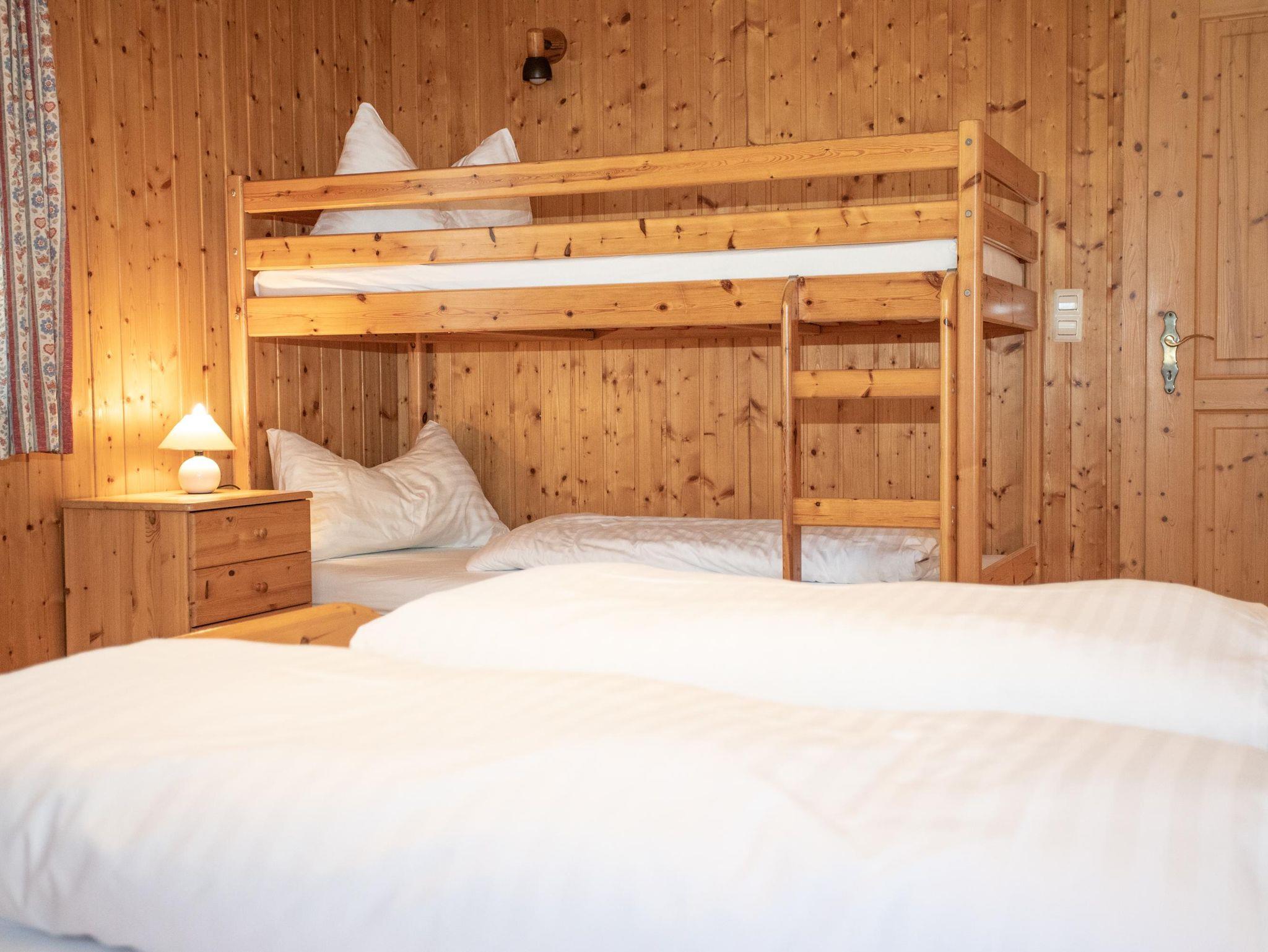großzügiges Appartement mit zwei Schlafzimmern und Schlafnische im Küchenbereich (1 Schlafzimmer mit Doppelbett und Stockbett, 1 Schlafzimmer mit Doppelbett, 1 Stockbett in Schlafnische), Bad mit Badewanne, separates WC, voll ausgestattete Küche sowie Balkon mit Gartenblick