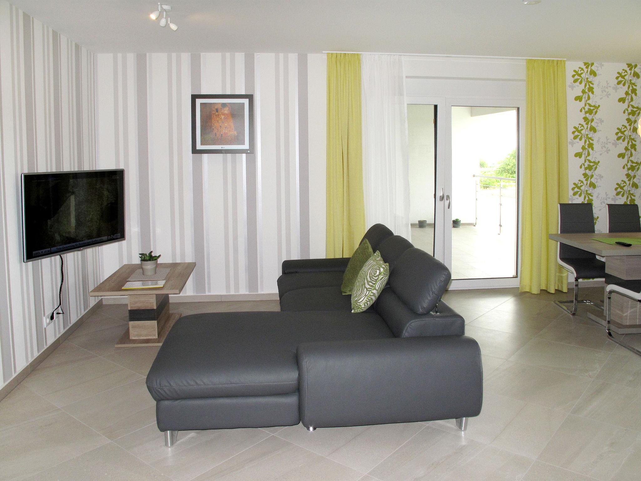"Fuchs", 3-room apartment 80 m2, on the upper ground floor. Bright, modern and stylish furnishings: living/sleeping room with 1 double sofabed, dining table and cable TV. Exit to the terrace. 1 room with 1 double bed and shower/WC. 1 room with 1 double bed. Open kitchen (oven, dishwasher, 4 ceramic glass hob hotplates, toaster, kettle, electric coffee machine). Bath/WC. Air-conditioning, underfloor heating. Natural stone floors. Terrace roofed. Terrace furniture, barbecue (portable), box-room. Facilities: mosquito net. Internet (WiFi, free). Parking (1 car). Please note: non-smokers only. Maximum 2 pets/ dogs allowed. Smoke alarm.