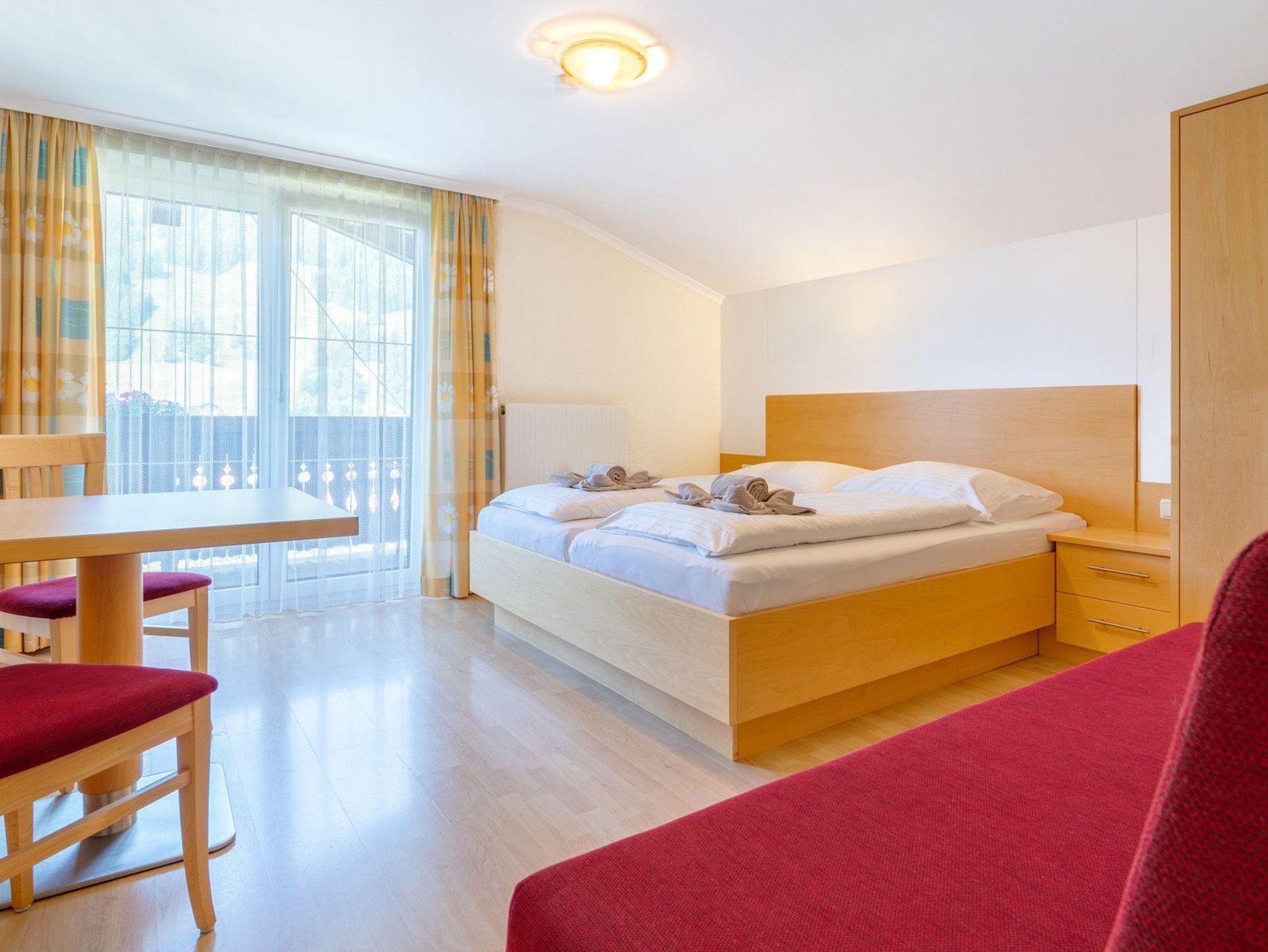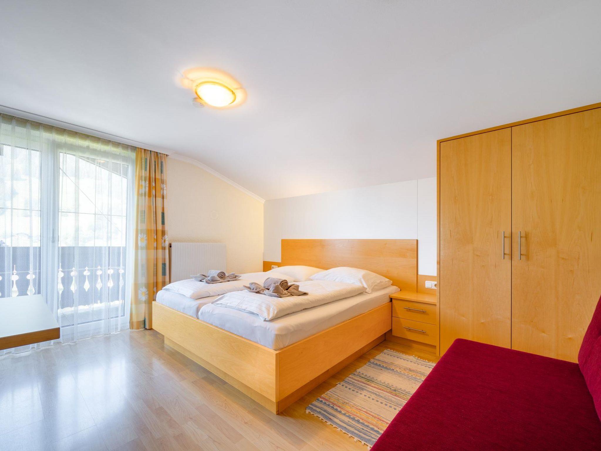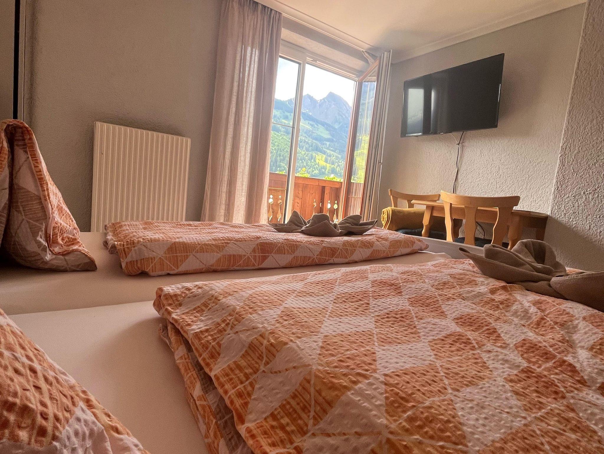 2-3 Personen, Sofa für 3. Person – Bett 180 cm lang, 90 cm breit, Sitzgelegenheit, Doppelbett, Bad mit Dusche und WC, 2. Stock, Südwestbalkon zur Sonnenseite mit traumhaften Garten- und Bergblick