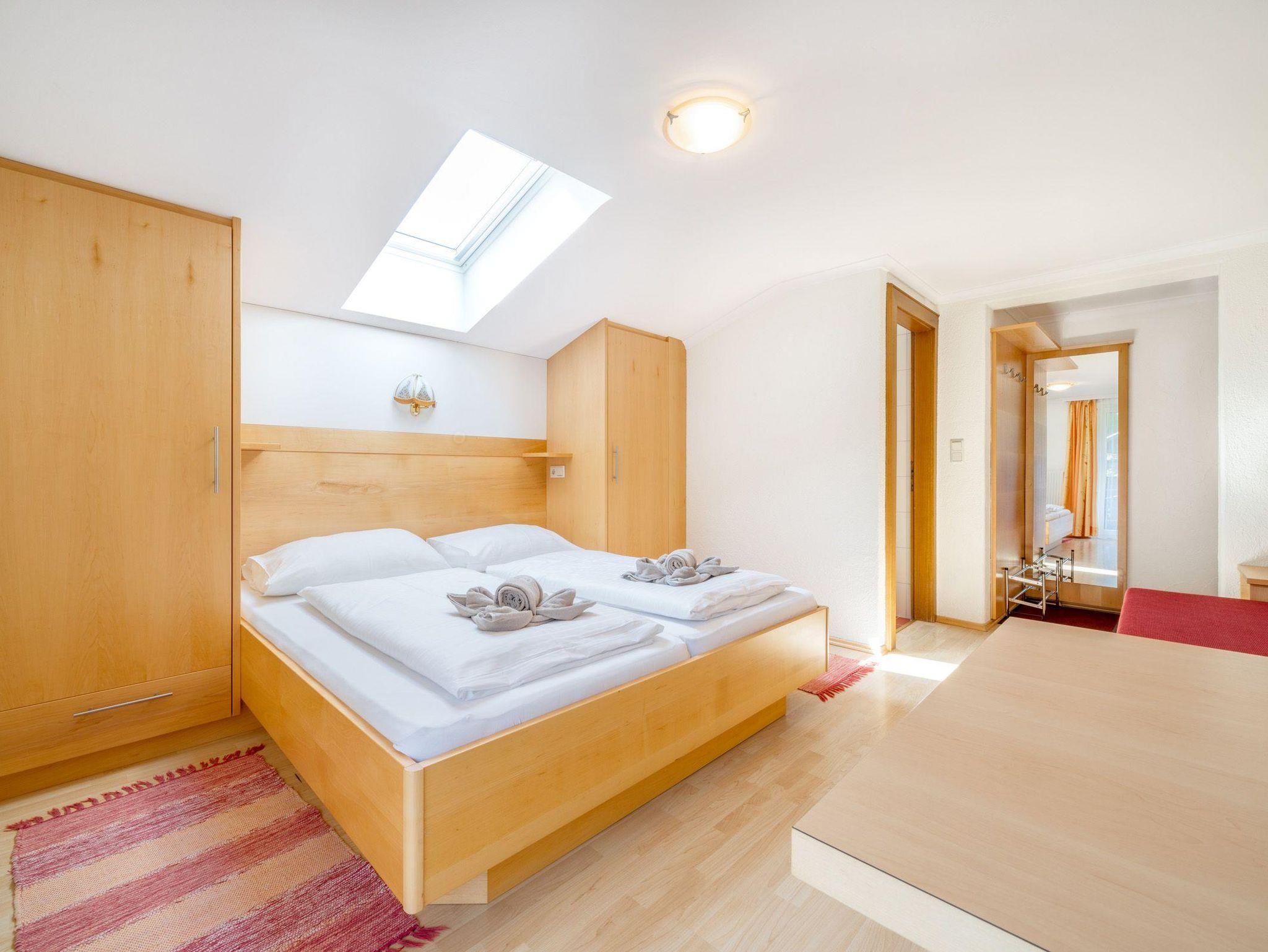 2-3 Personen, Sofa für 3. Person – Bett 180 cm lang, 90 cm breit, Sitzgelegenheit, Doppelbett, Bad mit Dusche und WC, 2. Stock, Ostbalkon mit Morgensonne