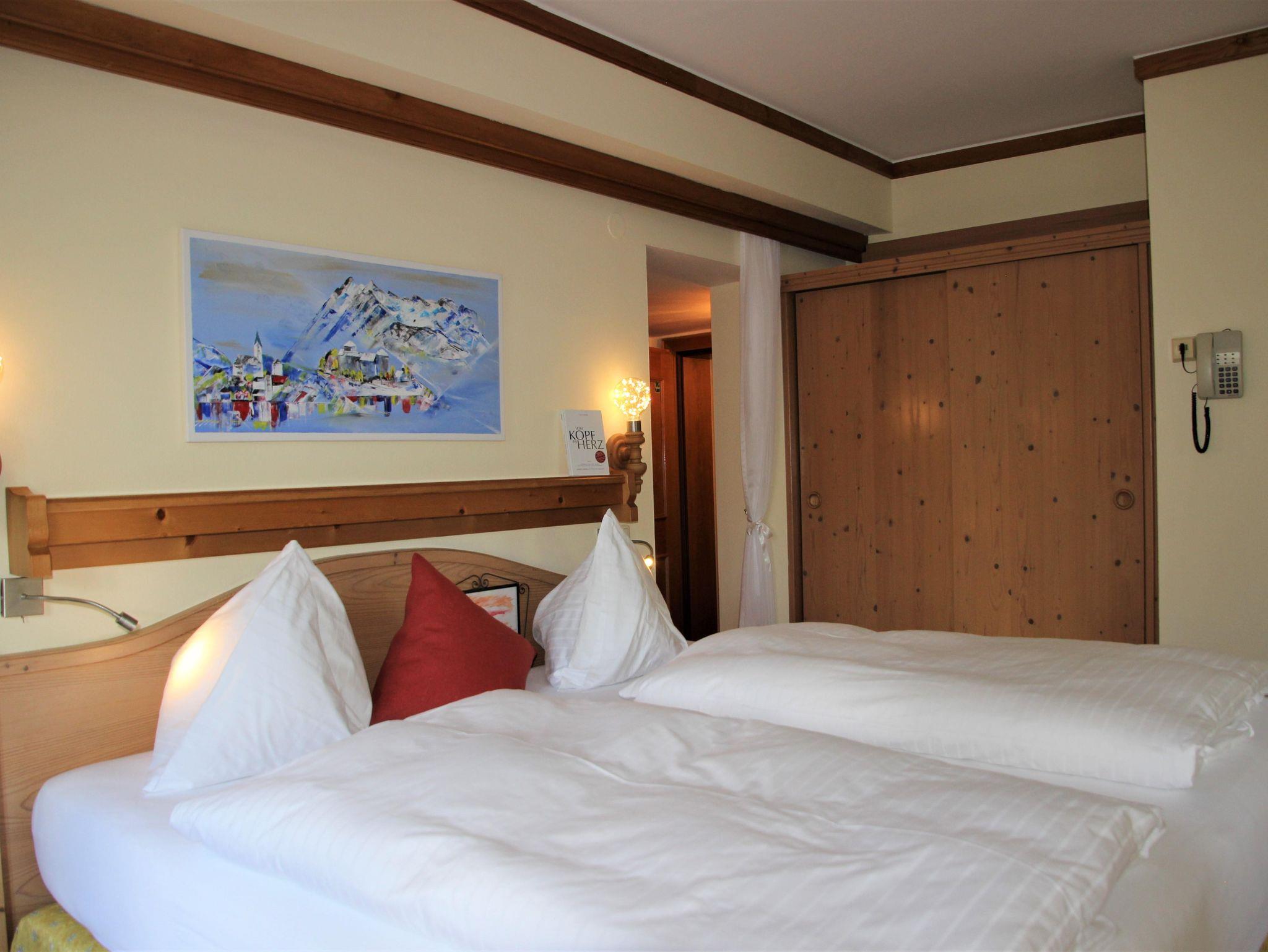 Die Ausstattung lässt keine Wünsche offen: 1,85 mal 2 Meter Komfort-Doppelbett in Topqualität, Dusche mit getrenntem WC, Sitzgelegenheit mit Kaffee/Teeservice, eigener Balkon mit Aussicht auf die Berge. In diesem Zimmer sind getrennte Betten möglich.