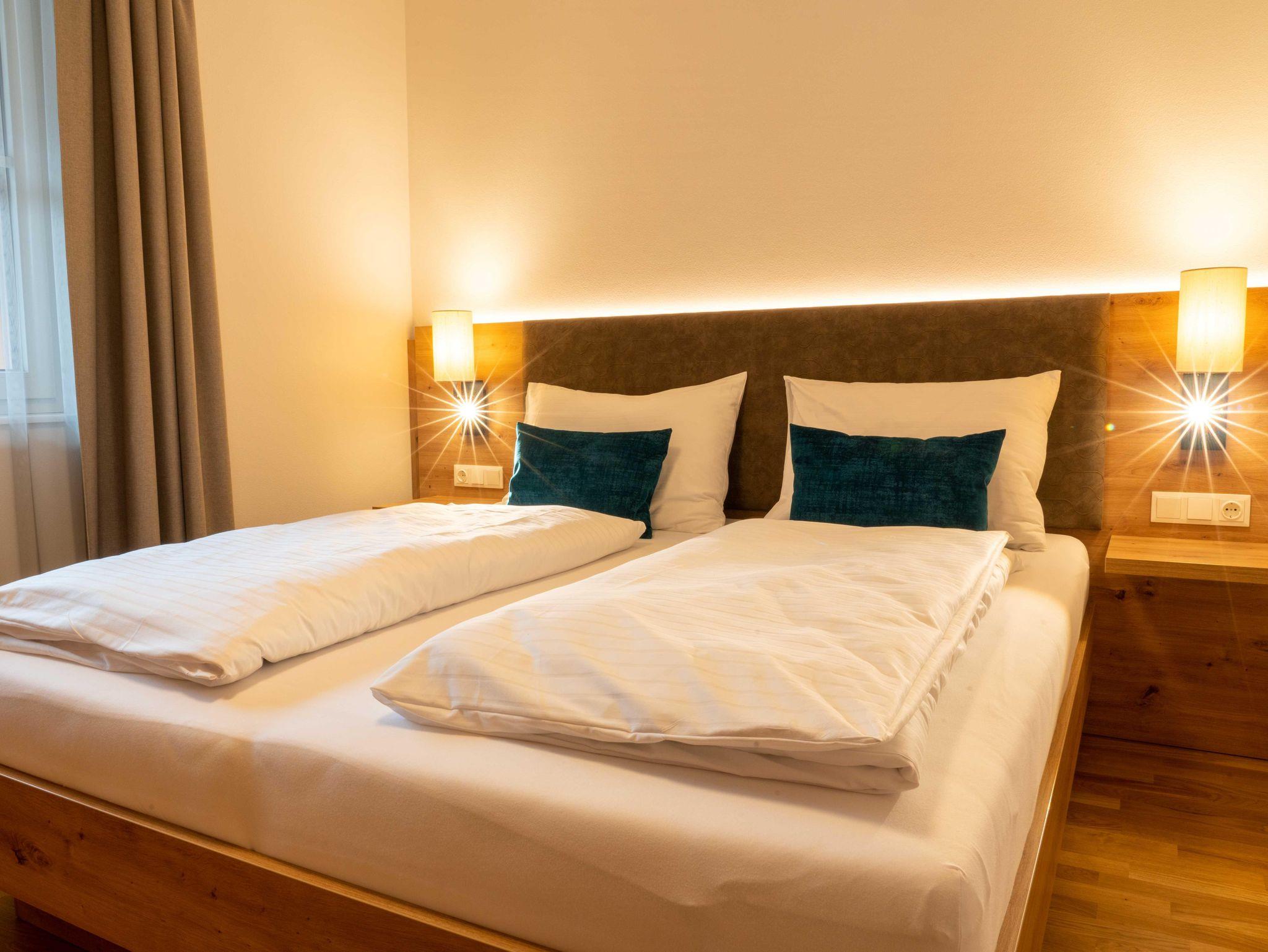• geräumigen, Vollholz-möblierten Einzel-, Doppel-, Familienzimmern und Studios mit Boxspringbetten in „Treca“ Topqualität, Dusche oder Badewanne, separatem WC