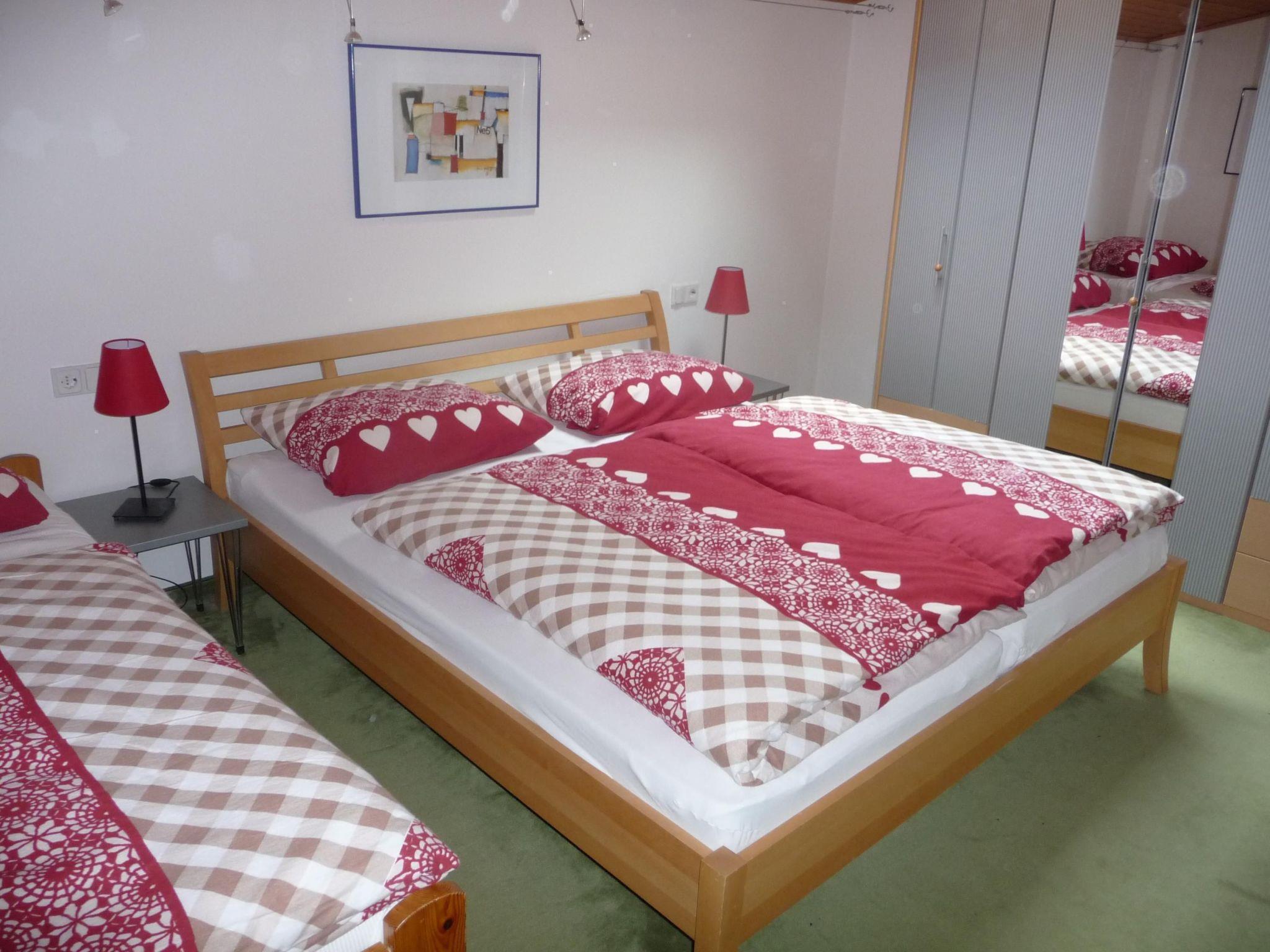 Its 95m² provide a big, comfortable living and dining room with a built-in kitchen, a tiled fireplace stove, two bedrooms, two WCs and a bathroom. The fully furnished apartment also has satellite TV, a radio and a CD player. A travel cot and a highchair are available for toddlers. Pillows, duvets and covers are provided, please bring your own hand towels and tea towels. The tiled fireplace stove with the firewood provided can be used for heating alongside the central under-floor heating. The kitchen is equipped with a tableware, cookware, a fondue and raclette set, a stove and oven, extractor fan, dishwasher, fridge and coffee machine. The basement has a sauna for three to four people, as well as a table tennis table, exercise machines and another TV, a washing machine and a dryer.