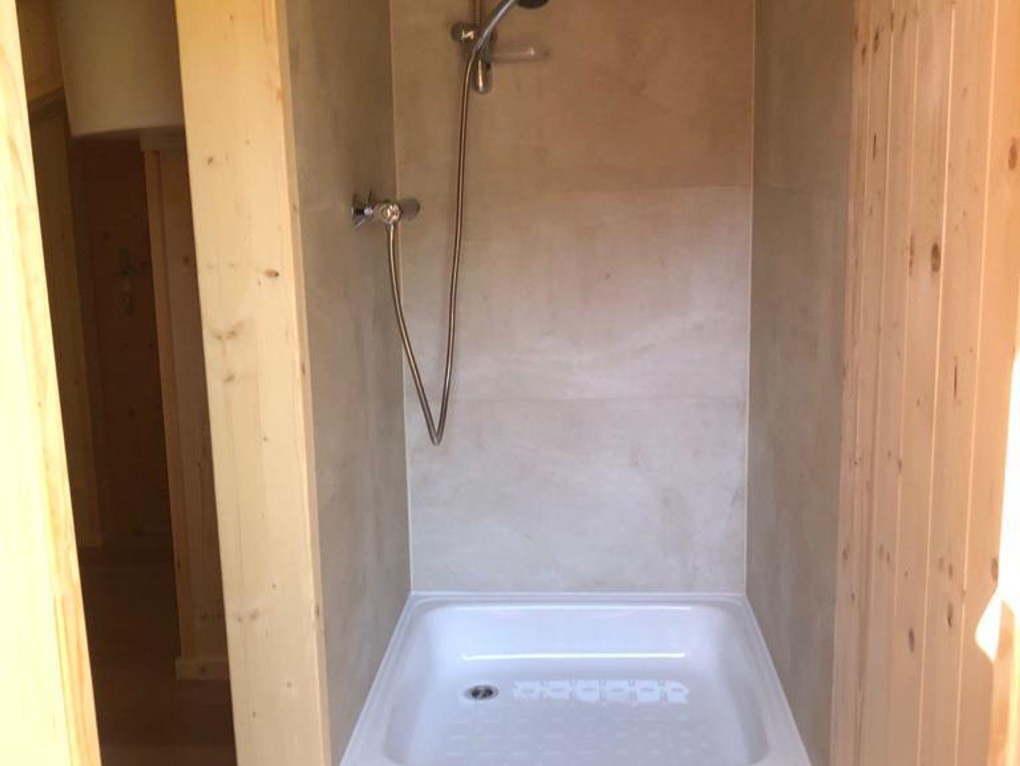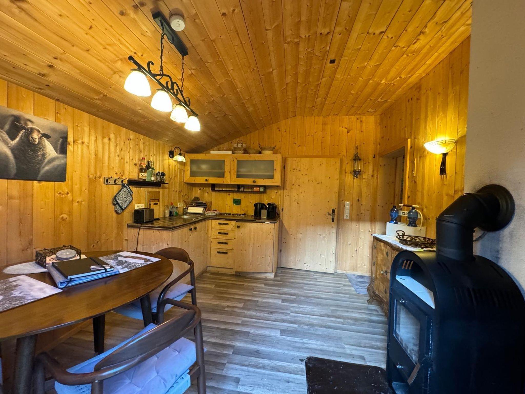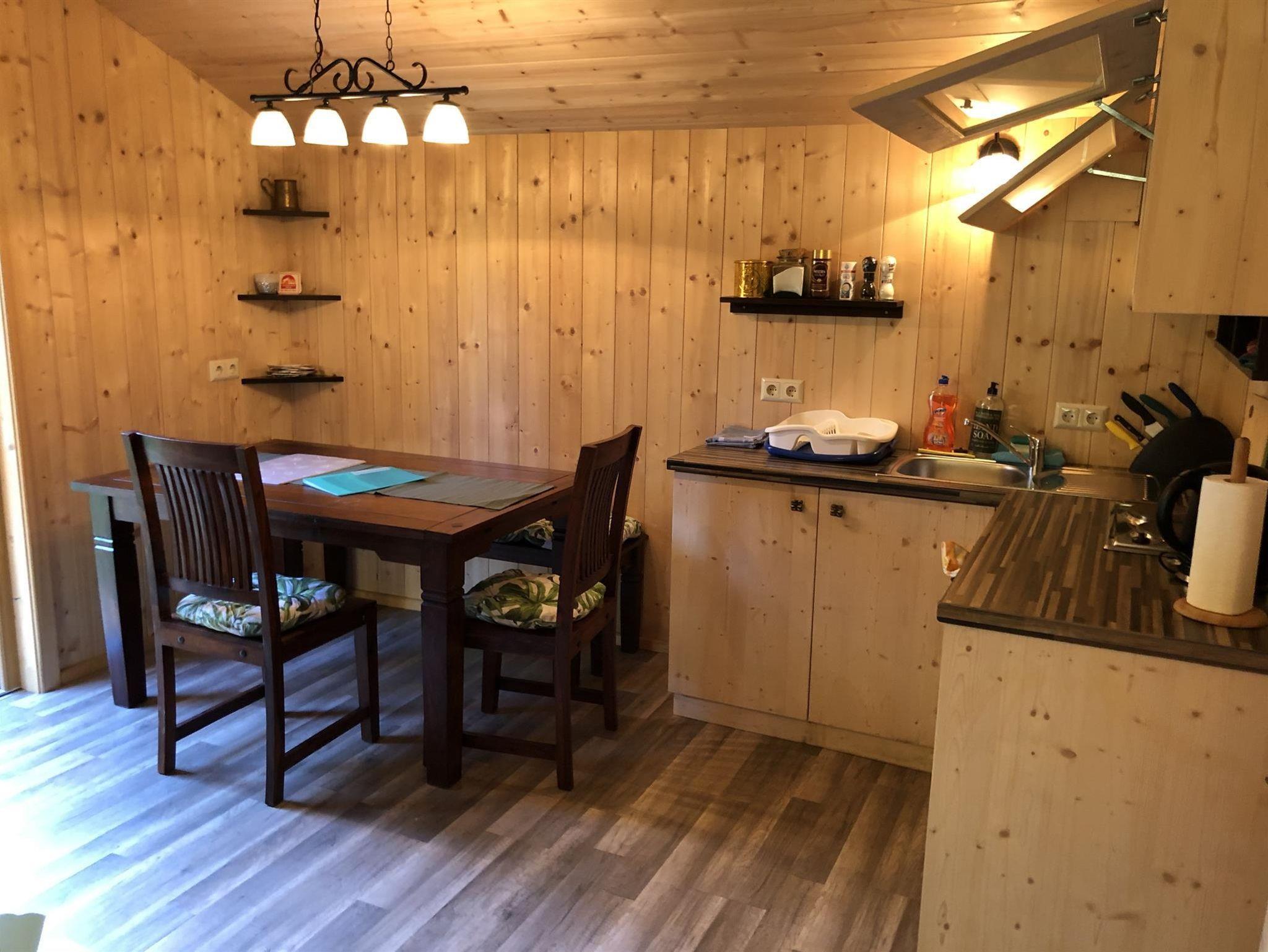 Unser Nocksternchen ist ganz aus Holz. Dusche, WC und Waschbecken, eine kleine Küche mit rustikalen Tisch und Kaminofen und ein lauschiges Doppelzimmer mit kleinen Holzofen sind im Erdgeschoß, auf etwa 45 Quadratmeter für die Gäste da.