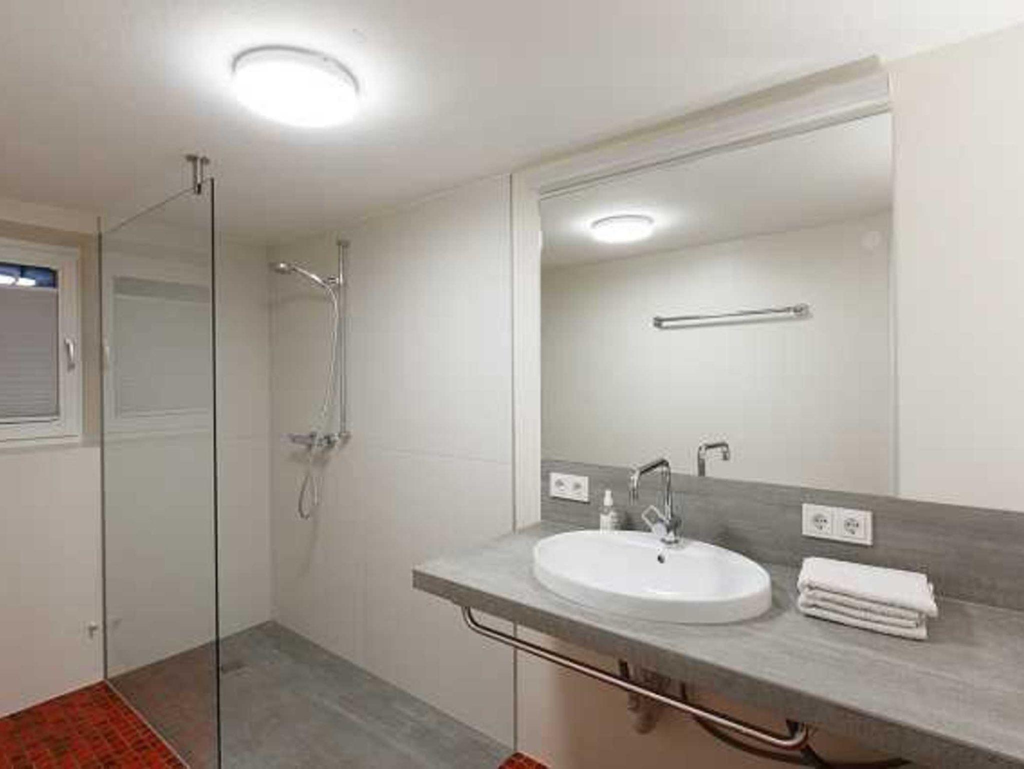 Das Bad ist eine gelungene Symbiose von alt und neu und hat eine großzügige schwellenlose Dusche, ein Waschbecken und eine Waschmaschine. Die Toilette ist in einem eigenen Raum.