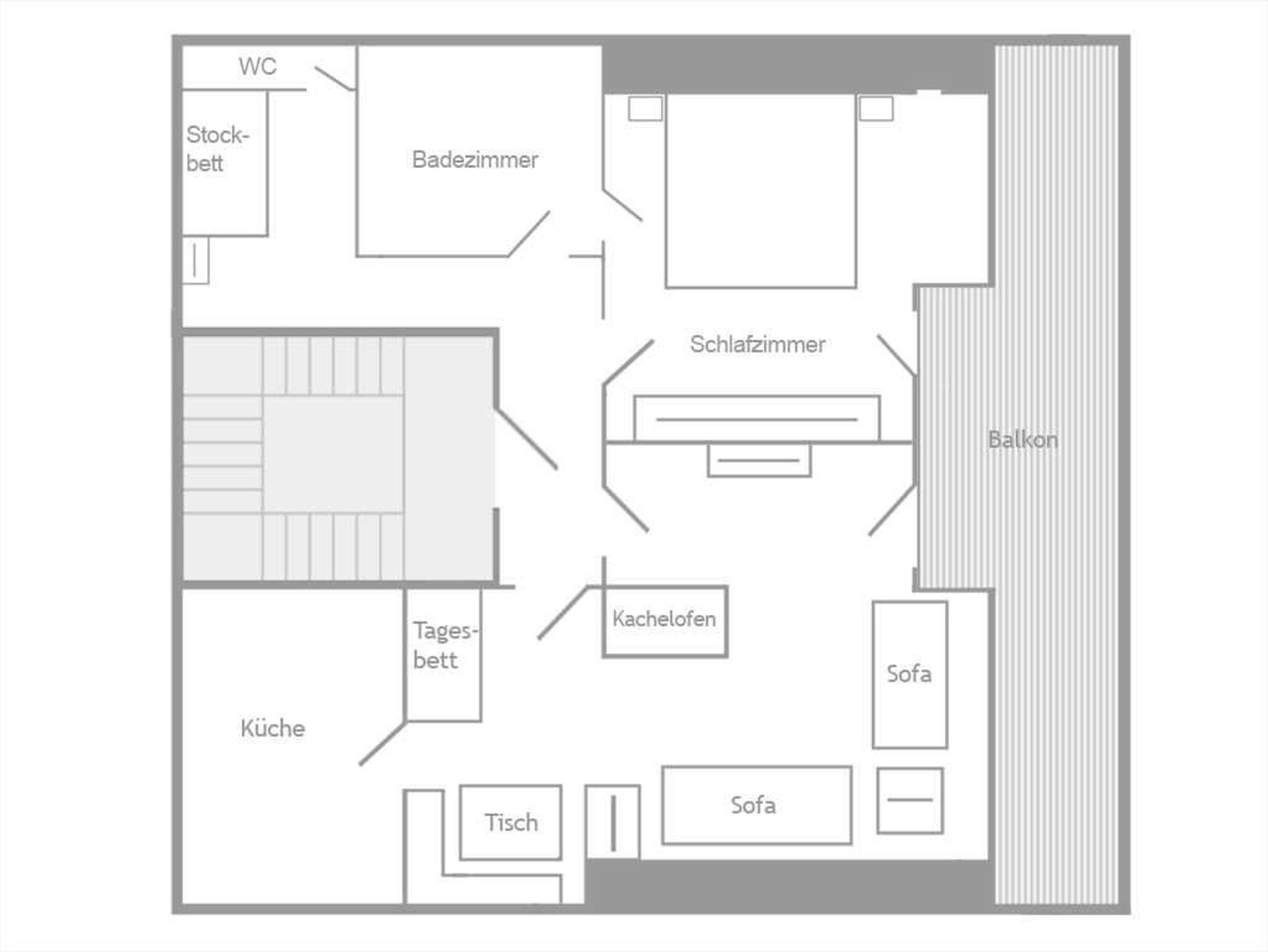 Wohnraum mit Flatscreen TV (SAT), Kachelofen, sehr gut eingerichtete Küche mit Spülmaschine, bequeme Esstisch-Sitzbank, großes renoviertes Badezimmer mit Badewanne, Dusche WC, zusätzliches separates WC, helles, komfortables Schlafzimmer, im hinteren Bereich ein Stockbett, im Wohnbereich mit 2 Sofas ist auch ein Tagesbett das als Schlafmöglichkeit benutzt werden kann, freier Internetzugang, wunderschöner, großer Balkon mit freiem Blick in die Berge. Gratis WLAN.