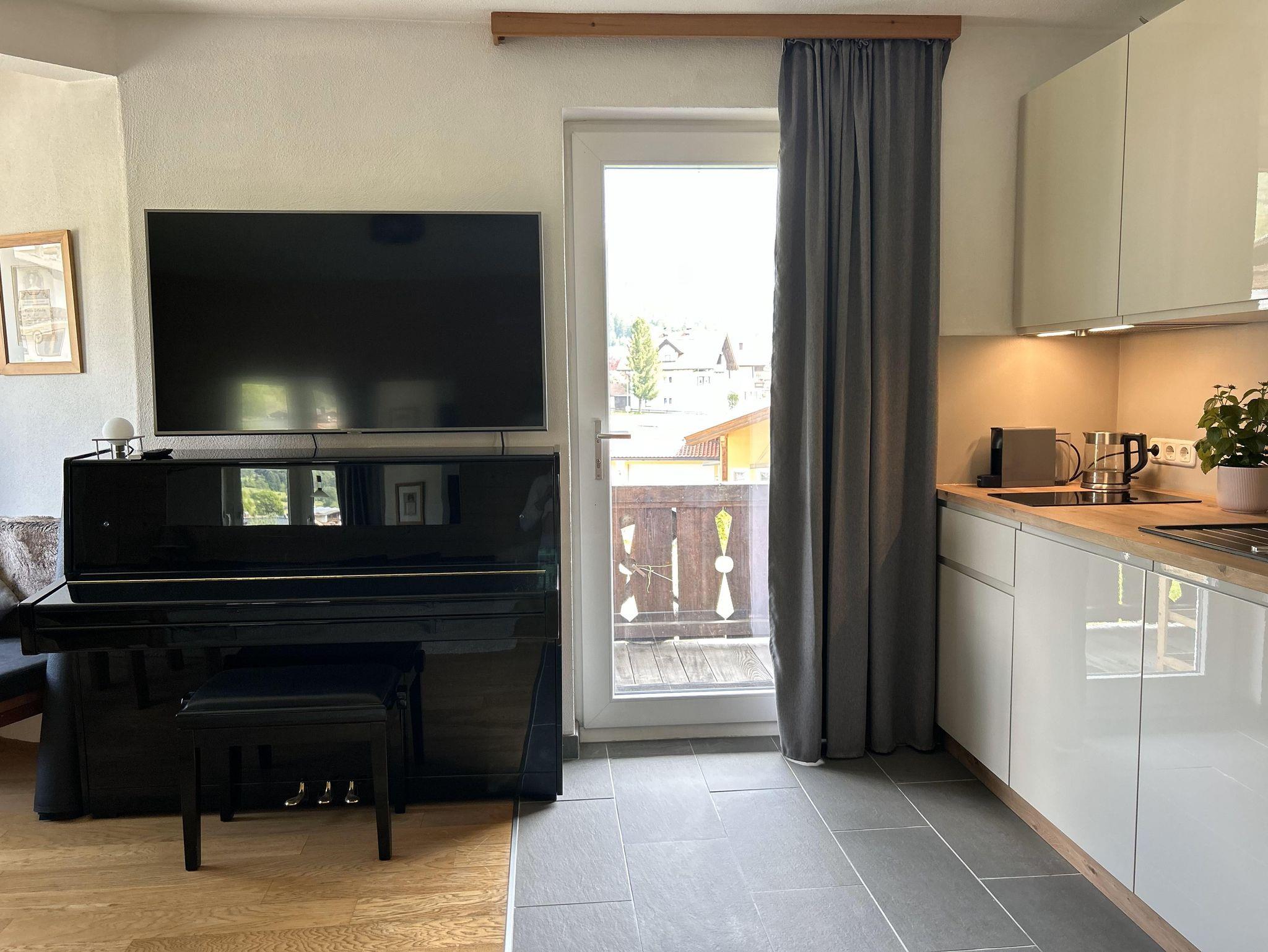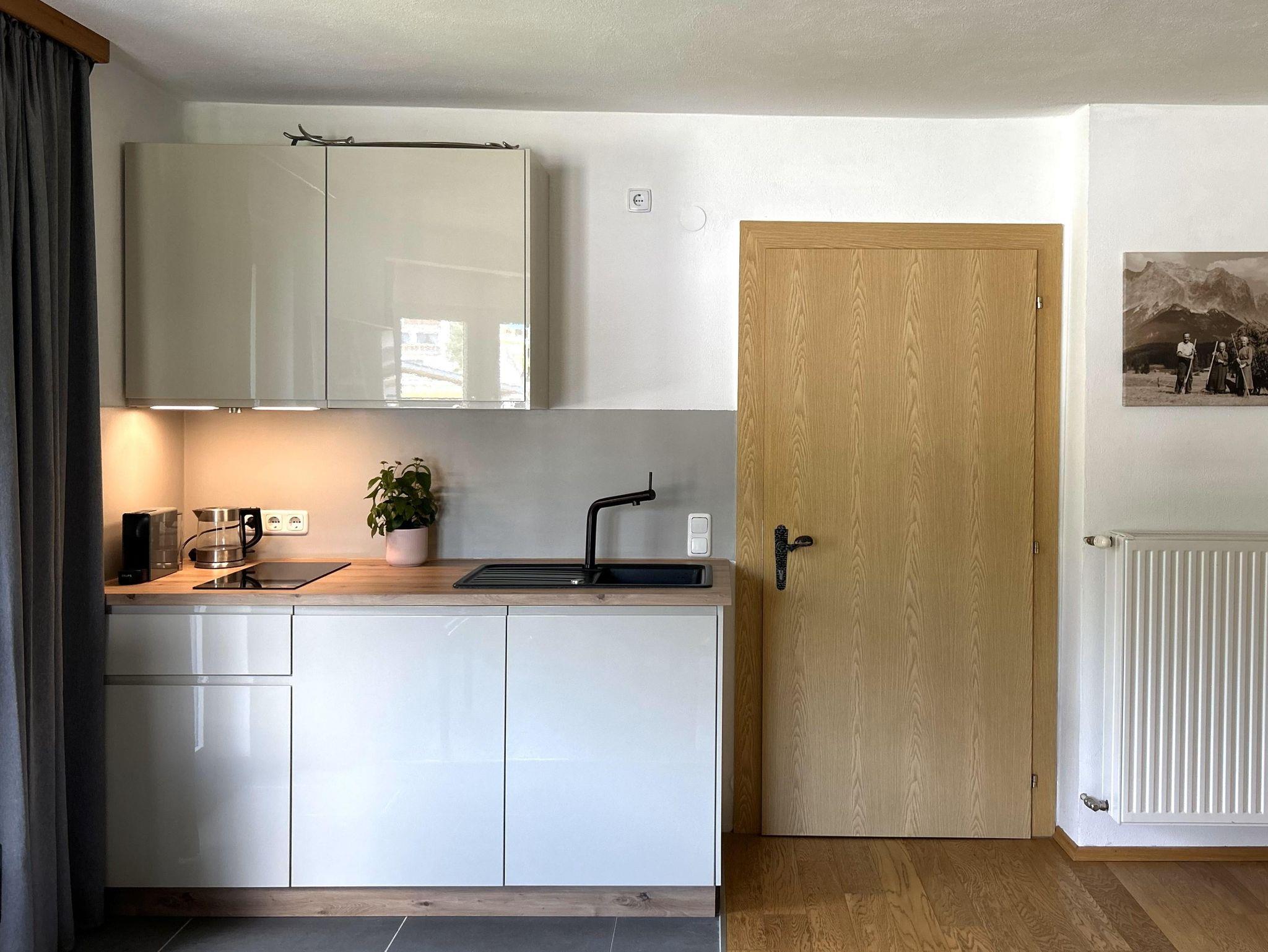 Apartment Moos (2-4 Personen) 40qm - komplett renovierte Ferienwohnung. Separates Schlafzimmer mit Doppelbett und Zugspitzblick, modernes Designerbad mit Dusche, Wohnesszimmer mit Küchenzeile, gemütlicher Sitzecke und Ausziehsofa sowie ein Klavier.