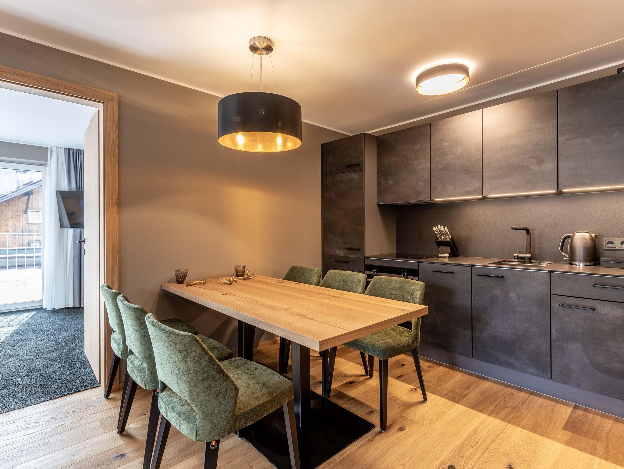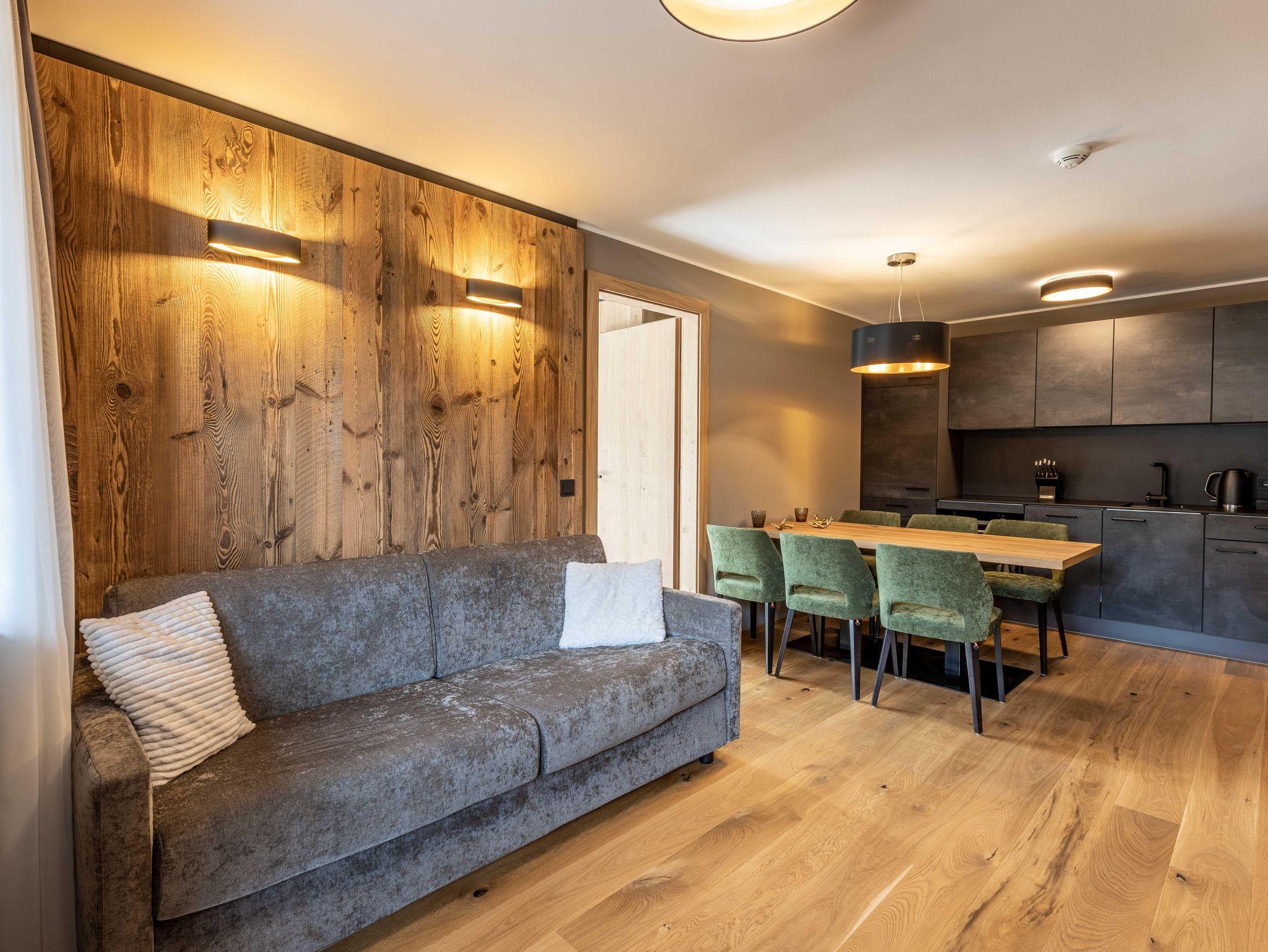 Das Apartment für 6 Personen bietet Wohnküche, 2 Schlafzimmer (Boxspringbetten, Master mit Bad und Balkonzugang), 2 Badezimmer, ein separates WC und einen großzügigen Balkon. Der Eingangsbereich, mit Garderobe, führt direkt in die Wohnküche, welche mit Küchengeräten, Kühl-Gefrierkombi sowie Nespresso Kaffeemaschine ausgestattet ist. Der Esstisch bietet Platz, um ein selbstgekochtes Mahl zu genießen. Im Wohnbereich (Balkonzugang) befindet sich ein TV, ein Kleiderschrank sowie ein Ausziehsofa.