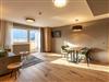 Das Apartment hat Platz für 4 Personen und bietet Wohnküche, Schlafzimmer (Boxspringbett und Balkonzugang), Bad und separates WC. Der Eingangsbereich, mit Garderobe, führt direkt in die Wohnküche mit Essbereich (Balkongzugang), welcher mit Esstisch, TV, Kleiderschrank und einem Ausziehsofa aufwartet. Die angrenzende Küche ist mit Küchengeräten, Kühl-Gefrierkombi sowie Nespresso Kaffeemaschine ausgestattet und verfügt außerdem über Küchengeschirr inklusive Töpfe und Pfannen.