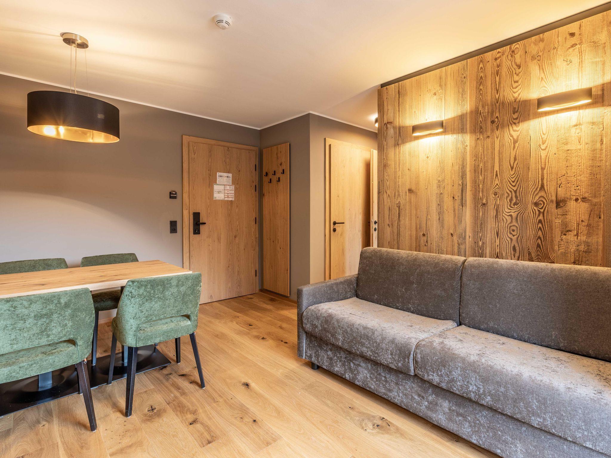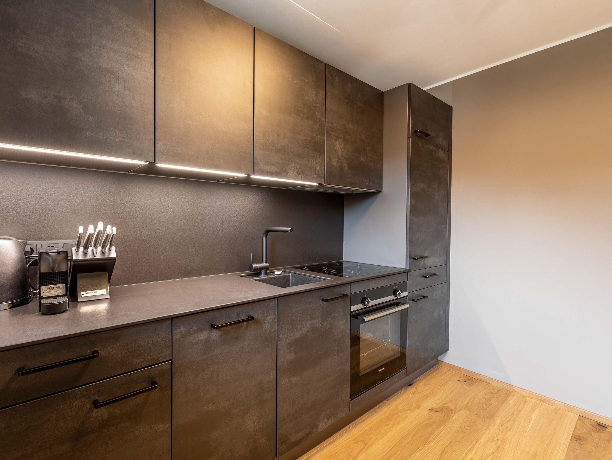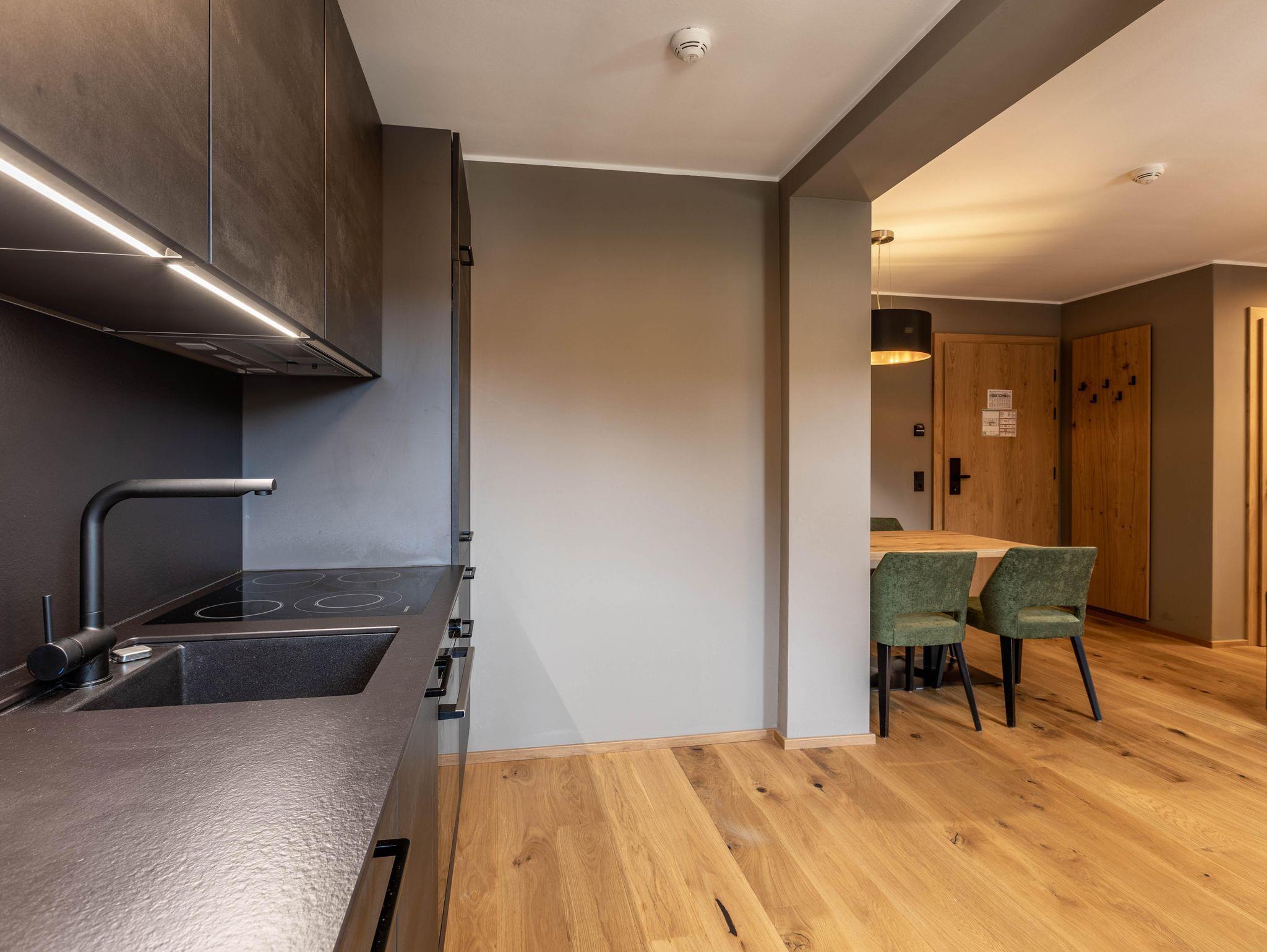 Das Apartment für 4 Personen bietet Wohnküche, Schlafzimmer (Boxspringbett+Balkonzugang), Bad, separates WC und Balkon. Der Eingangsbereich, mit Garderobe, führt direkt in den Wohn und Essbereich (Balkonzugang), welcher mit Esstisch, TV, Kleiderschrank und einem Ausziehsofa aufwartet. Die angrenzende Küche ist mit Küchengeräten, Kühl-Gefrierkombi sowie Nespresso Kaffeemaschine ausgestattet und verfügt außerdem über Küchengeschirr inklusive Töpfe und Pfannen.