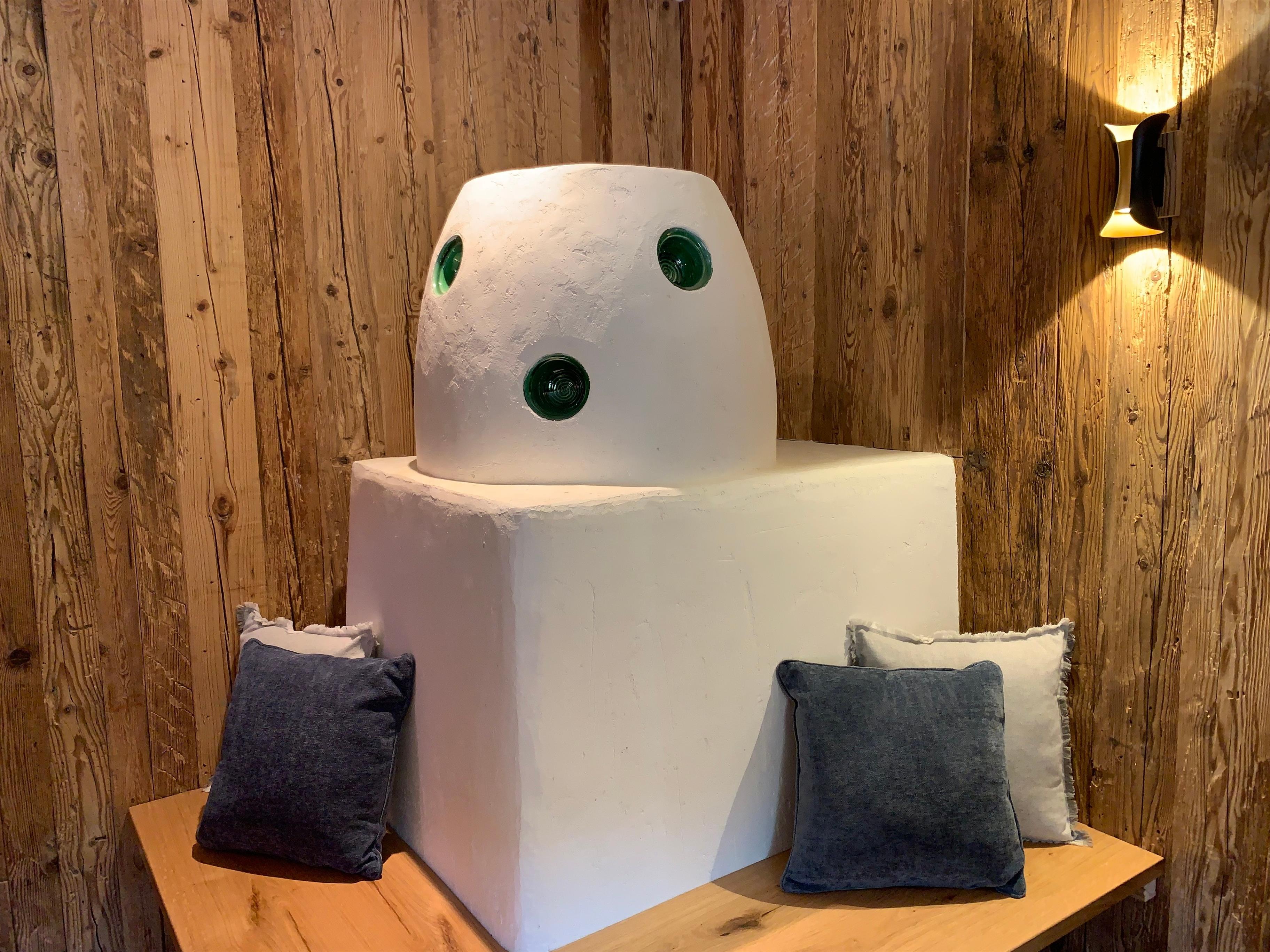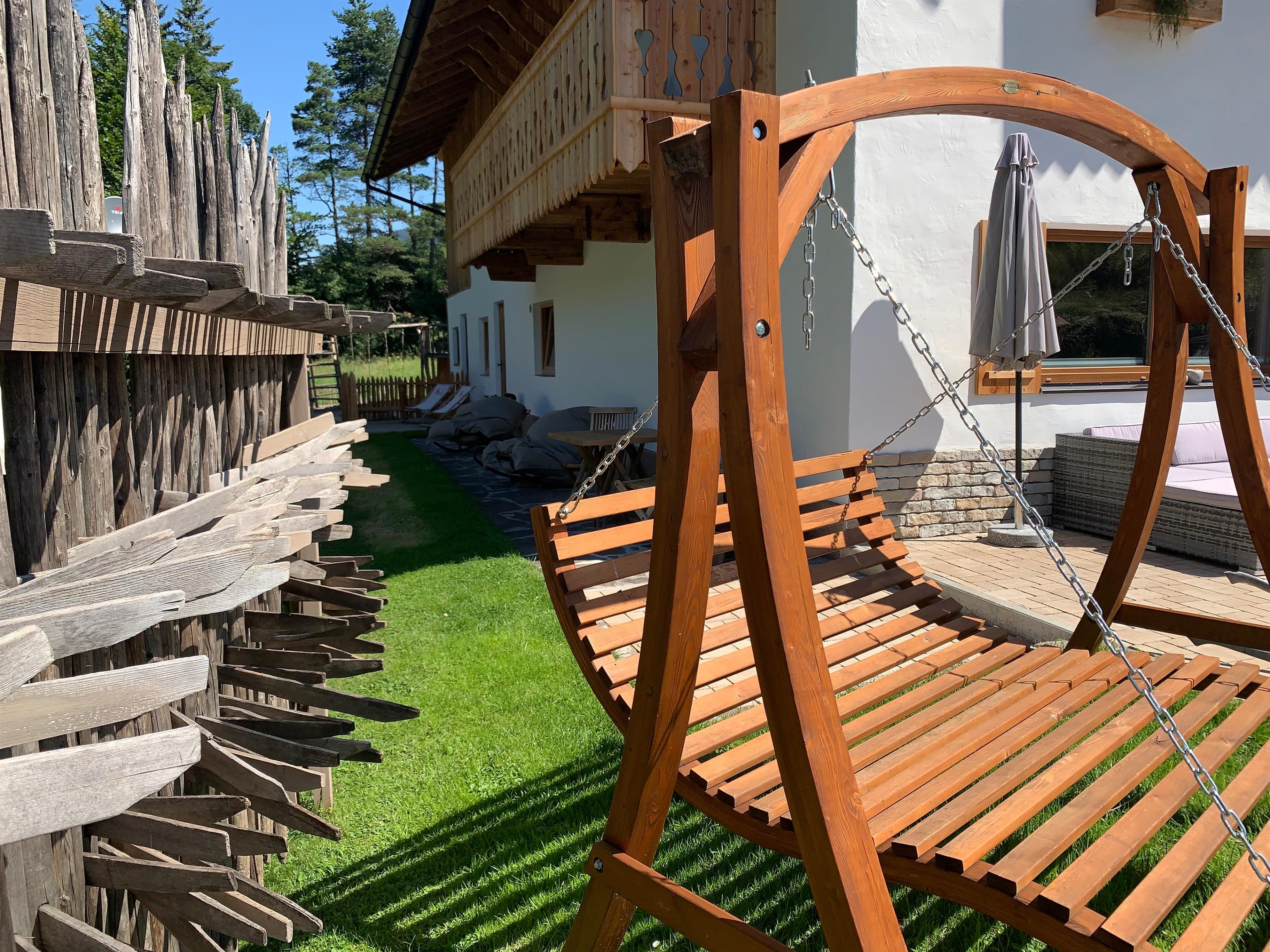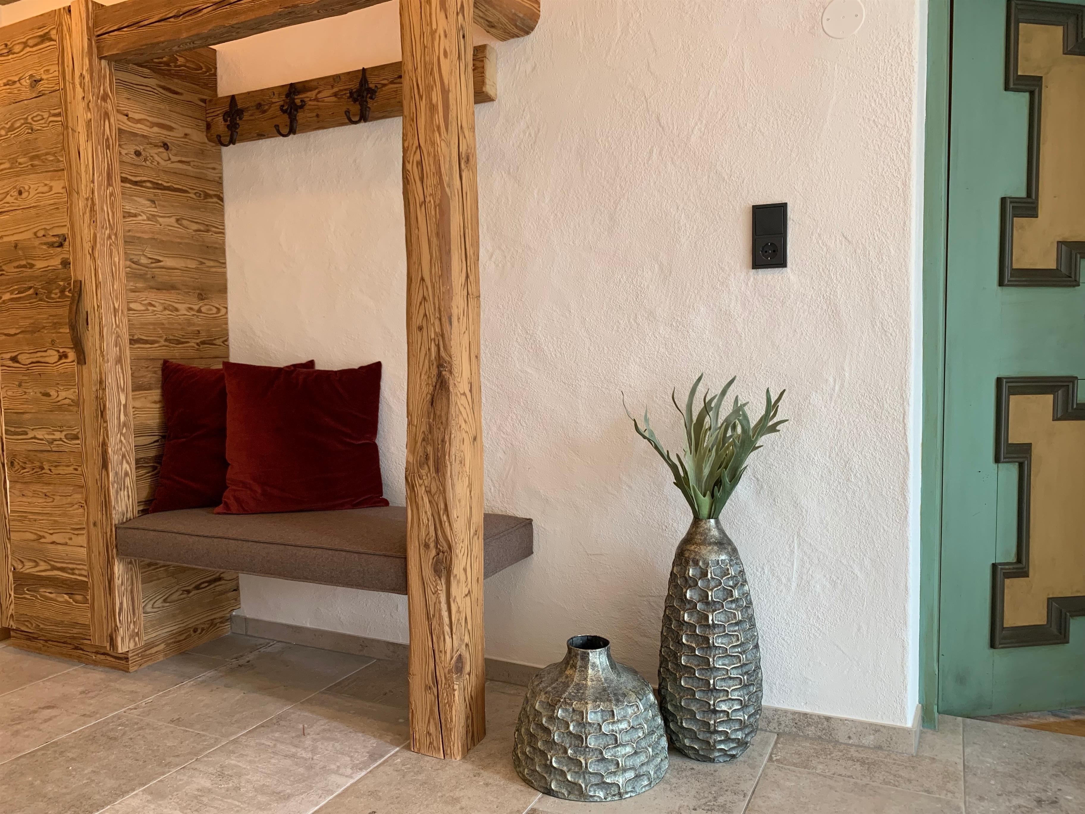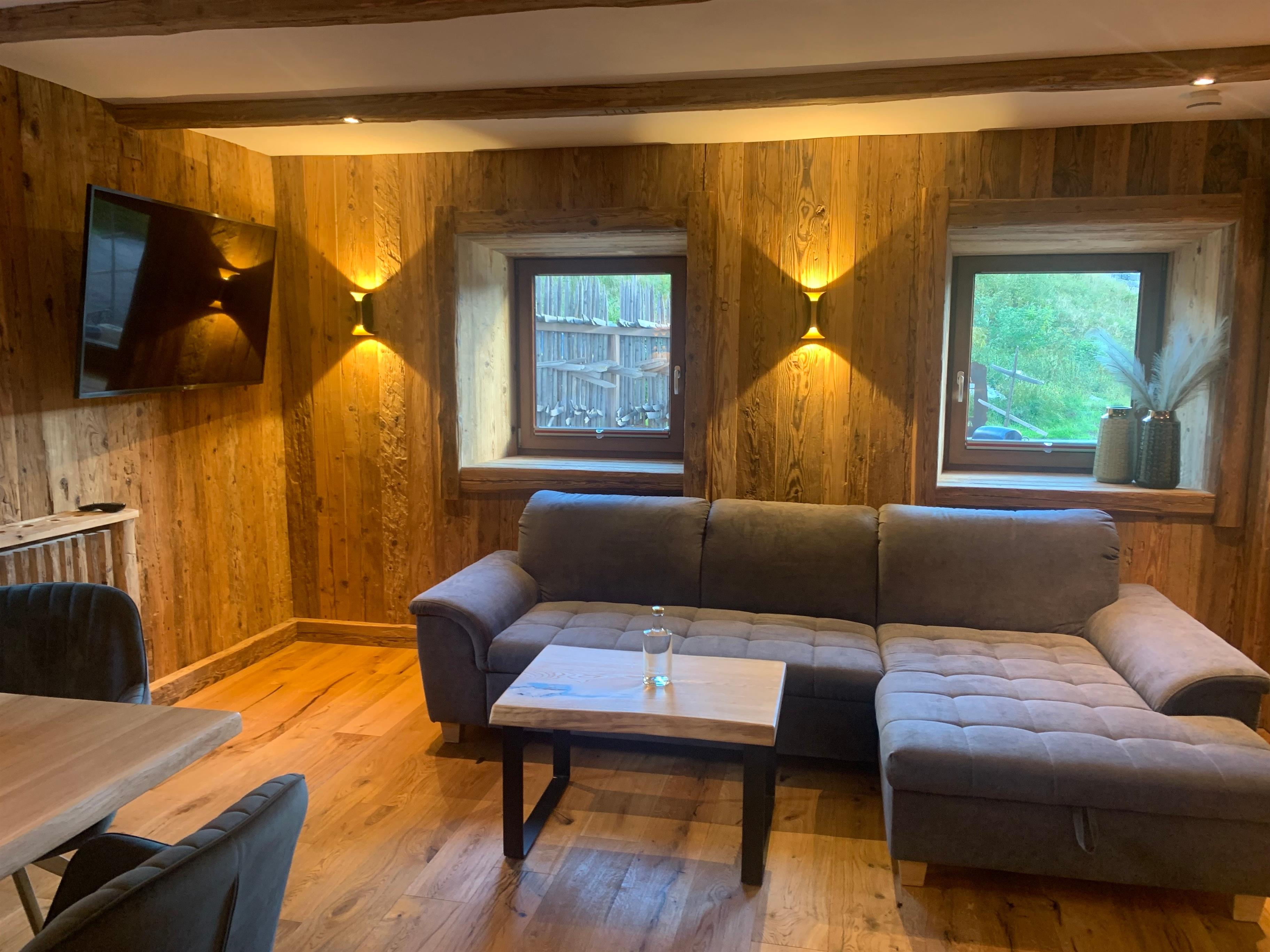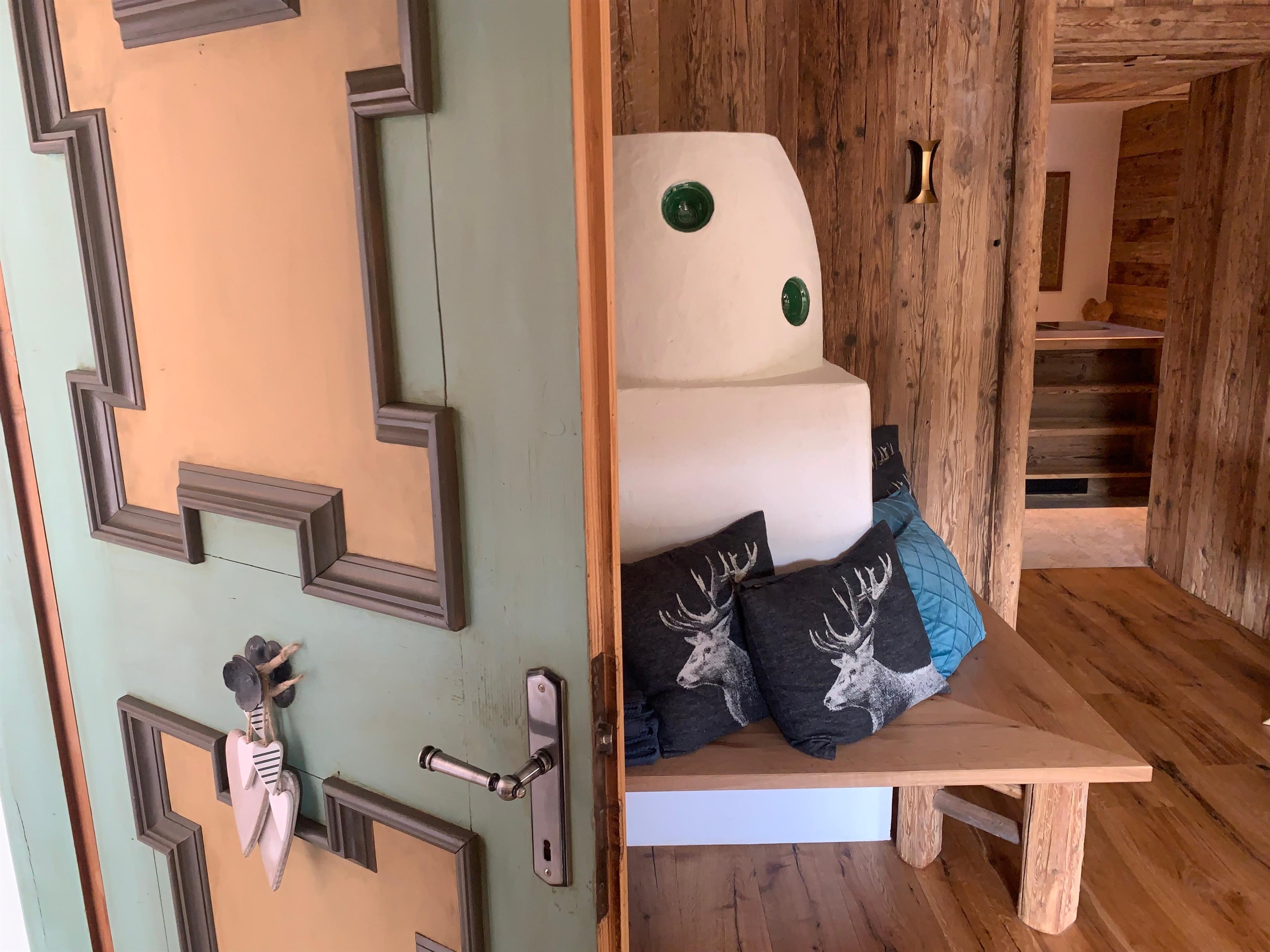 Es befindet sich im Parterre mit Blick auf die Berge, mit eigenem Eingang direkt über den Parkplatz und den Garten, mit eigener Terrasse. Die Wände in Altholz, Steinmauern, moderner Hüttenstyle, gemütliches Lichtkonzept, hochwertige Möbel aus Holz, Wlan.