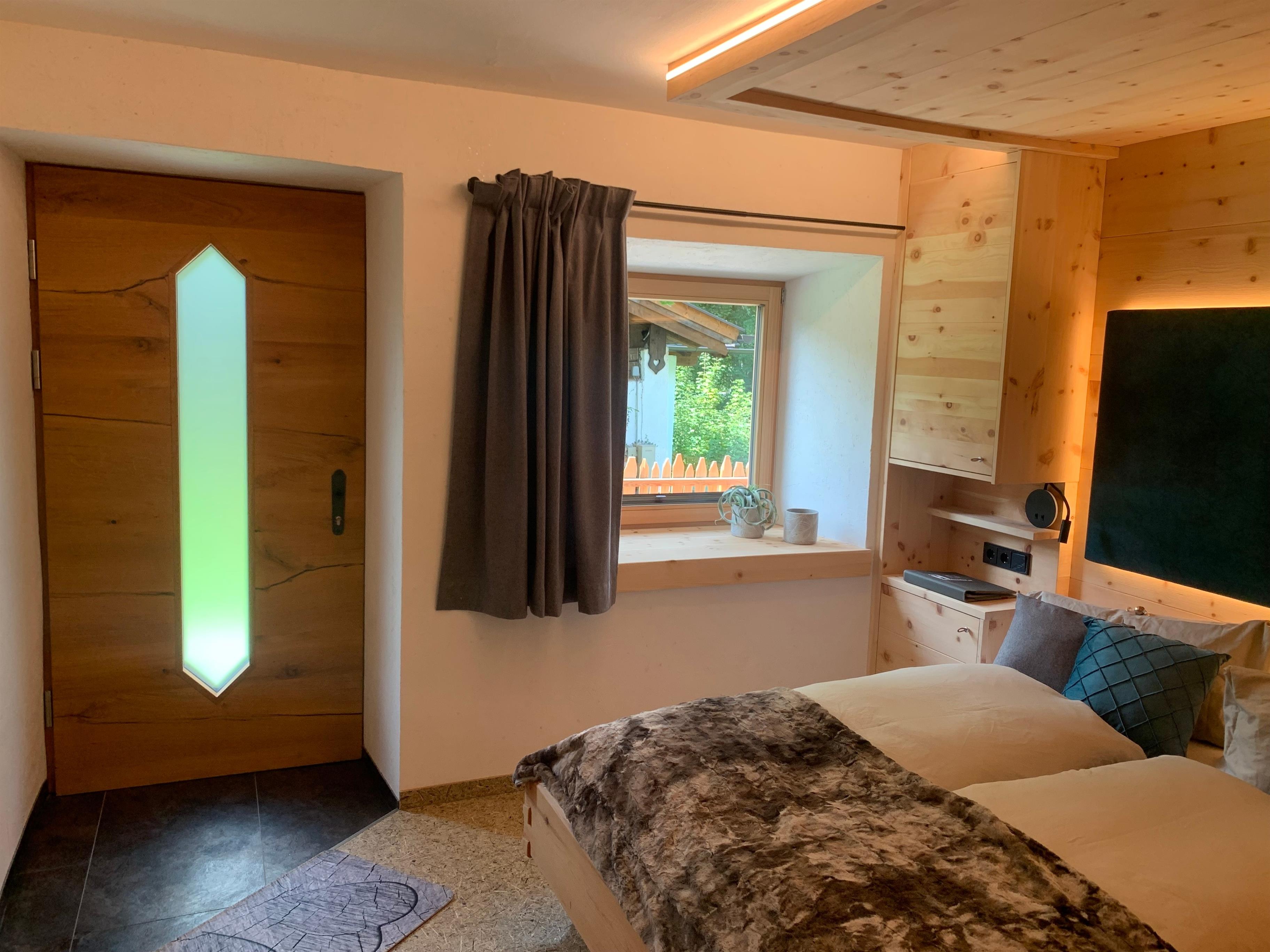 1 Separates Schlafzimmer ein Traum aus Zirbe mit Flat-TV, Safe und eigenem Eingang über den Garten, mit eigenem Badezimmer mit Whirl-Eckbadewanne, Dusche, Föhn, WC, Kosmetikspiegel