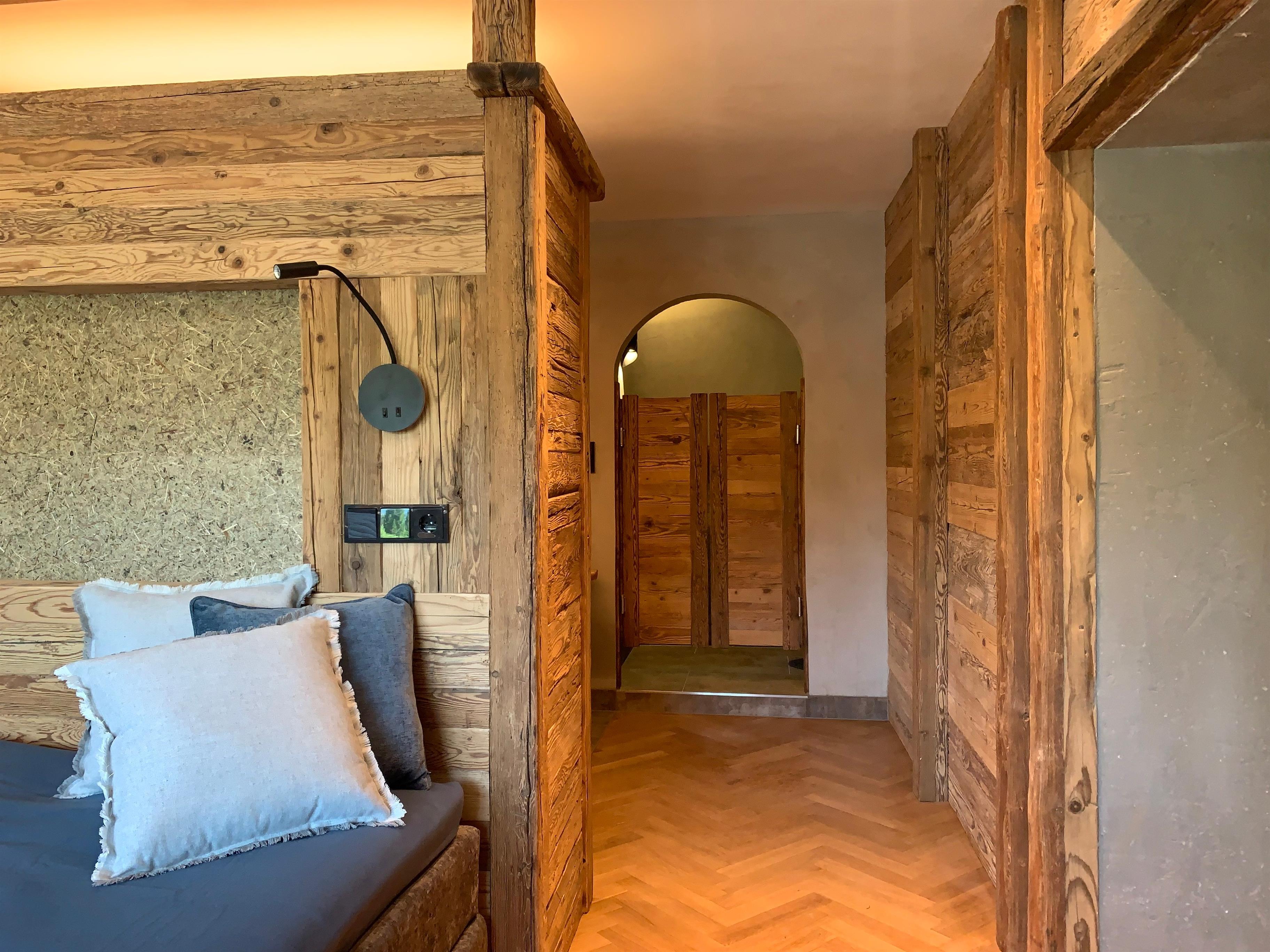 1 Separates Schlafzimmer ein Traum aus Altholz mit Flat-TV, Safe und eigenem offenen Badezimmer mit offener Dusche, Föhn, WC, Kosmetikspiegel.