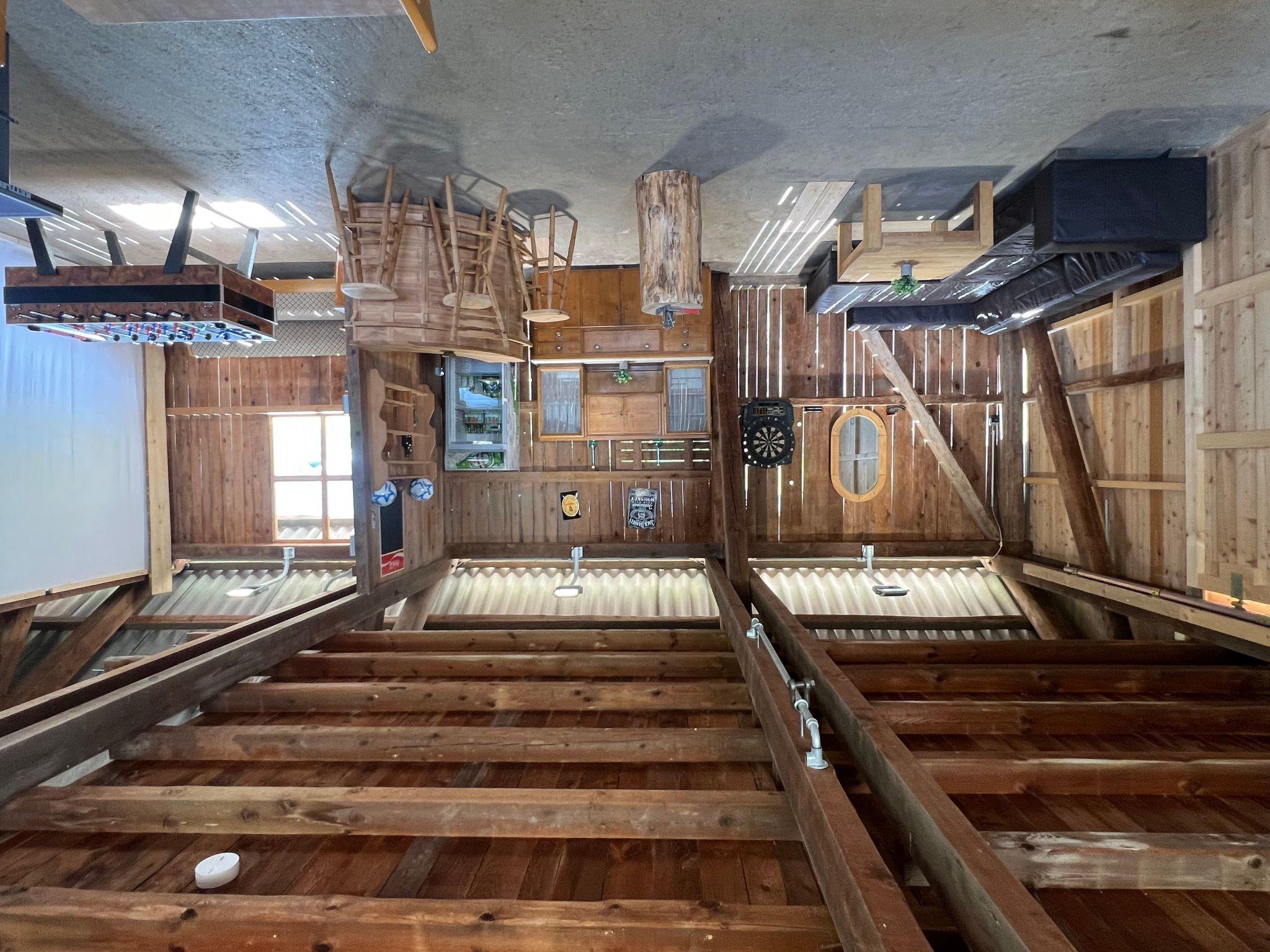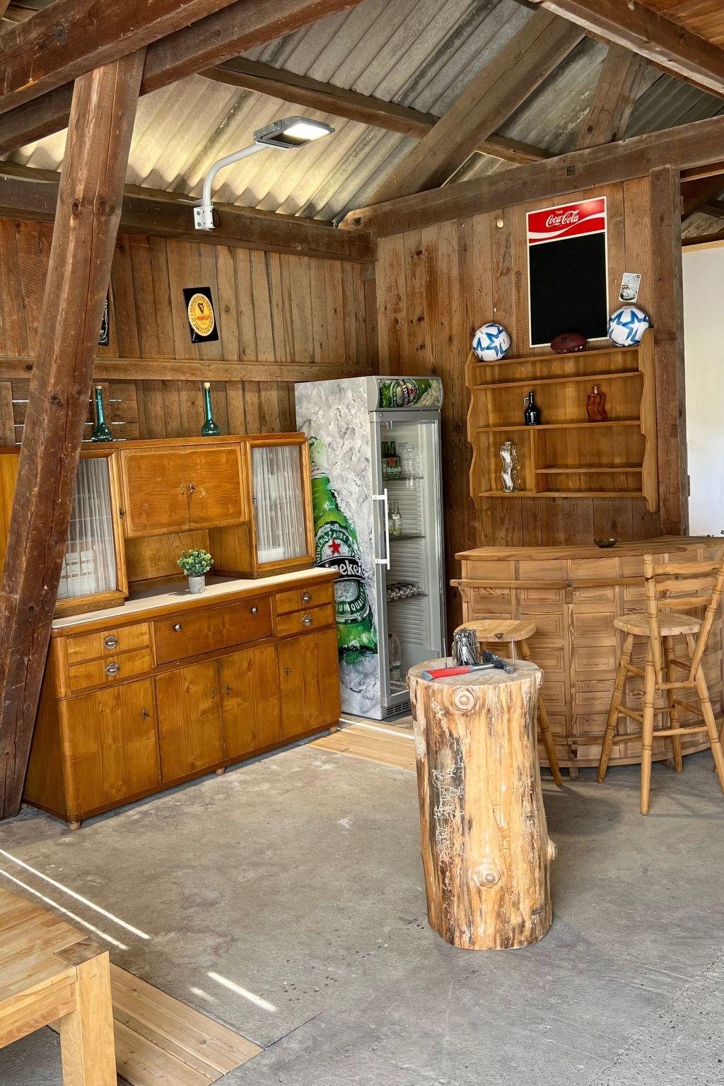 - barn with seating, bar, TV and a darts game as well as a nail tree trunk