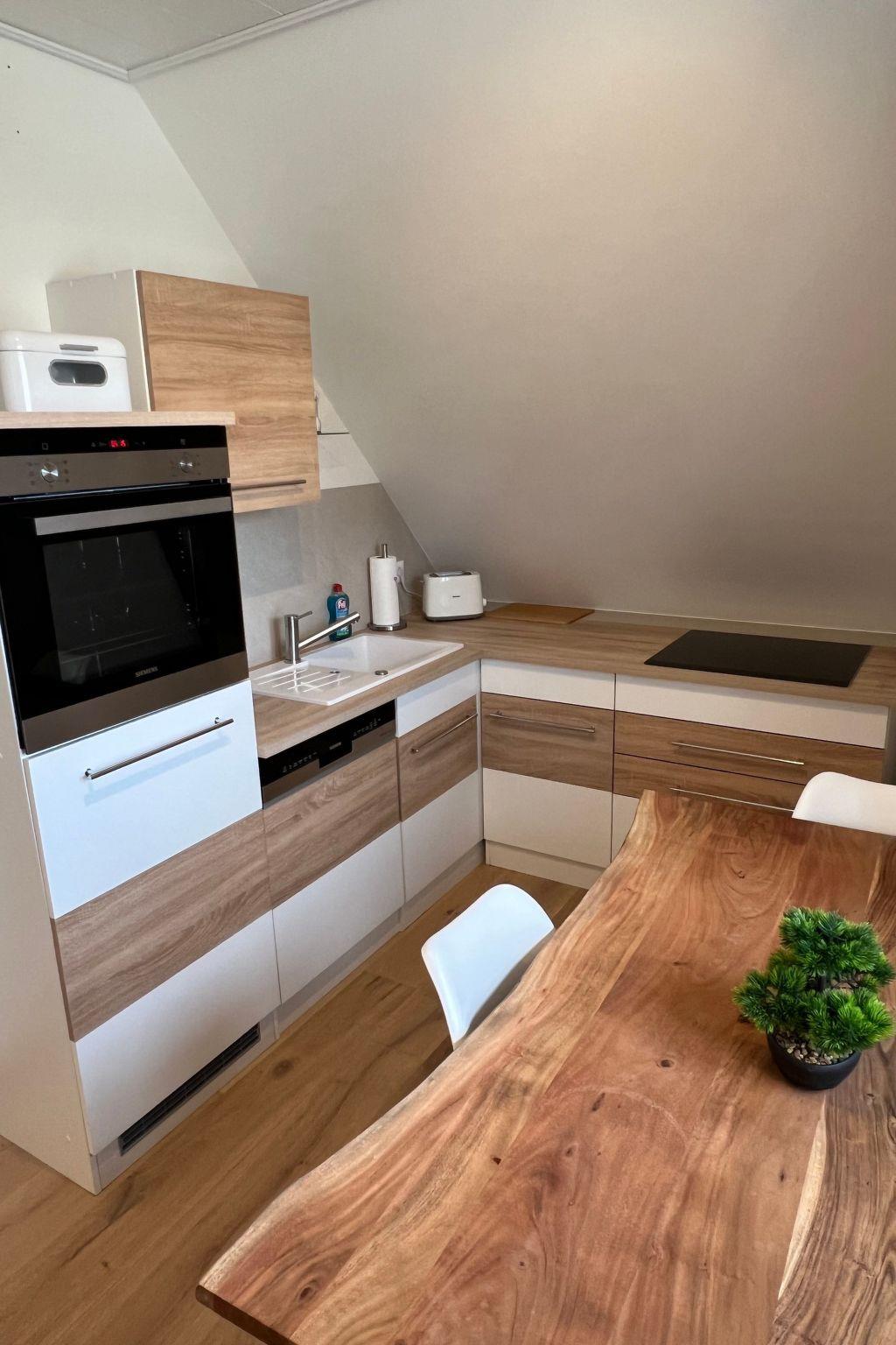 Our two flats are newly renovated and have a spacious bathroom with toilet and shower, as well as a kitchen with living room and a double bed with comfortable Emma mattresses for a good night's sleep.