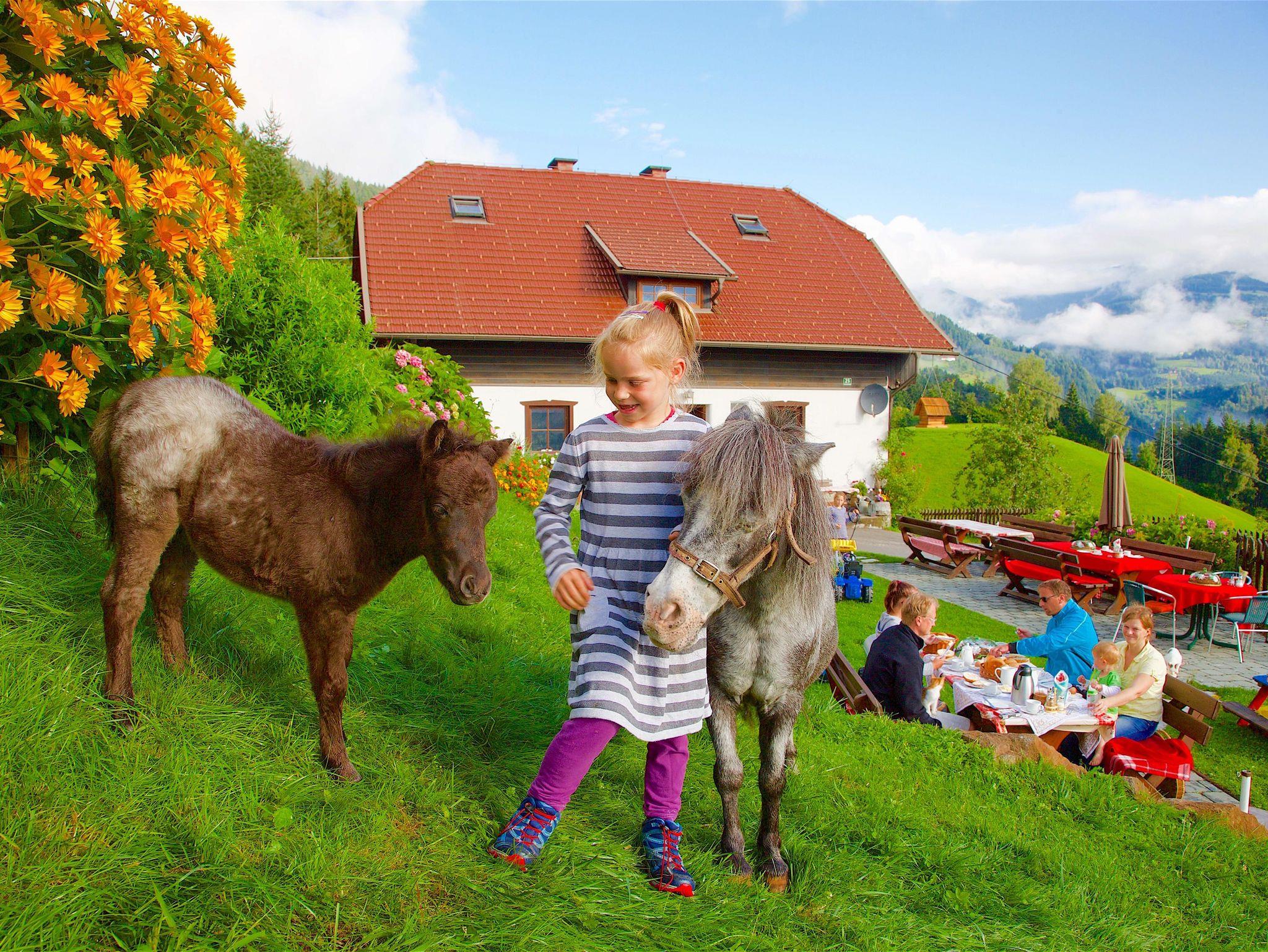 Zwischen Kühen, Katzen, Hasen und Streichelponys unser frisch gebackenes Bauernbrot holen und auf der Sonnenterrasse