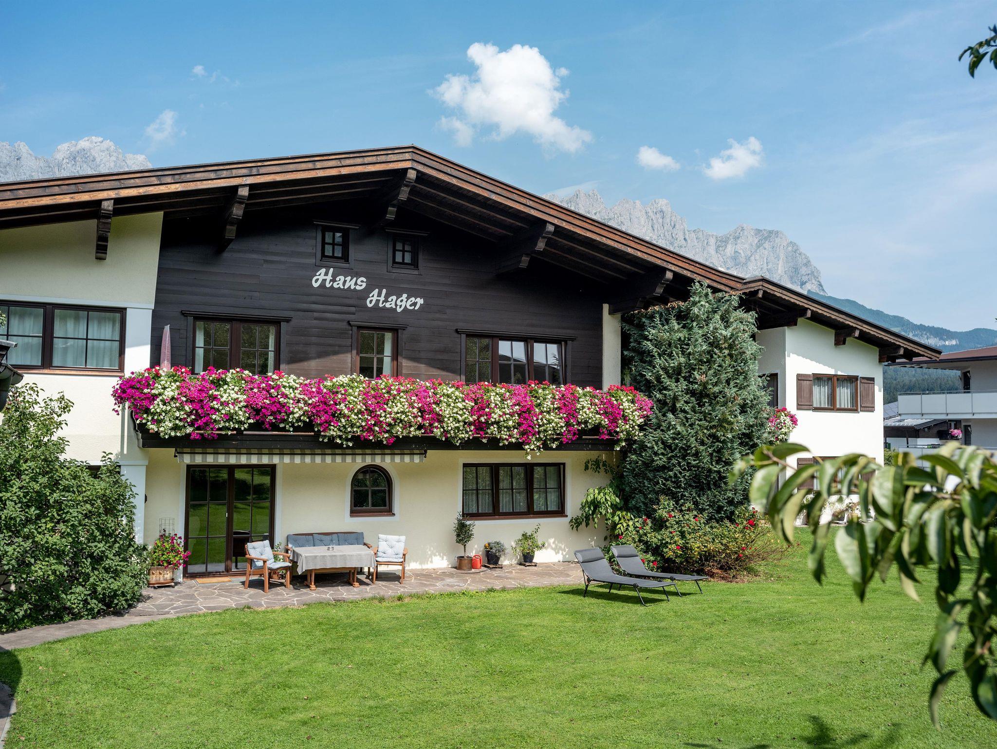 Genießen Sie den schönen Ausblick auf den Wilden Kaiser und den großen Garten, der allen Gästen des Hauses zur Verfügung steht.