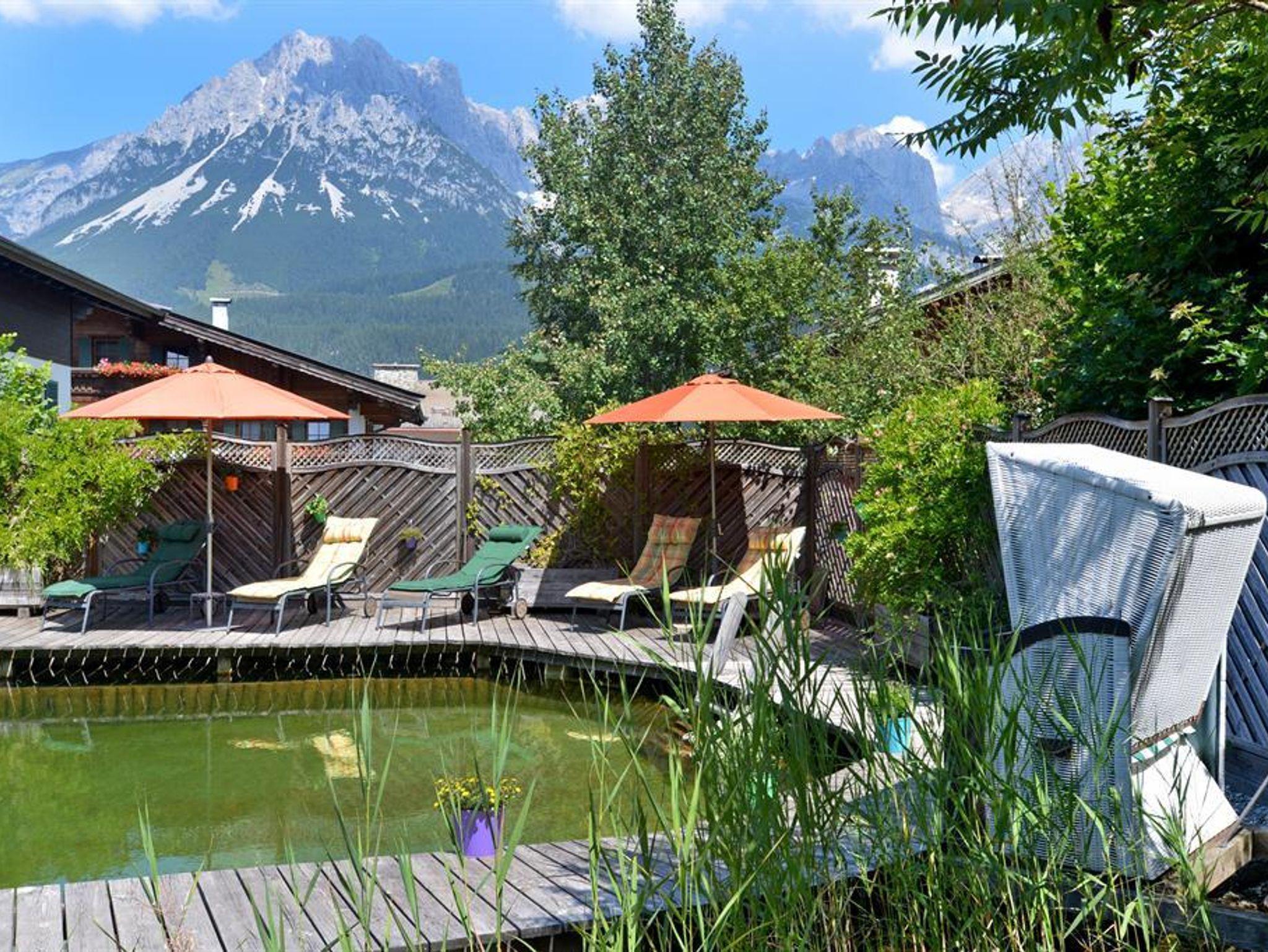 Zum Entspannen bieten wir Ihnen einen blühenden Garten mit Schwimmteich, sonniger Liegewiese und urigem Gartenhäuschen.
