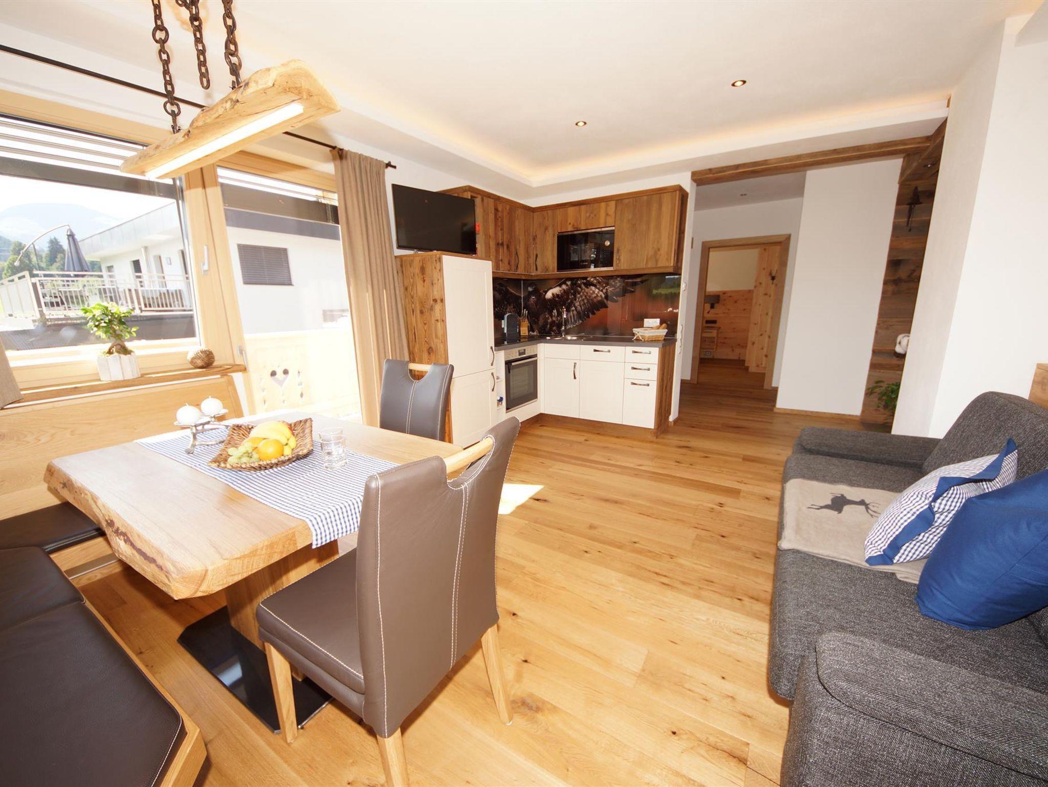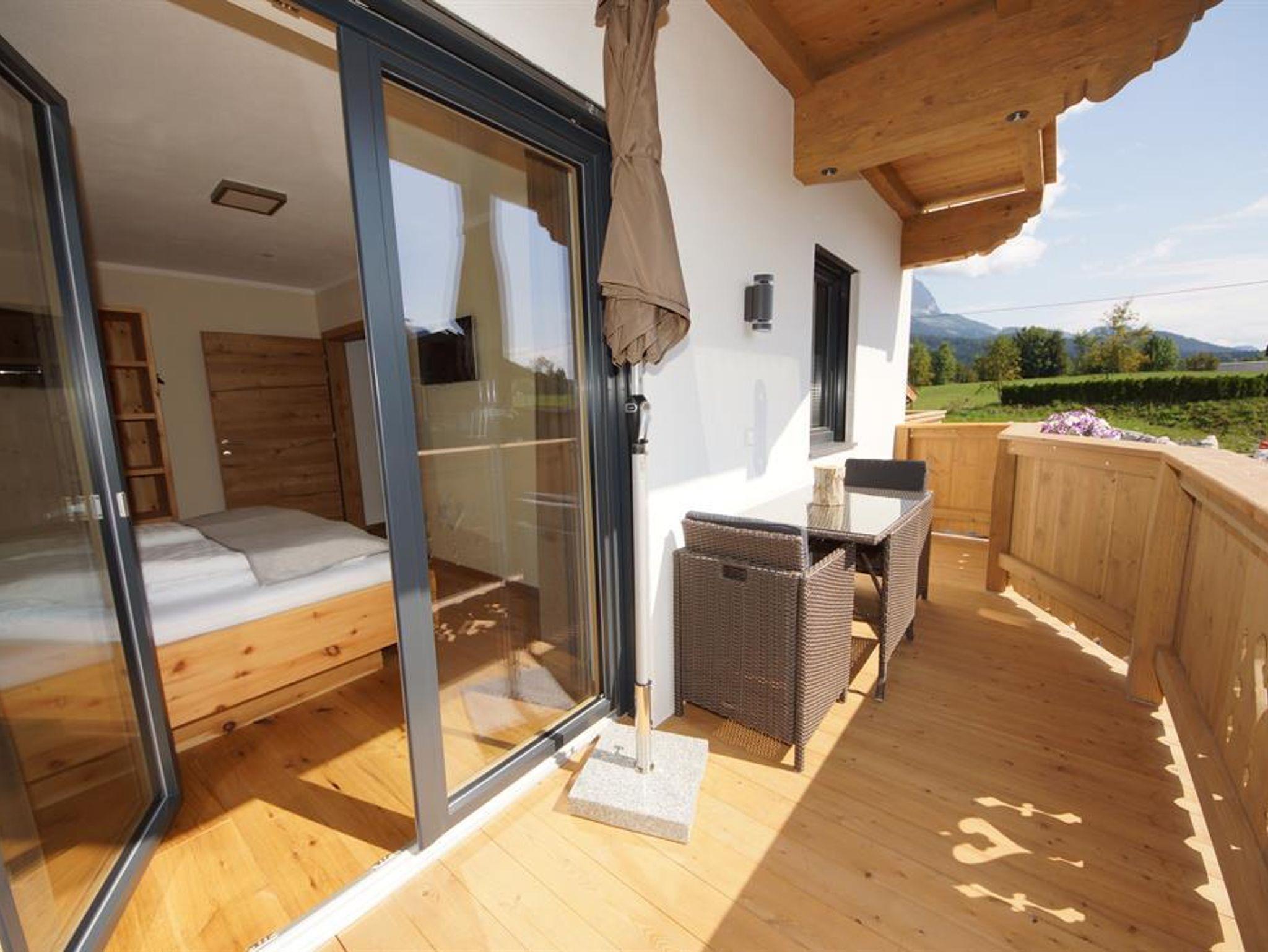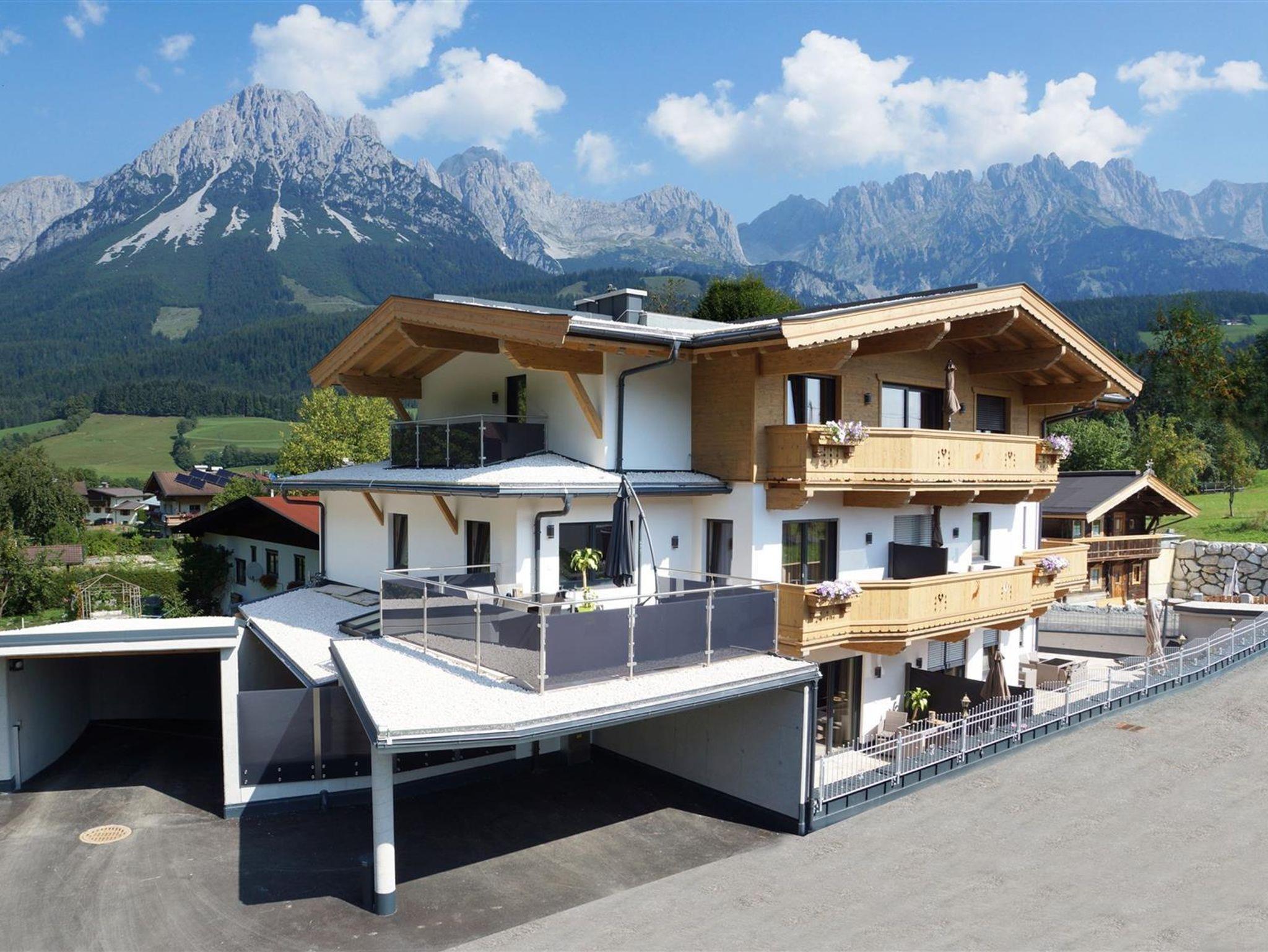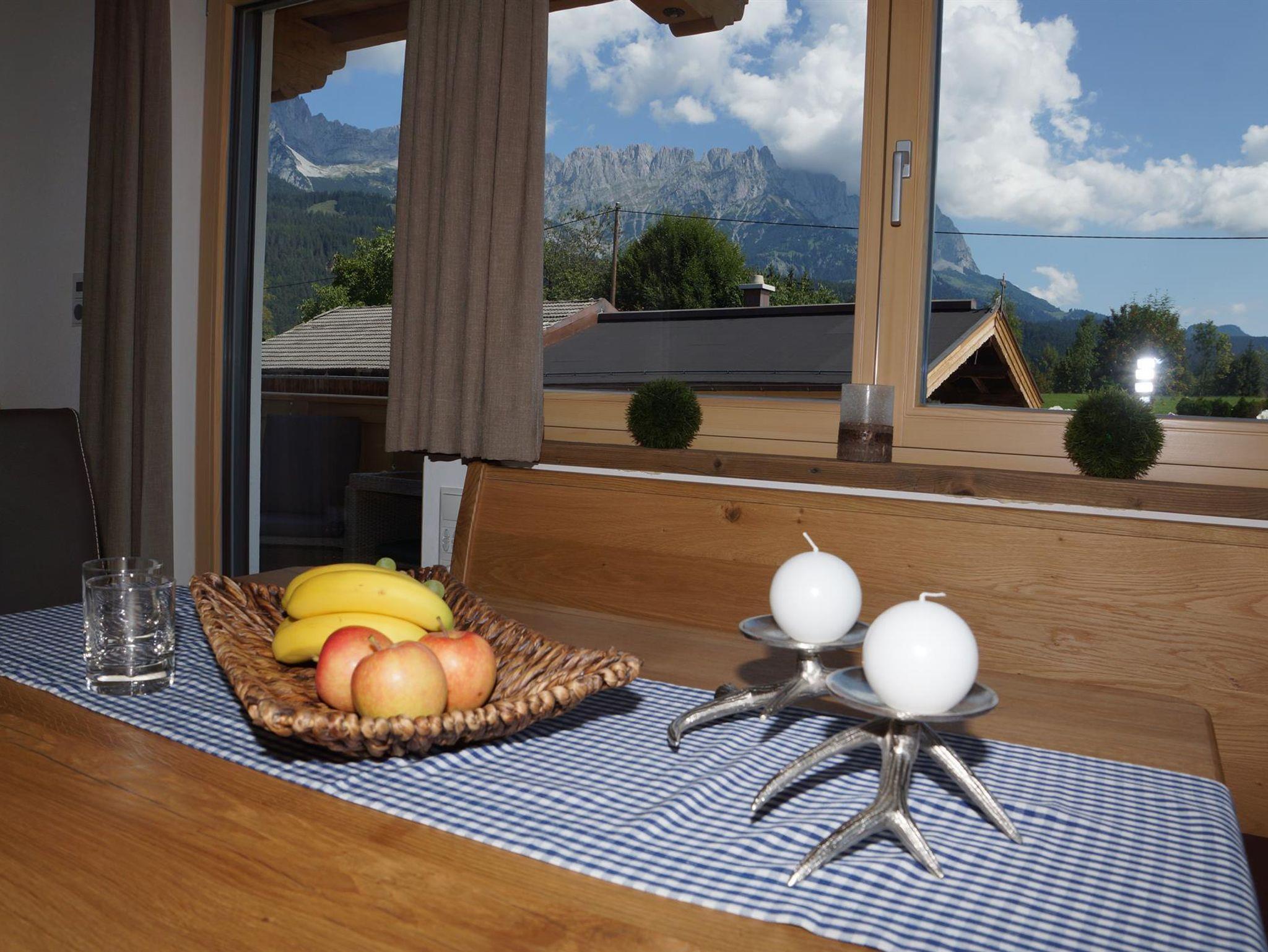 Die Ferienwohnung befindet sich im ersten Stock, wo man einen erstklassigen Blick auf den Wilden Kaiser hat. Der Wohnraum beinhaltet eine vollausgestattete Küche mit Sitzgruppe und eine Couch zum Ausziehen.