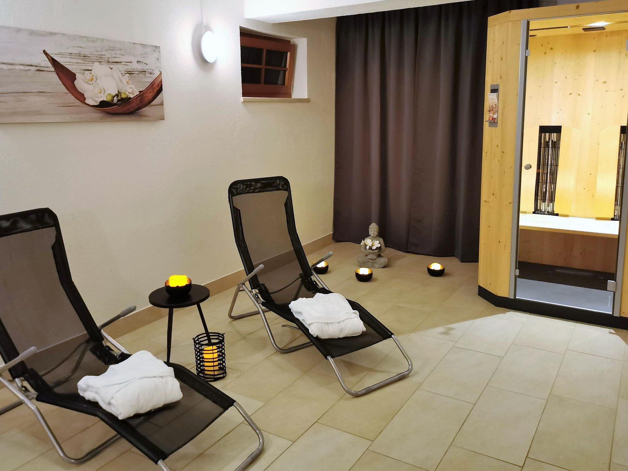 Im Wellnessbereich gibt es eine finnische Sauna, eine Infrarotkabine und eine große Dusche. Ein kleiner Ruhebereich mit Liegen rundet das Wellnessvergnügen ab. Sollten Sie extra Bademäntel und Saunatücher hierfür benötigen, erhalten Sie die gegen einen kleinen Aufpreis im Set.