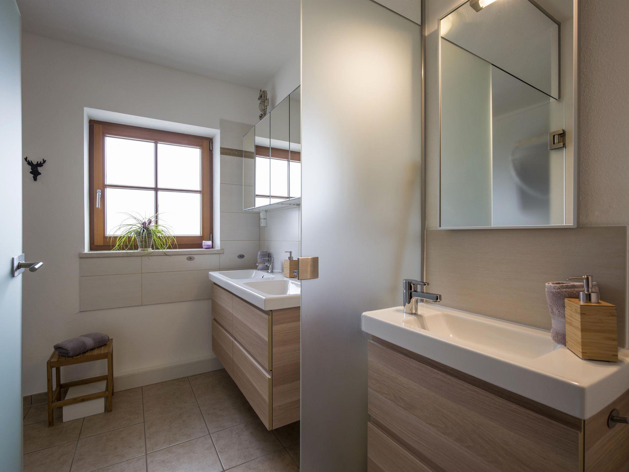 Das geräumige Badezimmer mit Wellness-Dusche und Doppelwaschtisch und viel Stauraum ist getrennt vom WC nutzbar und mit einem Föhn ausgestattet.