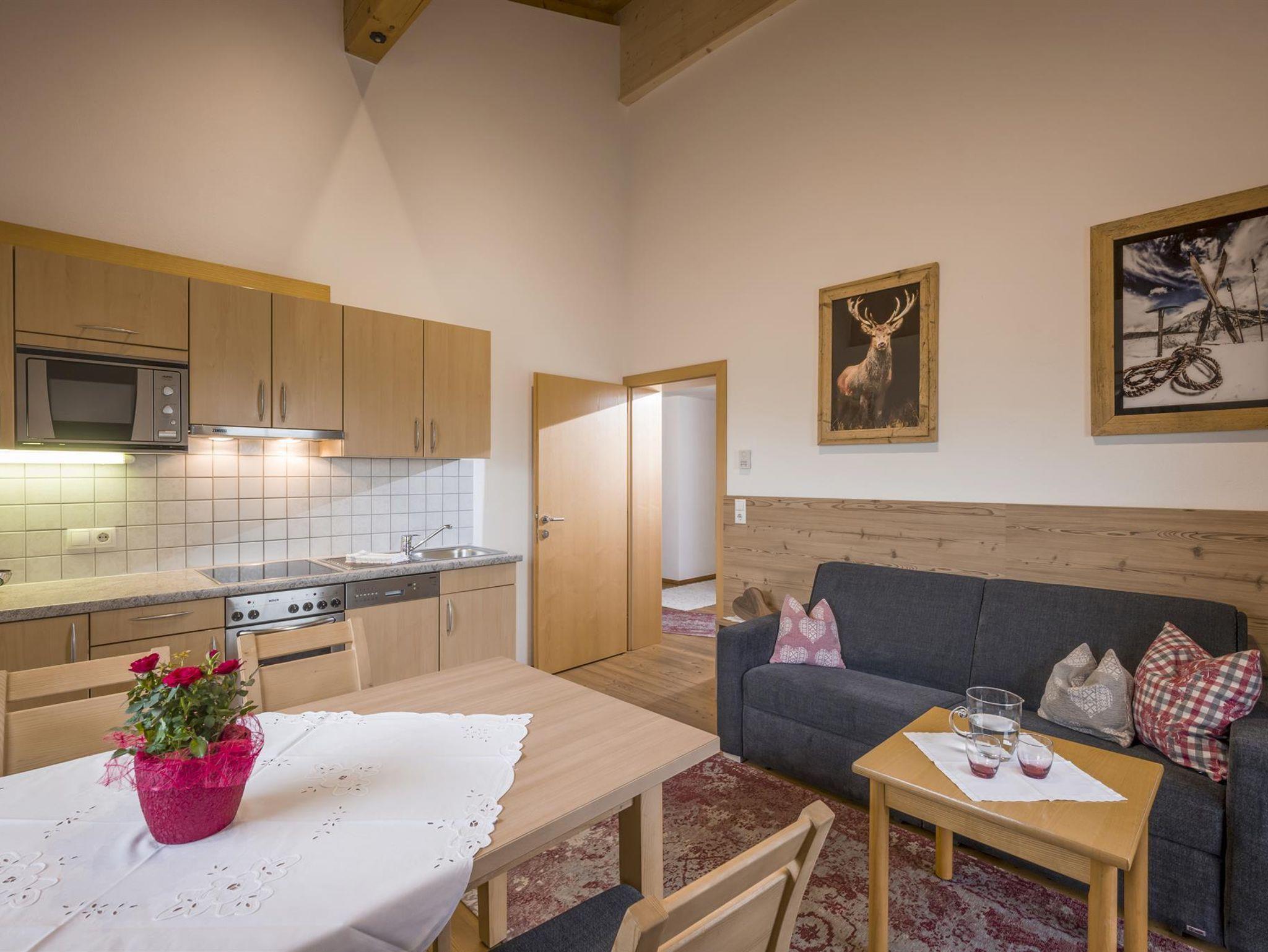 Wohnküche mit gemütlicher Essecke, Mikrowellle, E-Herd, Backofen, Spülmaschine, Kabel-Flat-TV, Radio, CD-Player, Telefon, W-Lan-Internet, Safe, ausziehbarer Doppelbettcouch, Schlafzimmer mit einem geräumigen Schrank und Schreibtisch, Dusche, WC, Handtücher, Bett- und Tischwäsche, Geschirrtücher, Skikeller mit Schuhheizung, Kinderbett und Babystuhl auf Wunsch kostenlos. Alle Wohnungen haben einen bzw. zwei große Balkone und für jedes Appartement steht ein Garagenplatz kostenlos zur Verfügung.