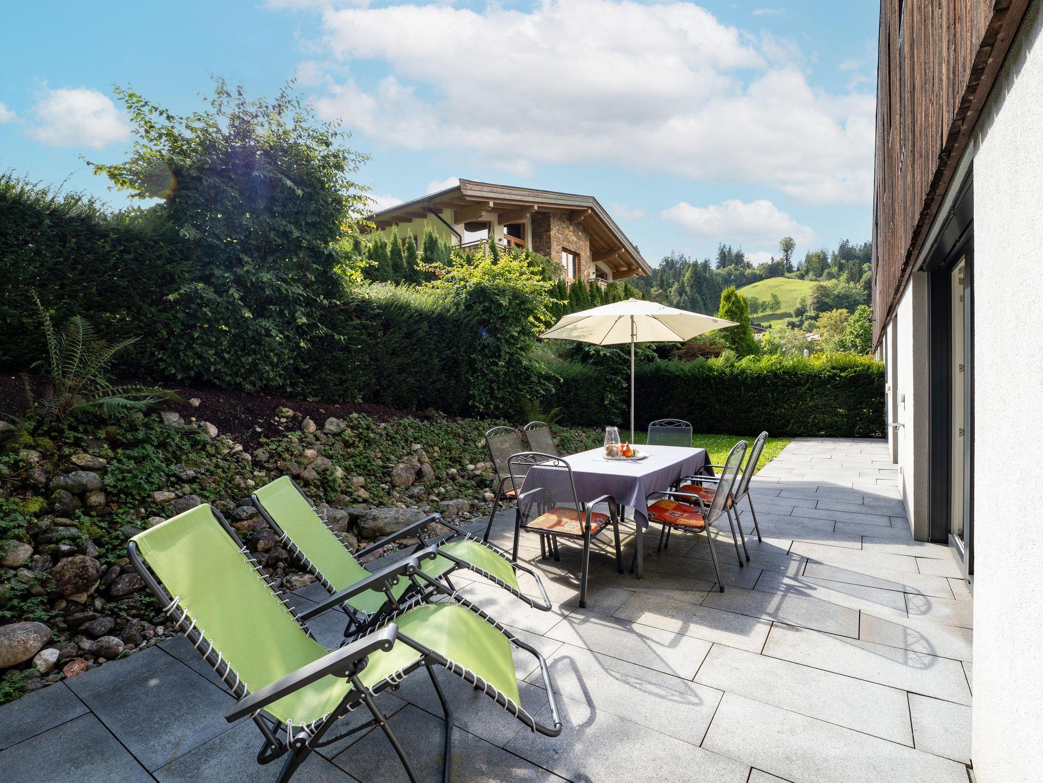 Es liegt in absolut ruhiger Lage zwischen einem Wald und einer großen Wiese in unmittelbarer Nähe der Talstation der Hartkaiserbahn, von hier aus gelangt man in die gesamte Skiwelt Wilder Kaiser.