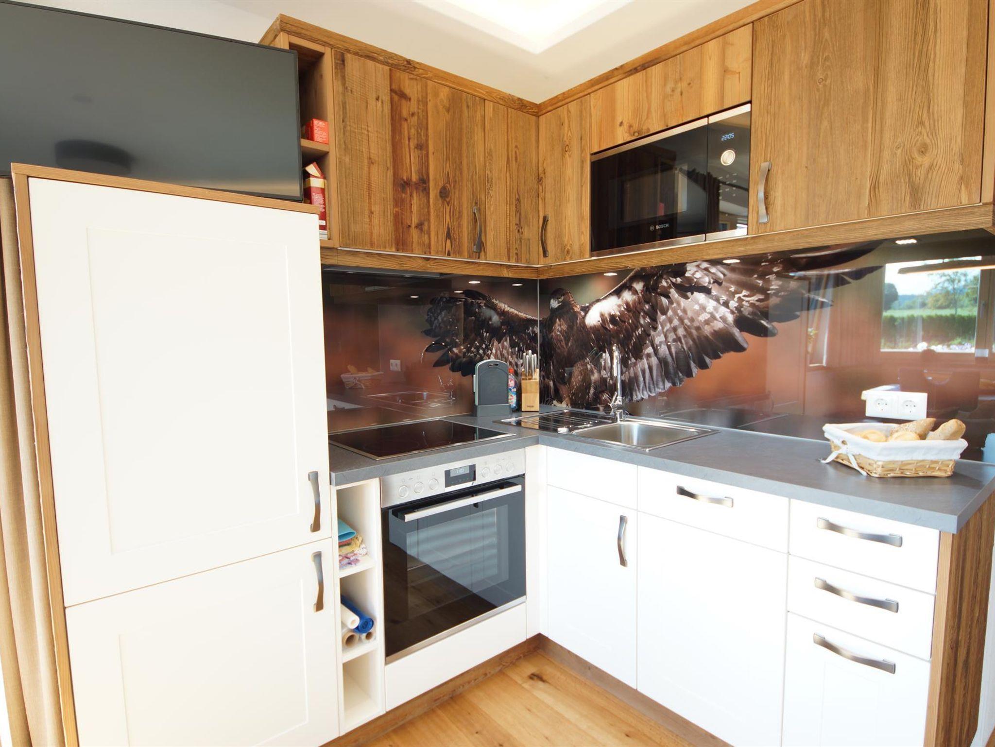 Die Ferienwohnung bietet einen gemütlichen Wohnraum mit voll ausgestatteter Küche, Sitzgruppe, sowie eine ausziehbare Couch.