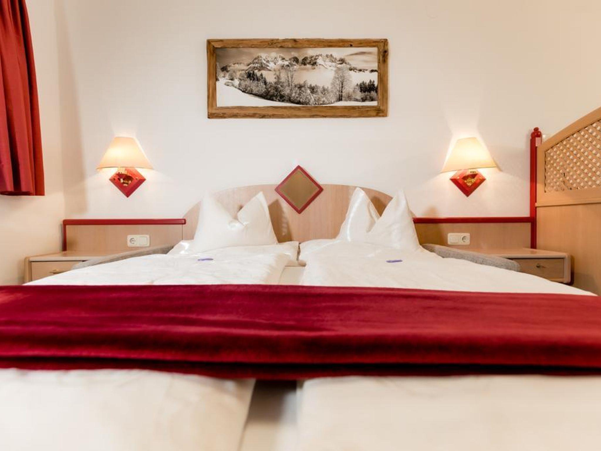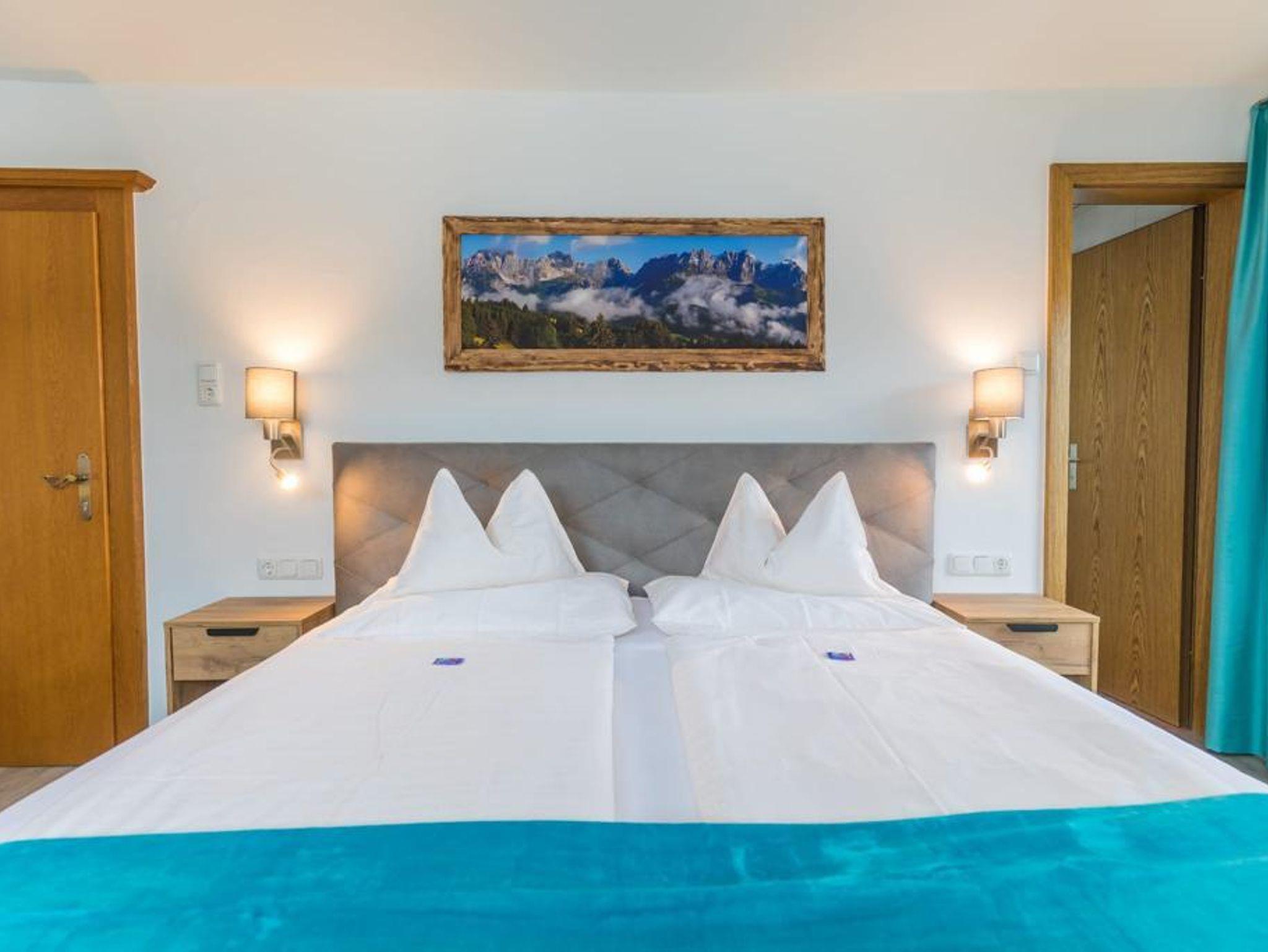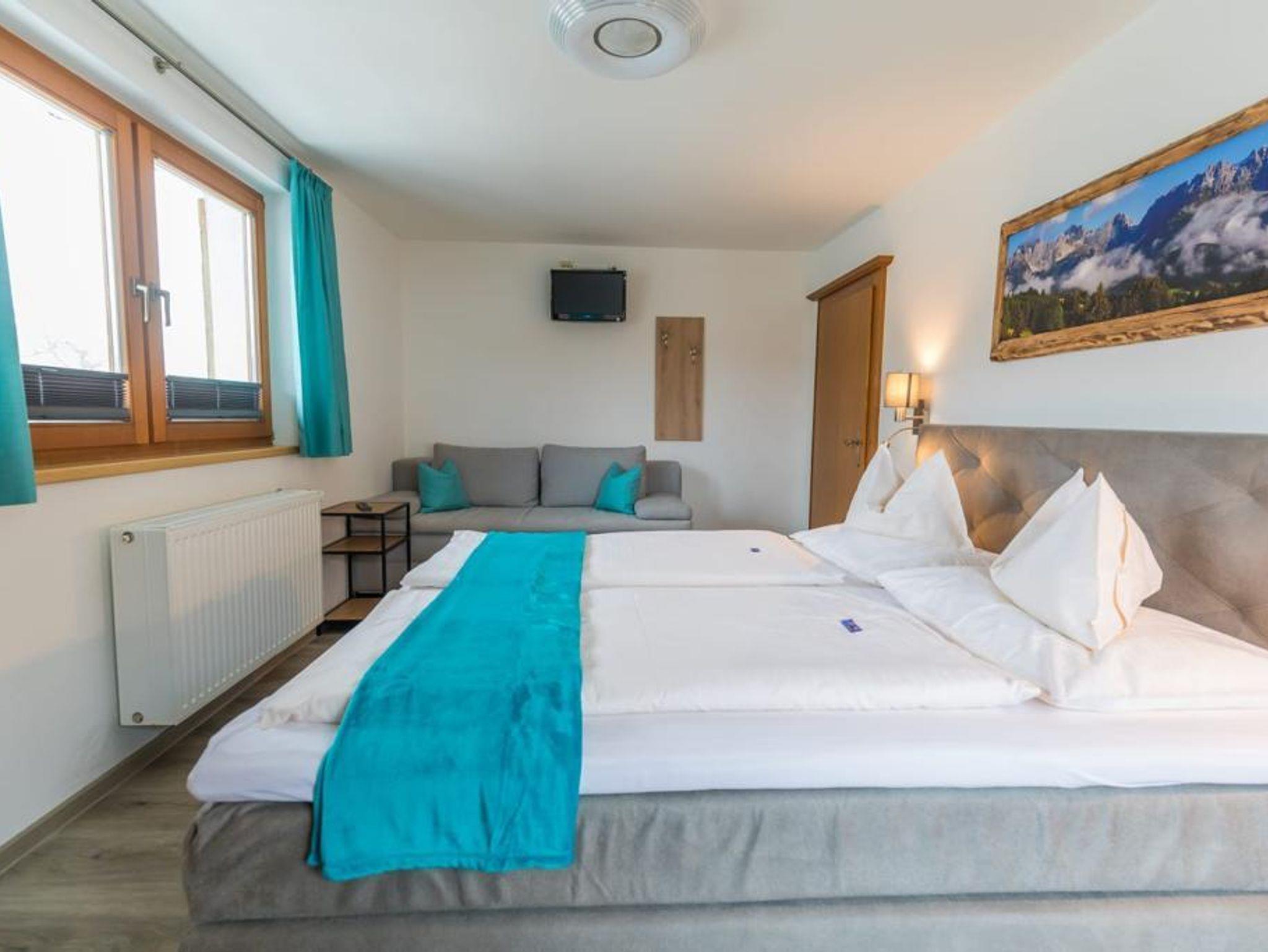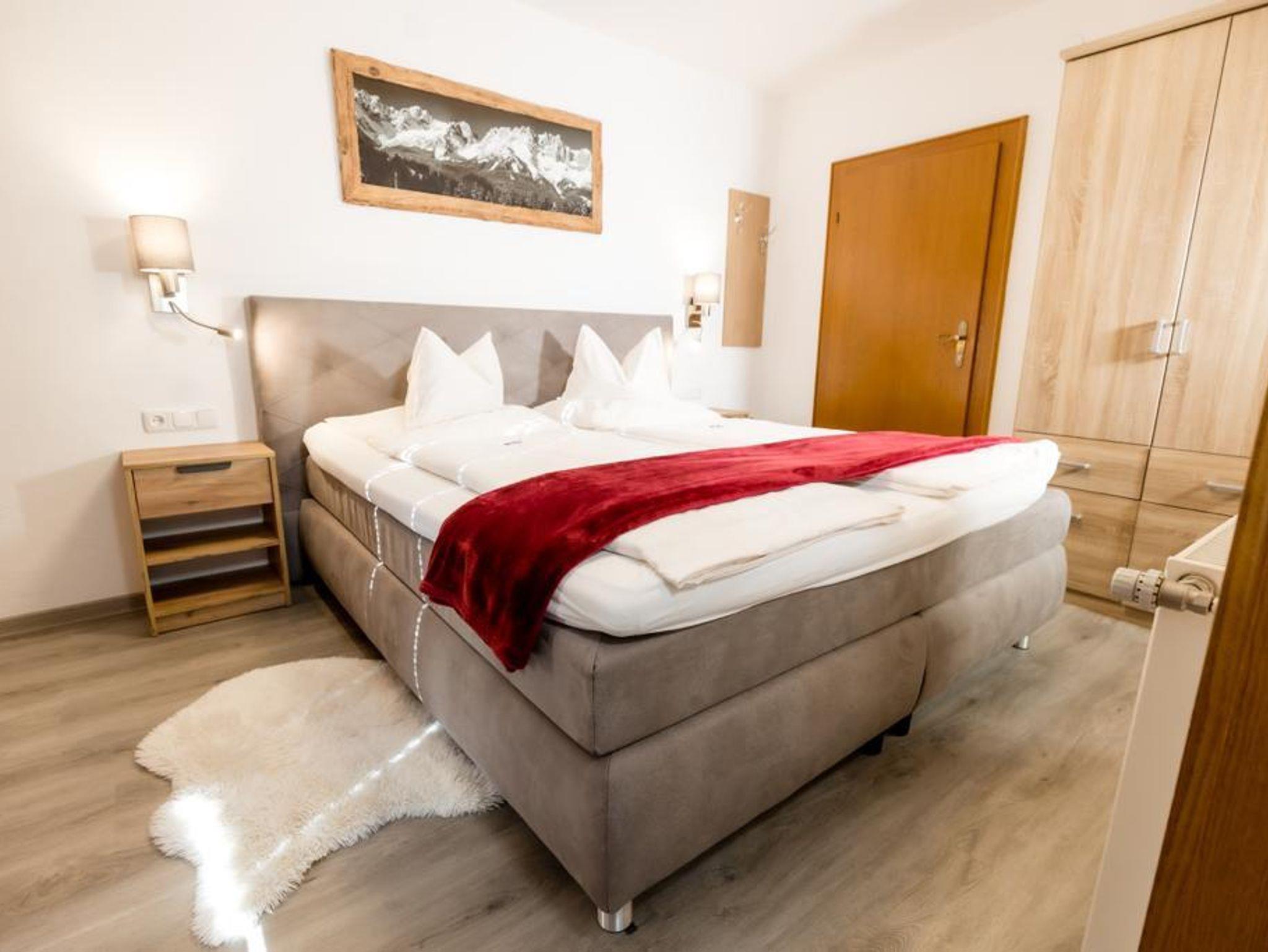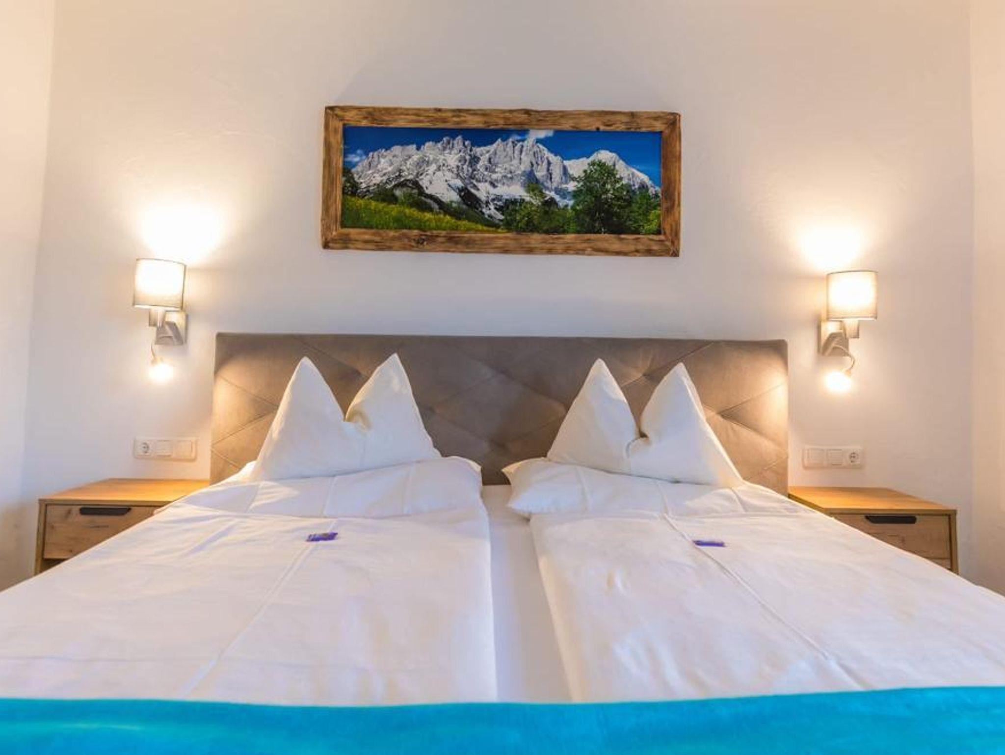 2 Schlafzimmer mit je Dusche, WC, Fön, Flat-TV und eigenem Balkon mit Blick auf den Wilden Kaiser und zur Marienkapelle. Bettwäsche und Handtücher incl.sowie Tischwäsche. Zirka 60m² groß.