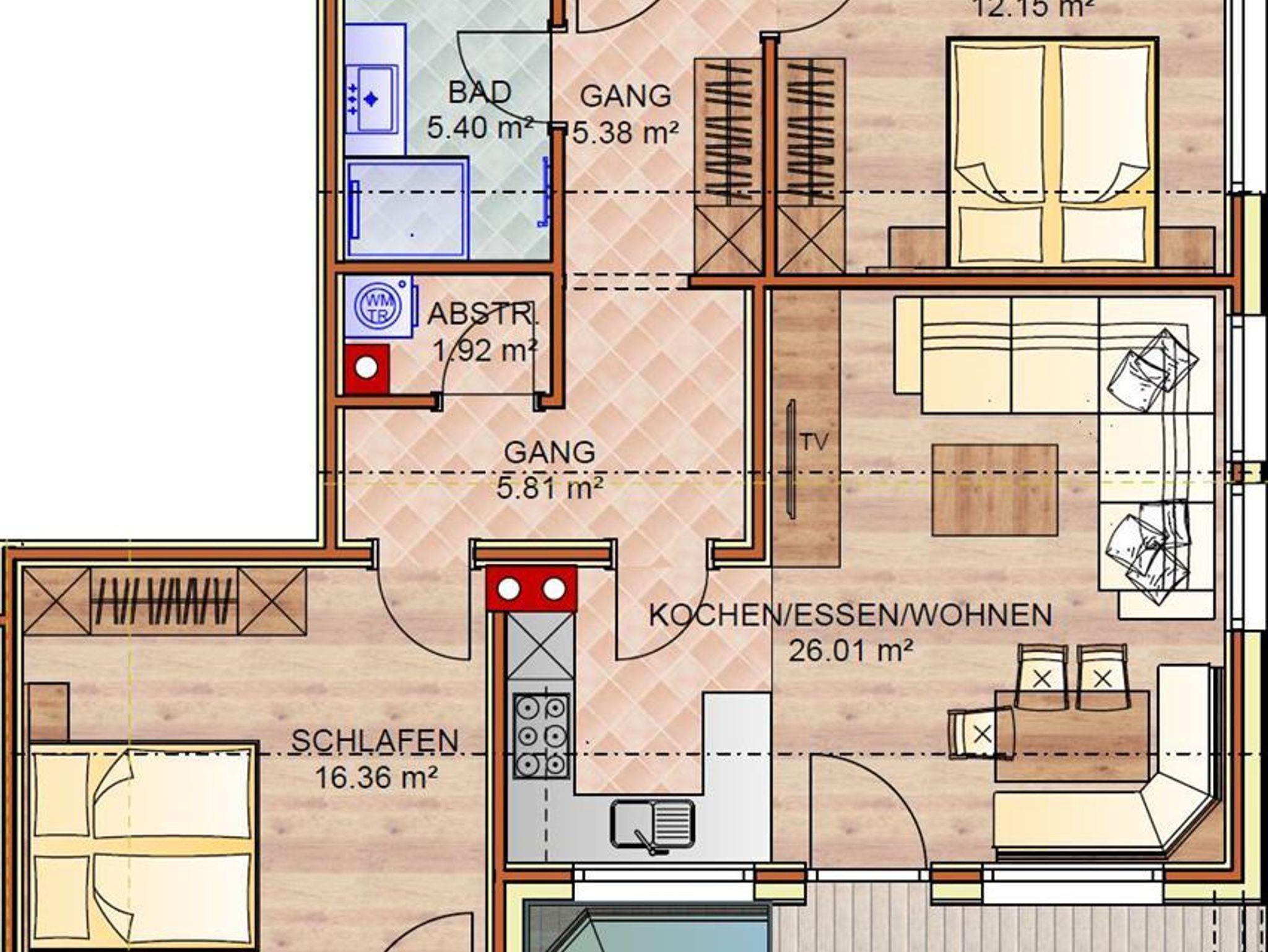 Unser neues Appartement besteht aus einer Küche die zum Wohn- und Essbereich hin offen ist, im Wohnzimmer befindet sich eine Schlafcouch für maximal 2 Personen, zwei große Schlafzimmer mit TV für jeweils zwei Personen und ein schönes Badezimmer mit Dusche und WC.