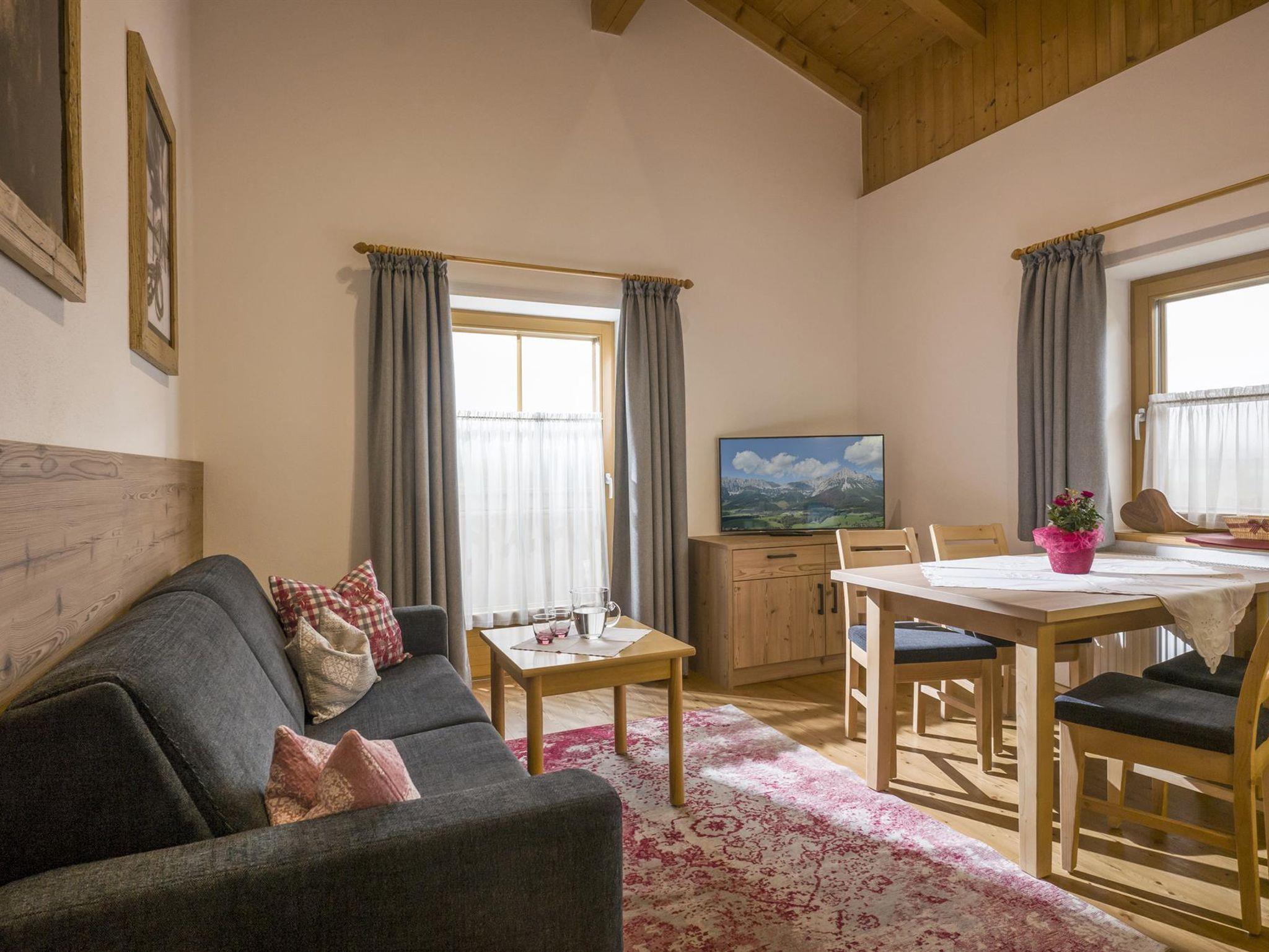 Wohnküche mit gemütlicher Essecke, Mikrowellle, E-Herd, Backofen, Spülmaschine, Kabel-Flat-TV, Radio, CD-Player, Telefon, W-Lan-Internet, Safe, ausziehbarer Doppelbettcouch, Schlafzimmer mit einem geräumigen Schrank und Schreibtisch, Dusche, WC, Handtücher, Bett- und Tischwäsche, Geschirrtücher, Skikeller mit Schuhheizung, Kinderbett und Babystuhl auf Wunsch kostenlos. Alle Wohnungen haben einen bzw. zwei große Balkone und für jedes Appartement steht ein Garagenplatz kostenlos zur Verfügung.