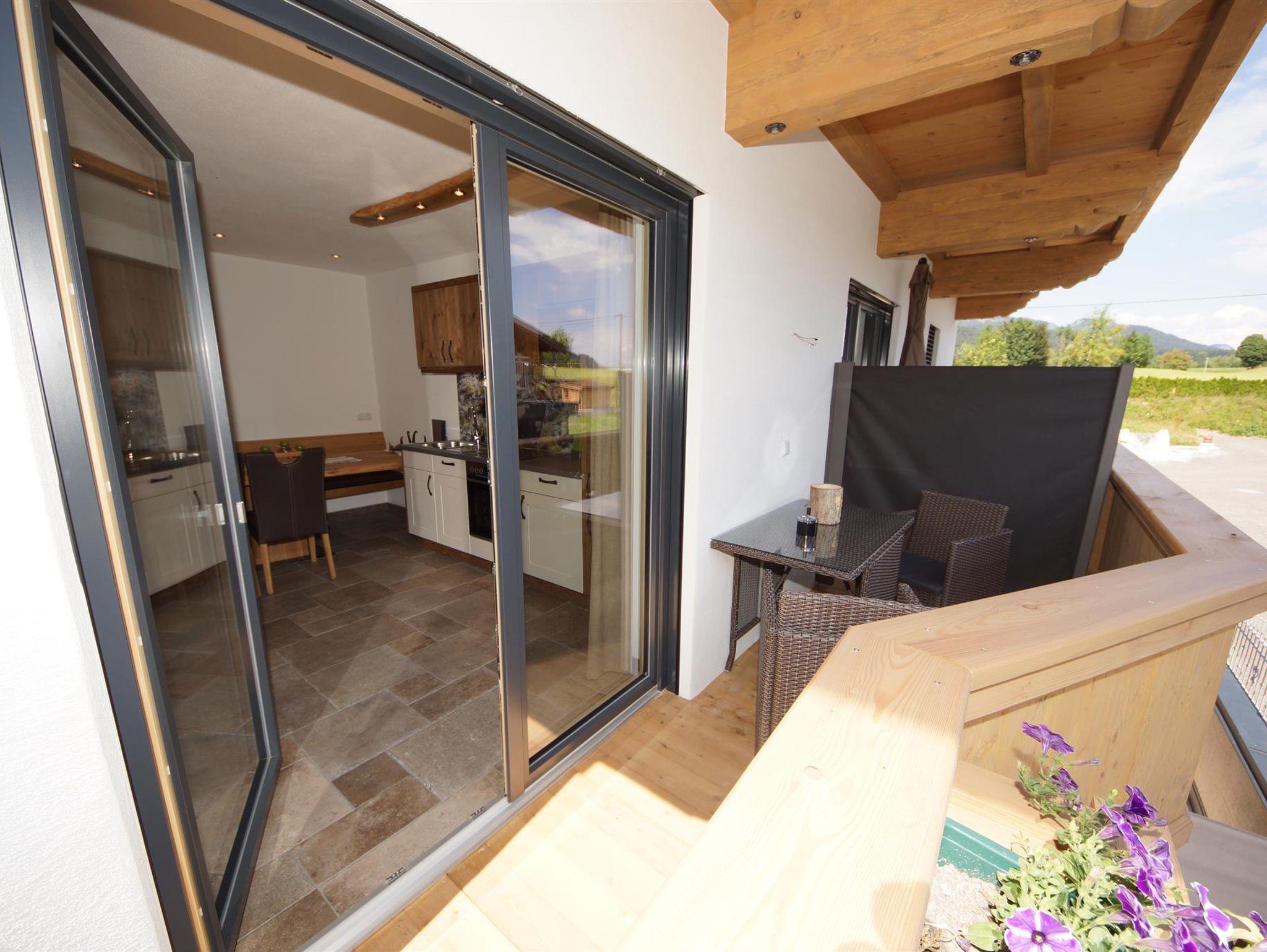 Eine Terrasse mit Blick zum Wilden Kaiser, Kitzbüheler Horn und Hartaiser.