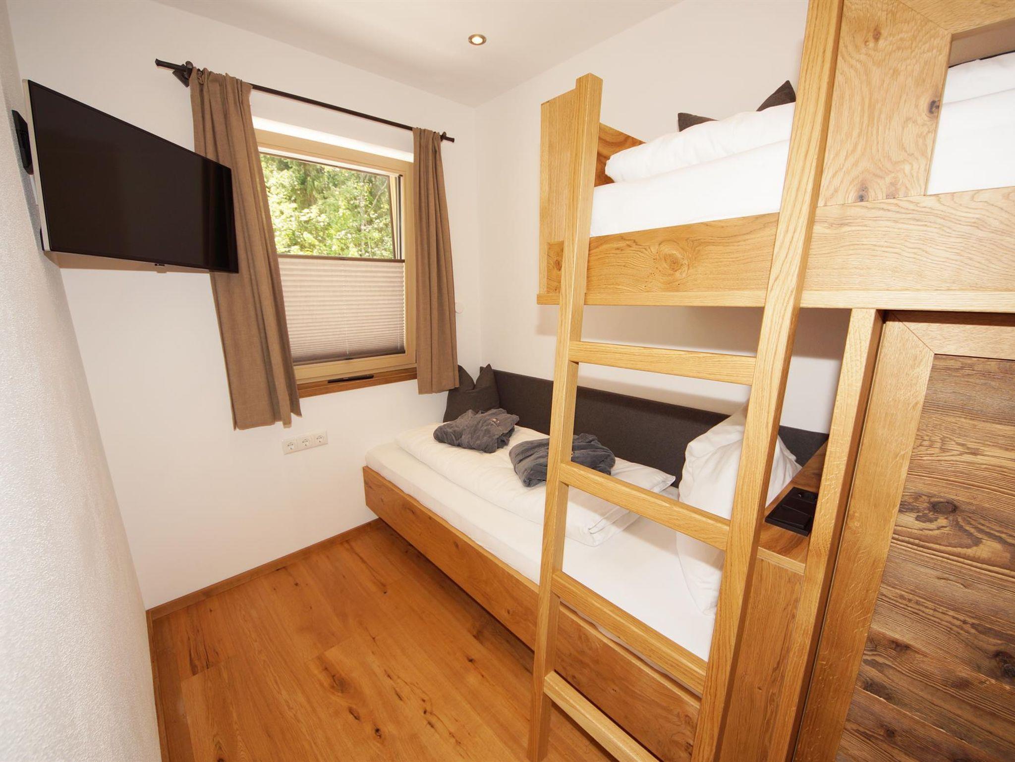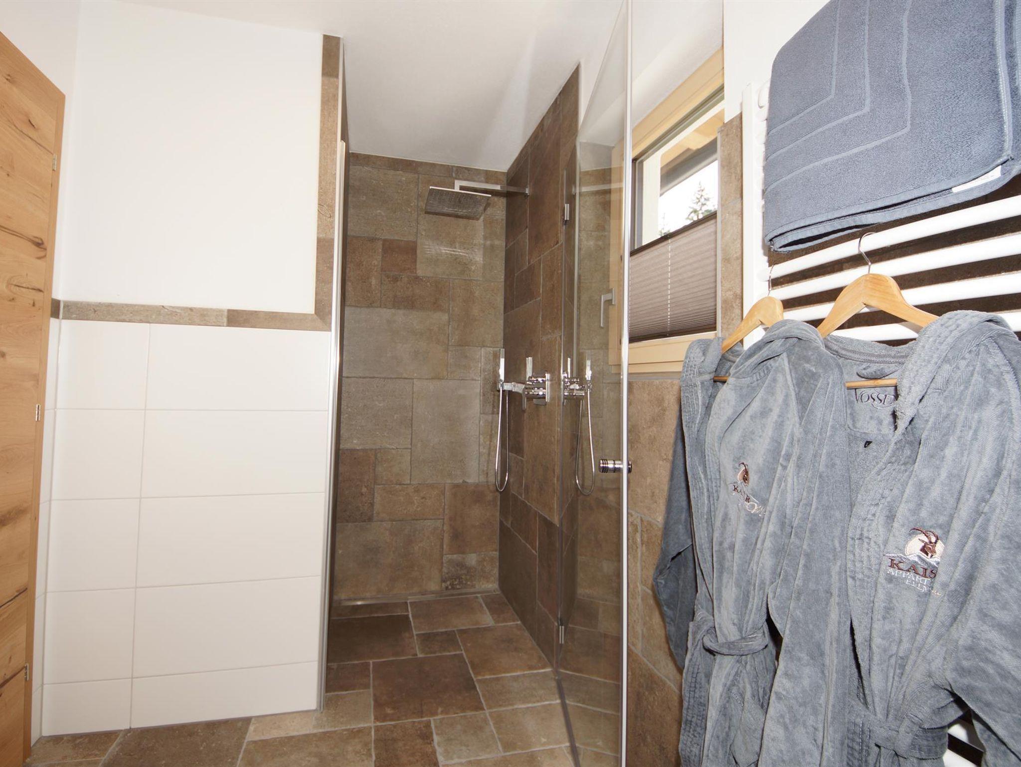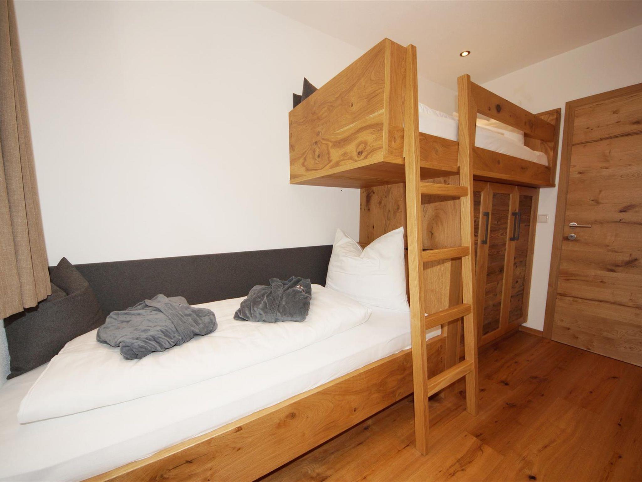 Ein Schlafzimmer mit Blick auf den Wilden Kaiser. Das andere Schlafzimmer hat ein Stockbett, ideal für Kinder. Ein Bad mit Dusche/WC.