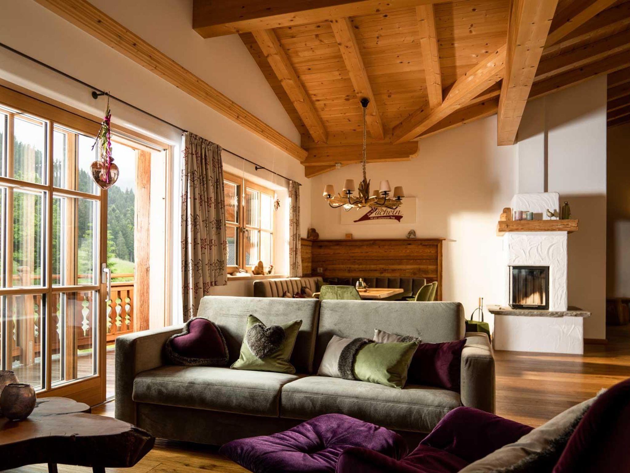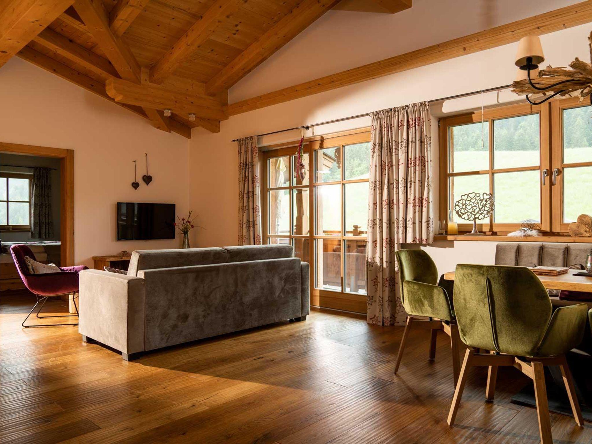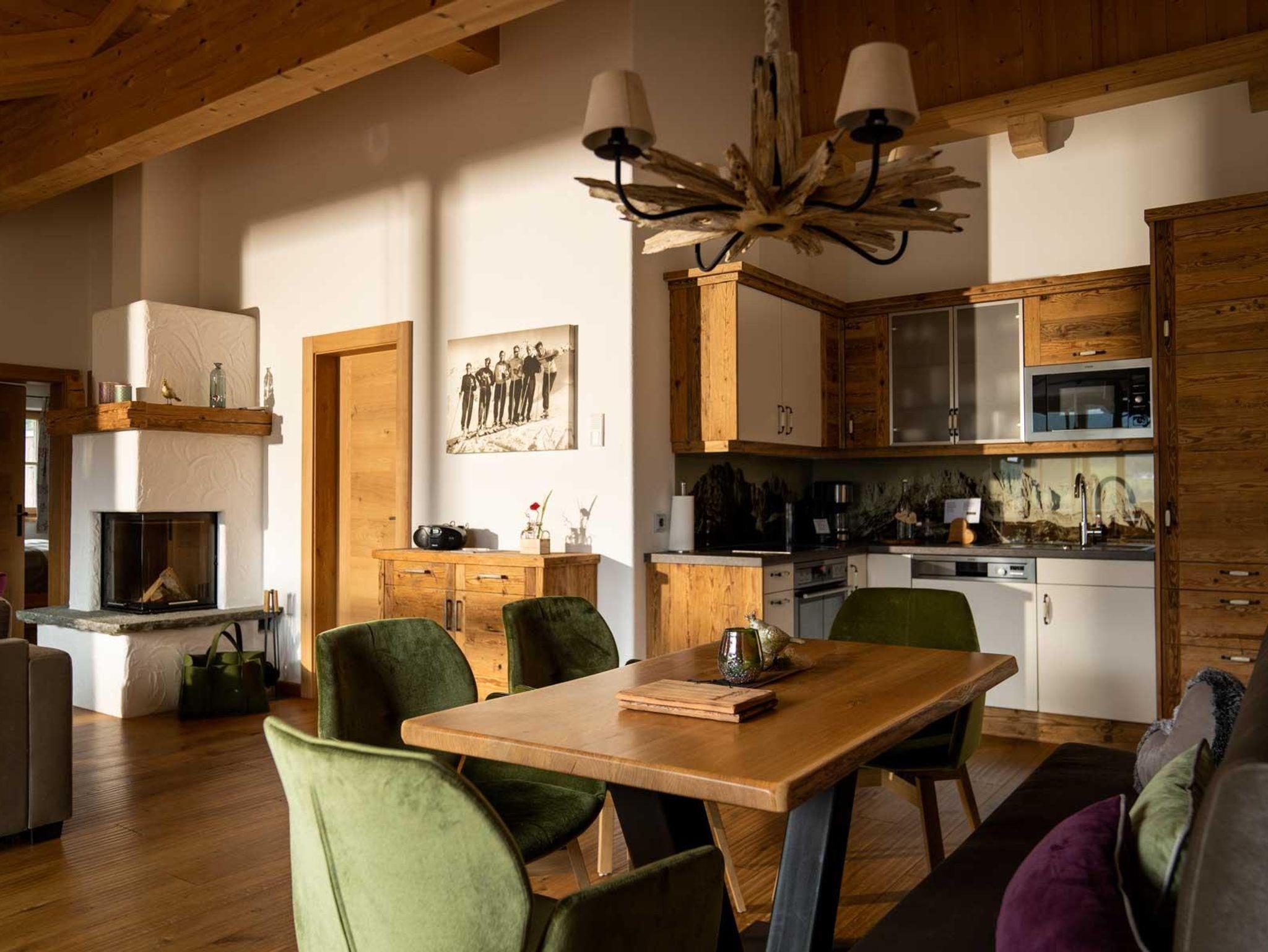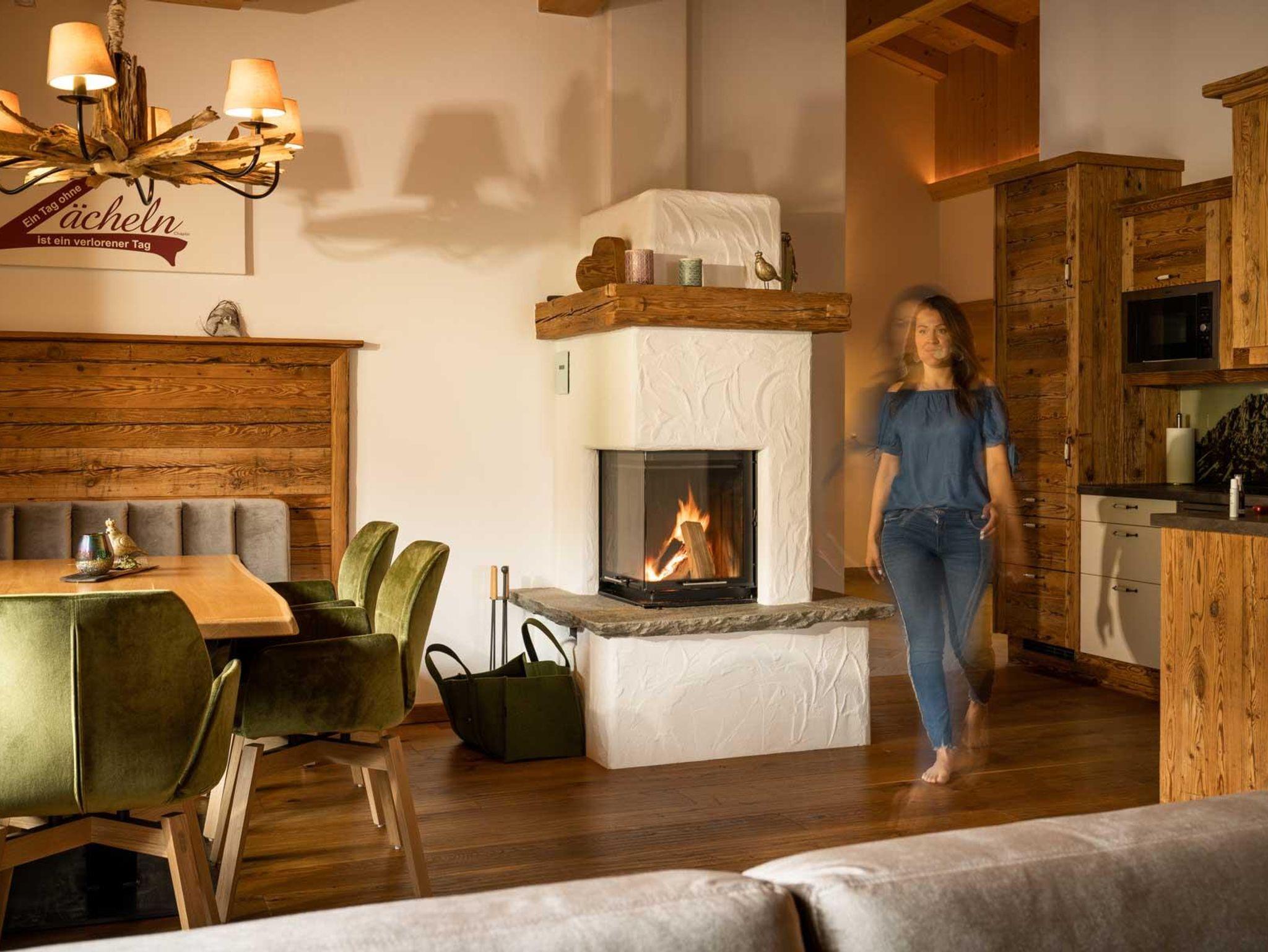 Die Einrichtung ist sehr gemütlich und luxuriös. Naturholz sowie Altholz sorgen für ein entsprechendes Ambiente. Zirbenholz in den Schlafzimmern für einen gesunden Schlaf sowie massive Holzböden mit Fußbodenheizung und in zwei Appartements ein offener Kamin sorgen für eine wohlige Wärme und runden das Wohlbefinden ab. Einem gesunden und behaglichen Raumklima und somit einem erholsamen Urlaub steht nichts mehr im Wege.