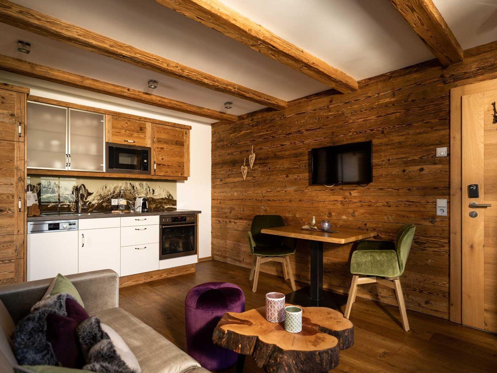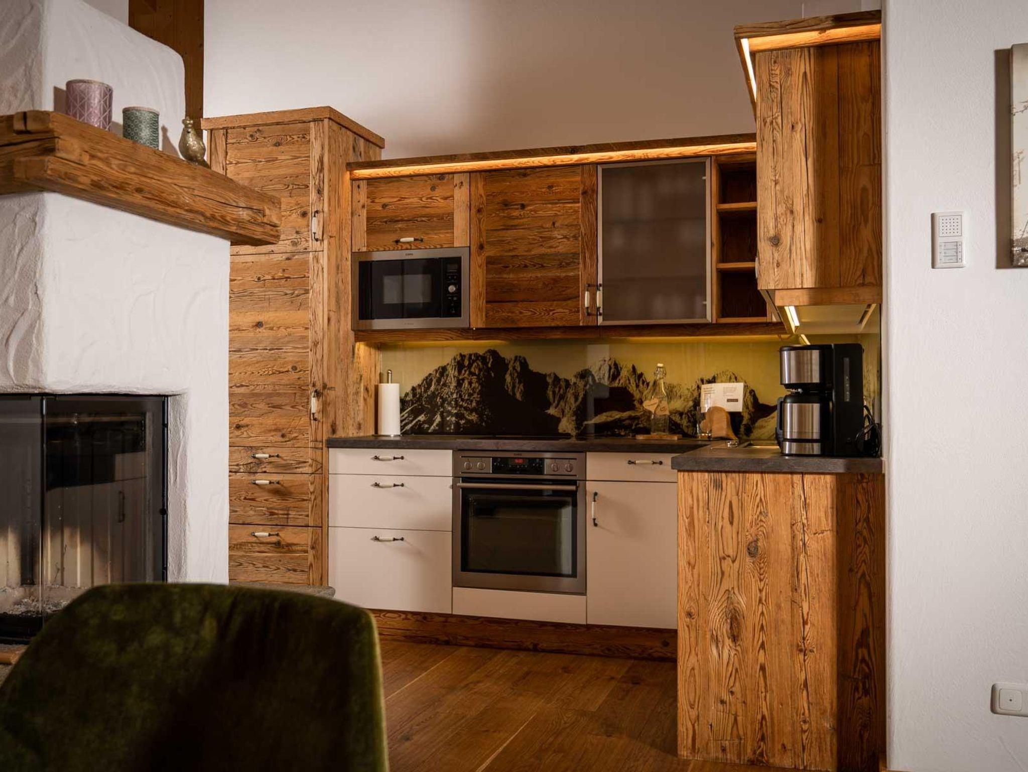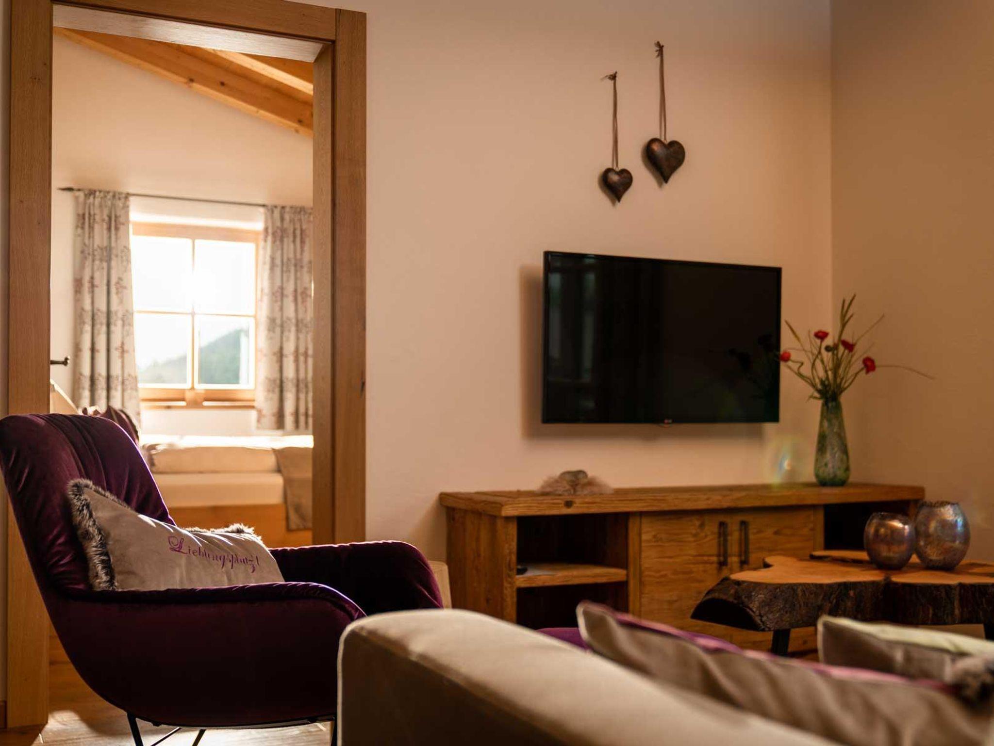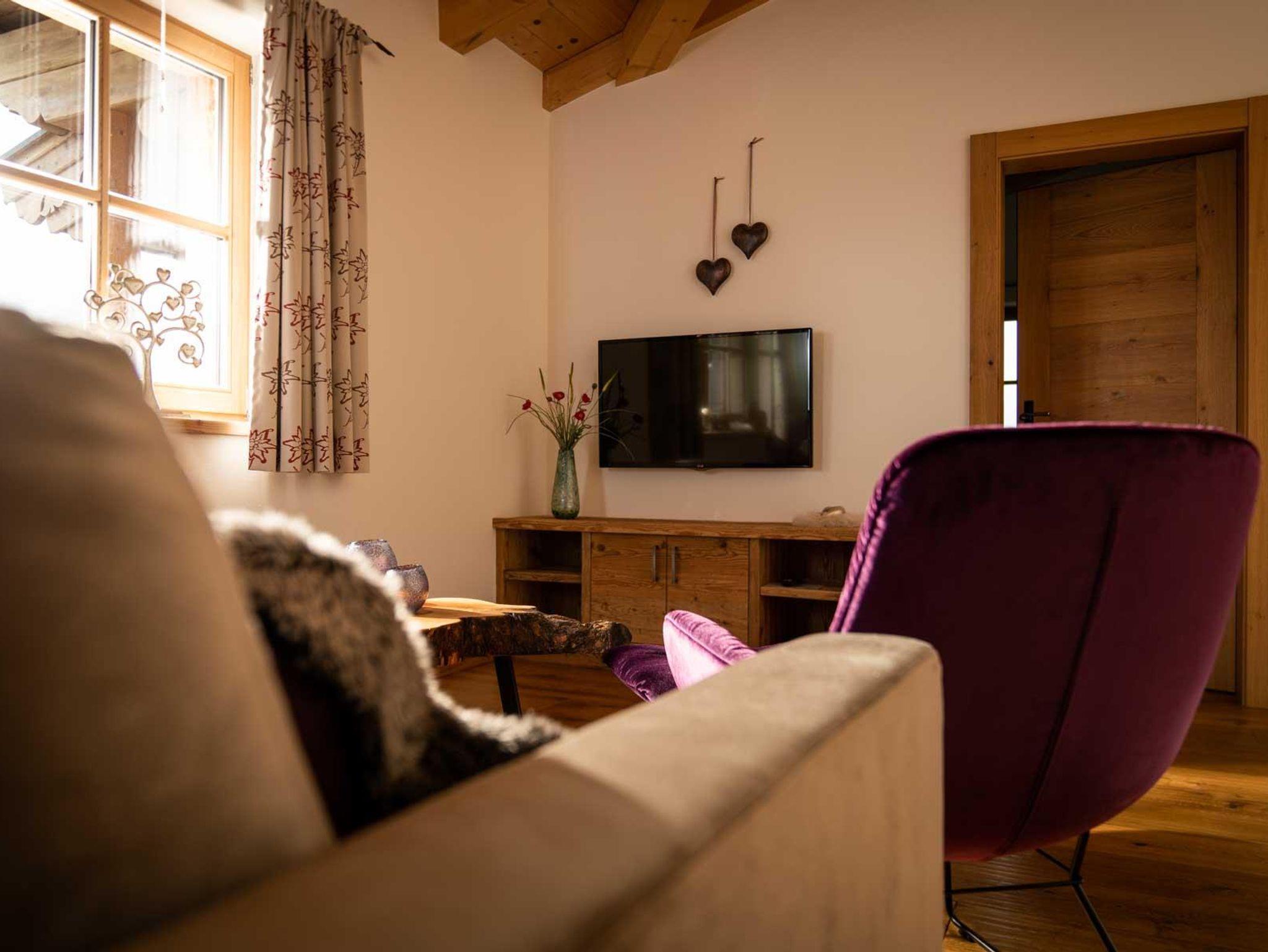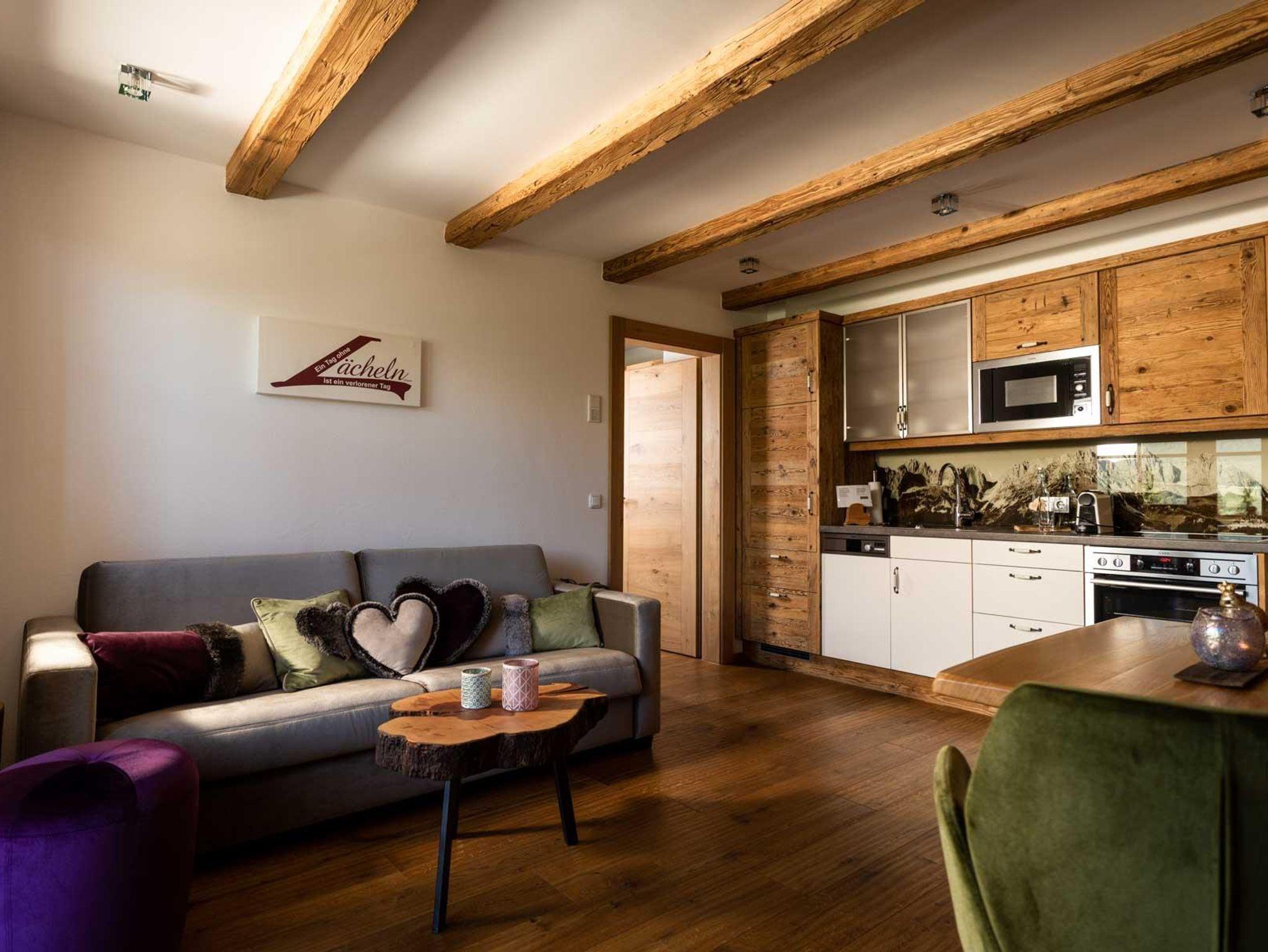 Die Einrichtung ist sehr gemütlich und luxuriös. Naturholz sowie Altholz sorgen für ein entsprechendes Ambiente. Zirbenholz in den Schlafzimmern für einen gesunden Schlaf sowie massive Holzböden mit Fußbodenheizung und in zwei Appartements ein offener Kamin sorgen für eine wohlige Wärme und runden das Wohlbefinden ab. Einem gesunden und behaglichen Raumklima und somit einem erholsamen Urlaub steht nichts mehr im Wege.