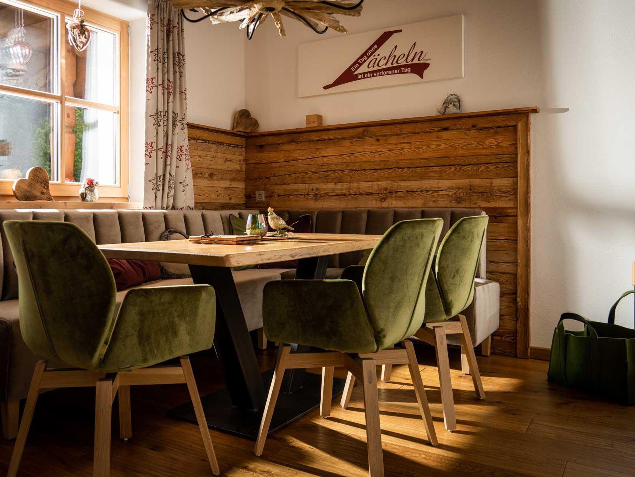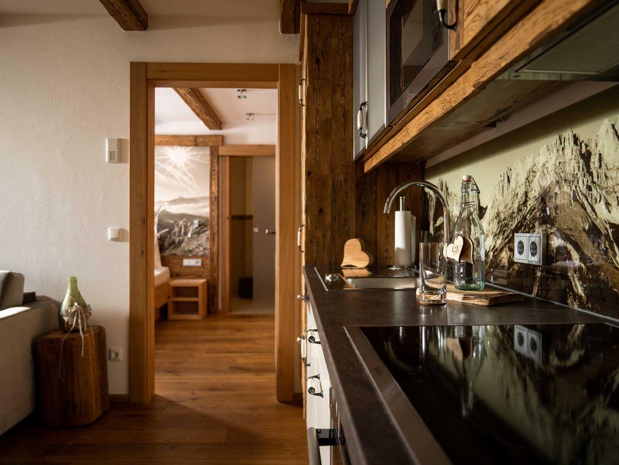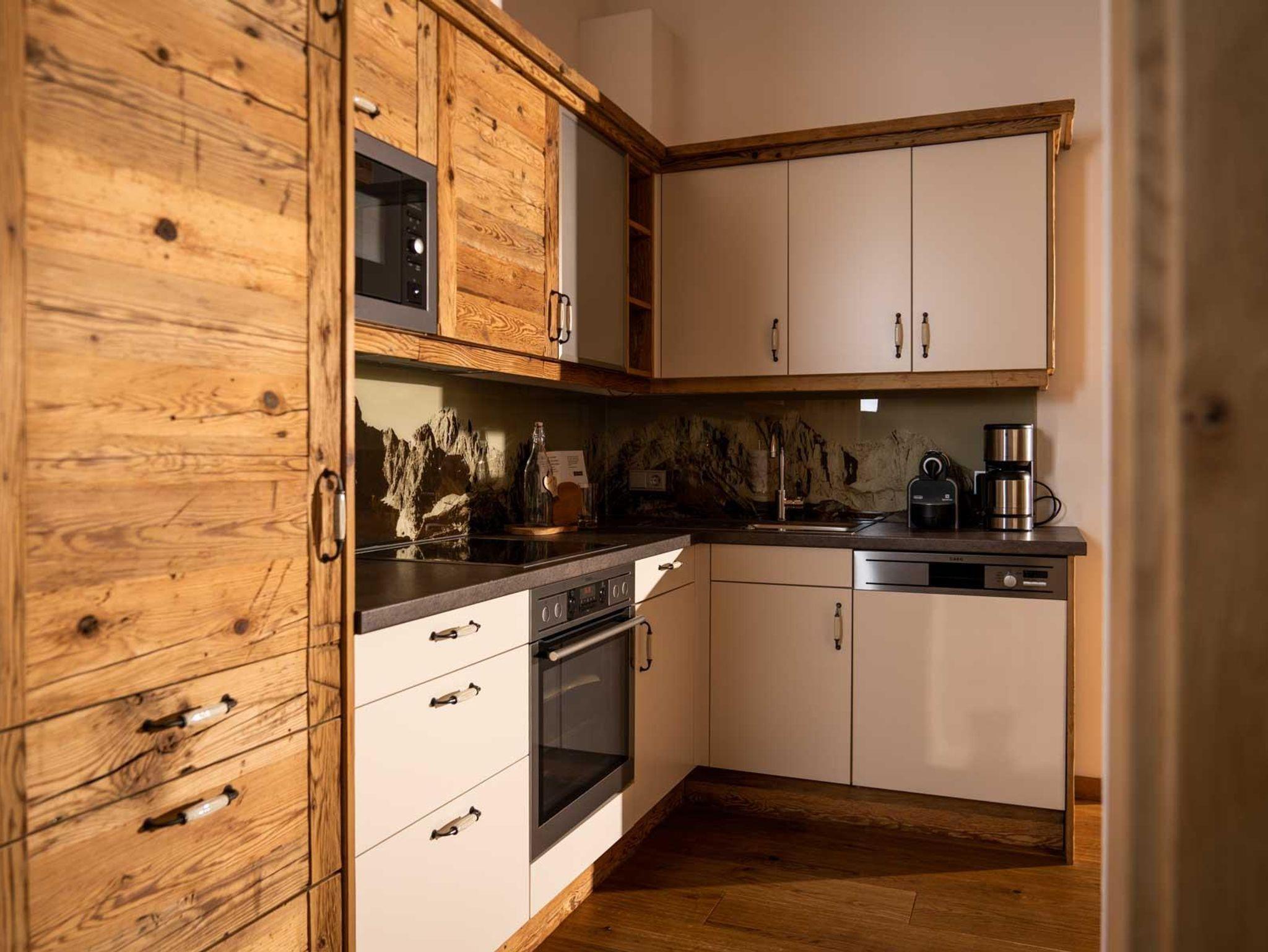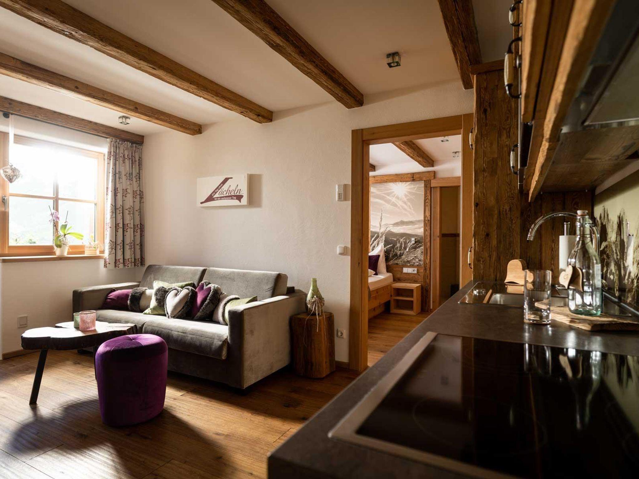 Die Einrichtung ist sehr gemütlich und luxuriös. Naturholz sowie Altholz sorgen für ein entsprechendes Ambiente. Zirbenholz in den Schlafzimmern für einen gesunden Schlaf sowie massive Holzböden mit Fußbodenheizung und in zwei Appartements ein offener Kamin sorgen für eine wohlige Wärme und runden das Wohlbefinden ab. Einem gesunden und behaglichen Raumklima und somit einem erholsamen Urlaub steht nichts mehr im Wege.