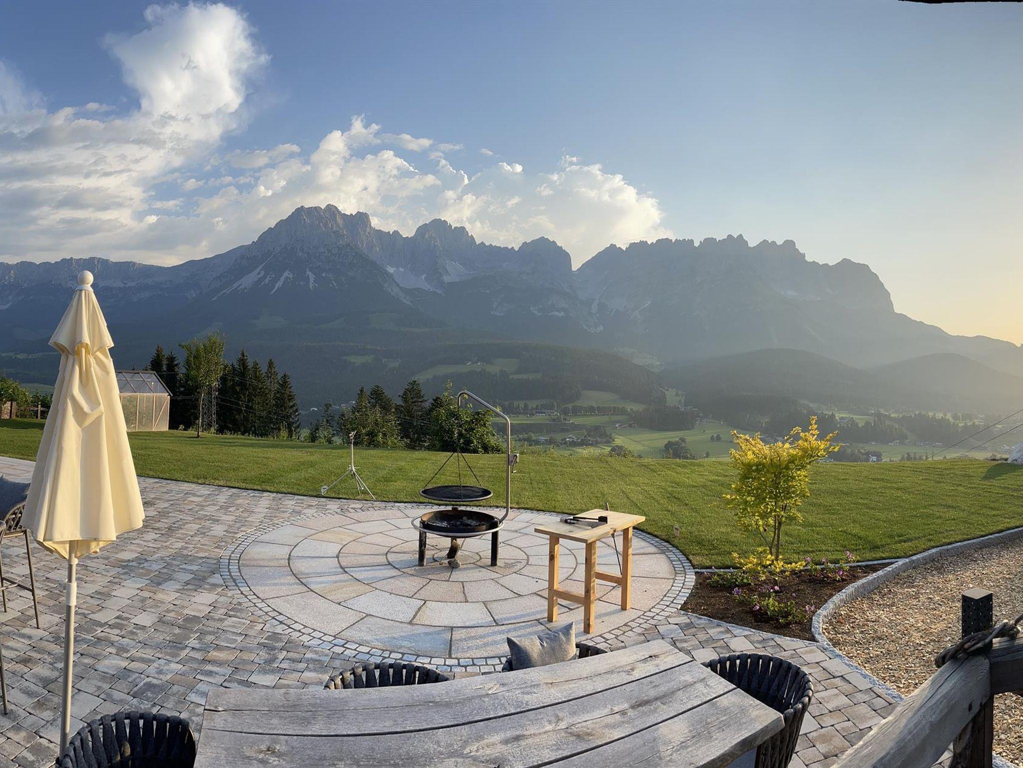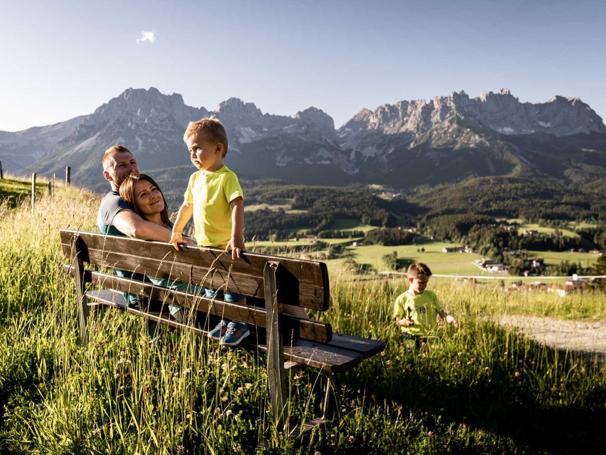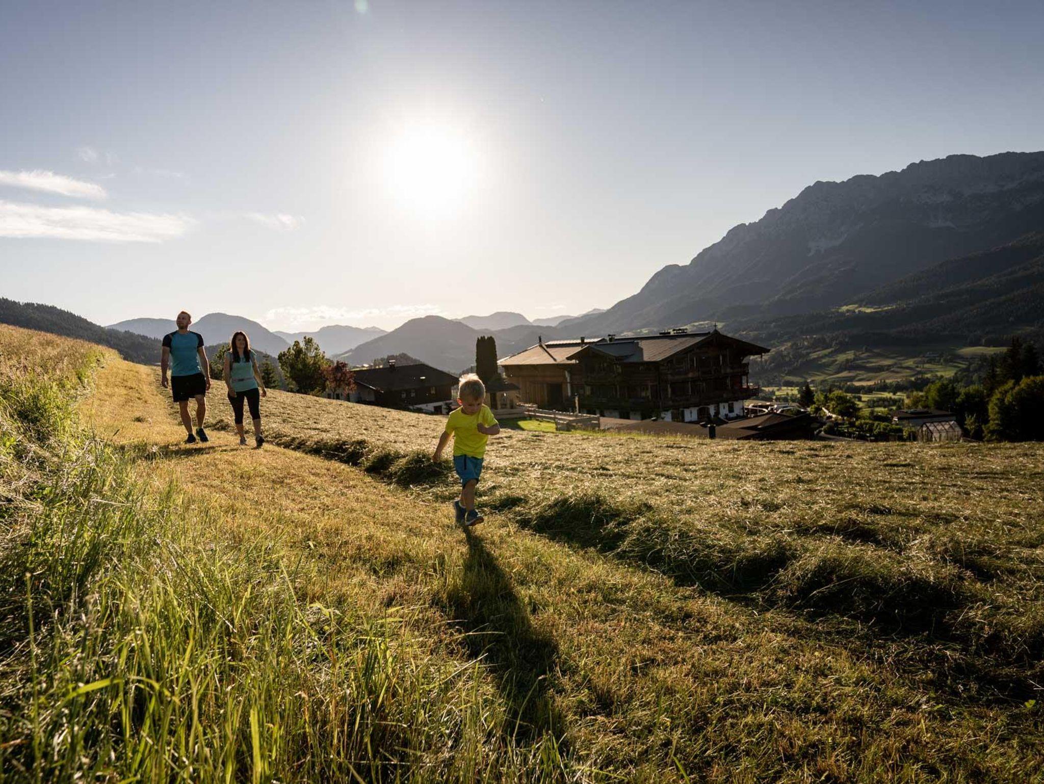 Unser Naschberghof liegt auf einem Plateau etwas oberhalb vom Ortszentrum Ellmau inmitten der Natur, umgeben von Wiesen und Wäldern. Von hier genießen Sie einen unverbauten und einzigarten Panoramablick auf das Bergmassiv des Wilden Kaisers sowie auf die gesamte Bergwelt. Zum Ortszentrum sind es 10 Minuten zu Fuß.