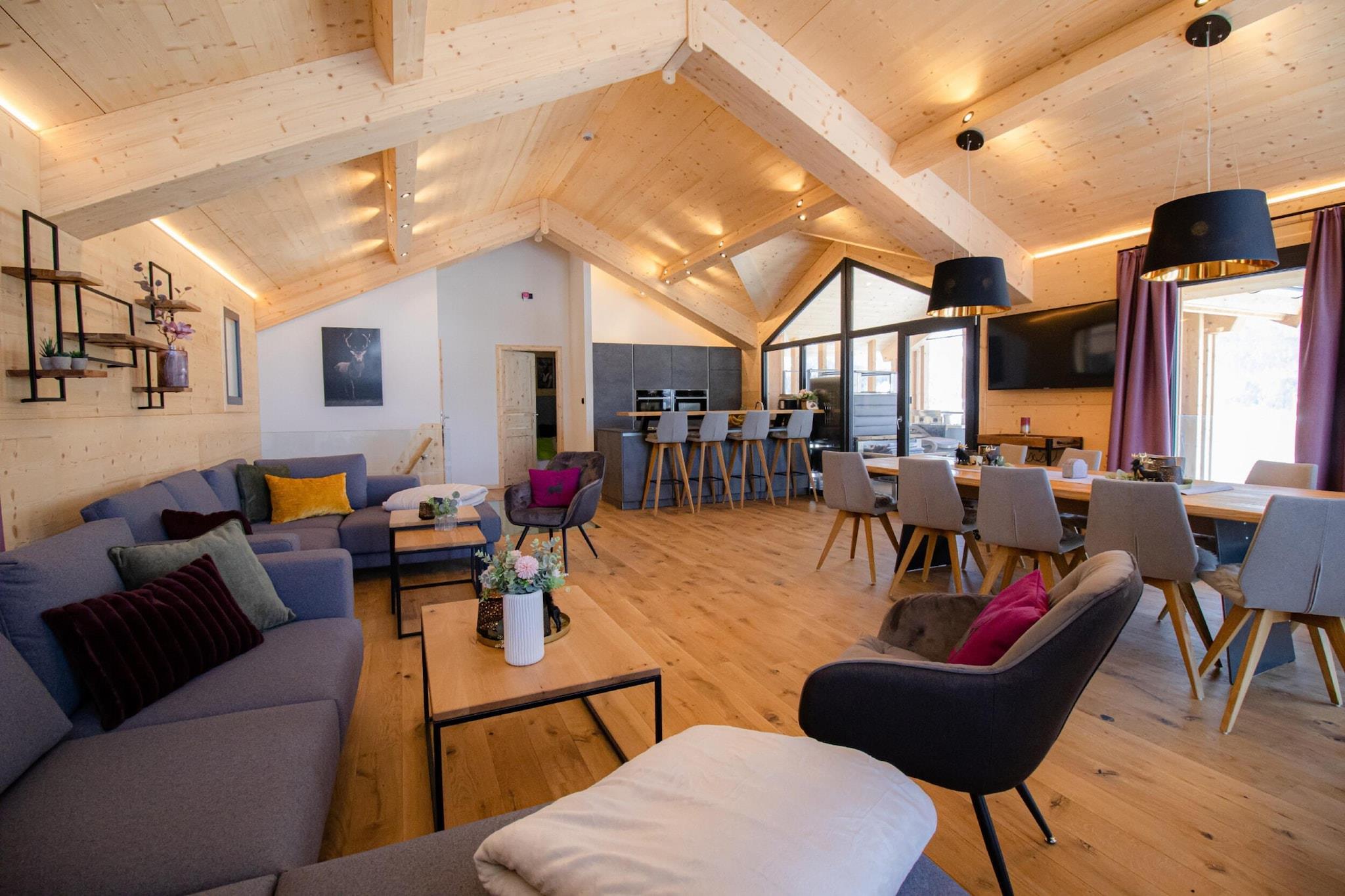 Velkommen til den luksuriøse 150 m² Superior Chalet, et perfekt tilflugtssted for op til 10 gæster. Denne rummelige hytte har fem elegant designede soveværelser og fem badeværelser, heraf fire en suite. Nyd ultimativ afslapning på badeværelset med en Bali-dampbruser og sauna, eller slap af i badekarret med bruser og badekar. Der er bekvemt et separat toilet og hårtørrer. Chaletens højdepunkter omfatter en privat sauna og en 27°C varm pool på terrassen, perfekt til at slappe af og nyde den alpine atmosfære. Med direkte adgang til pister og private wellness-områder kan du også drage fordel af Schladming-Dachstein Summer Card (midten af maj til begyndelsen af november) og spise på kAlps Foodbar. Schladming-Dachstein-regionen byder på en bred vifte af aktiviteter året rundt. Om vinteren kan du udforske familieskiområder som Ski Fageralm og Ramsau, mens sommeren inviterer dig til naturskønne vandreture, alpine søer og spændende via ferratas. Deltag i guidede sneskovandringer, alpaca-vandringer og mere, med topbegivenheder som The Nightrace og Mid Europe, der forbedrer dit ophold. Hvert soveværelse er udstyret med komfortable boxspring-dobbeltsenge, der sikrer en god nats søvn. Det lyse, luftige opholdsområde, komplet med et hyggeligt gaskomfur, tilbyder en fantastisk udsigt over bjergene, hvilket forbedrer din afslapning efter en dag med eventyr. Det fuldt udstyrede køkken imødekommer alle dine kulinariske behov, med bestik og køkkengrej, en keramisk kogeplade, ovn, køleskab med fryser og opvaskemaskine. Yderligere faciliteter omfatter en brødrister, elkedel og både et filter og en Nespresso-kapselkaffemaskine. Et lille startsæt med vigtige forsyninger venter på dig ved ankomsten. Gratis Wi-Fi og satellit-tv er til rådighed for din bekvemmelighed. Bemærk venligst, at alle billeder er eksempelbilleder; hver hytte er unikt indrettet for at give en særegen oplevelse.