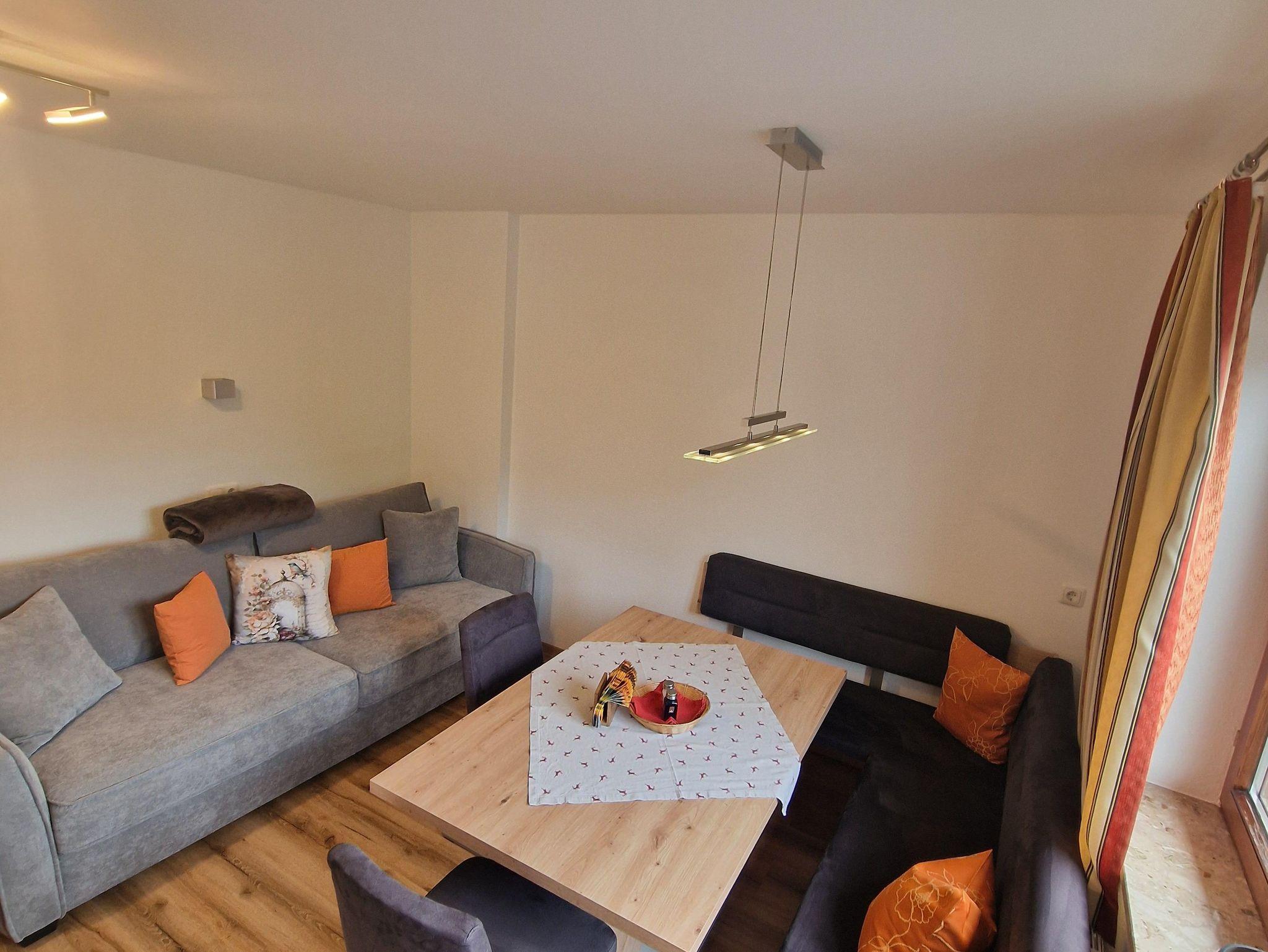 Die Ferienwohnung ((ca. 70 m2) mit zwei Schlafzimmern, einem Wohnschlafraum mit Kachelofen und ausziehbarer Couch, Sitzecke, Kochnische, getrenntes Bad/WC, Balkon oder Terrasse, Kabel-TV, Radio, gebührenfreier Internetanschluss.