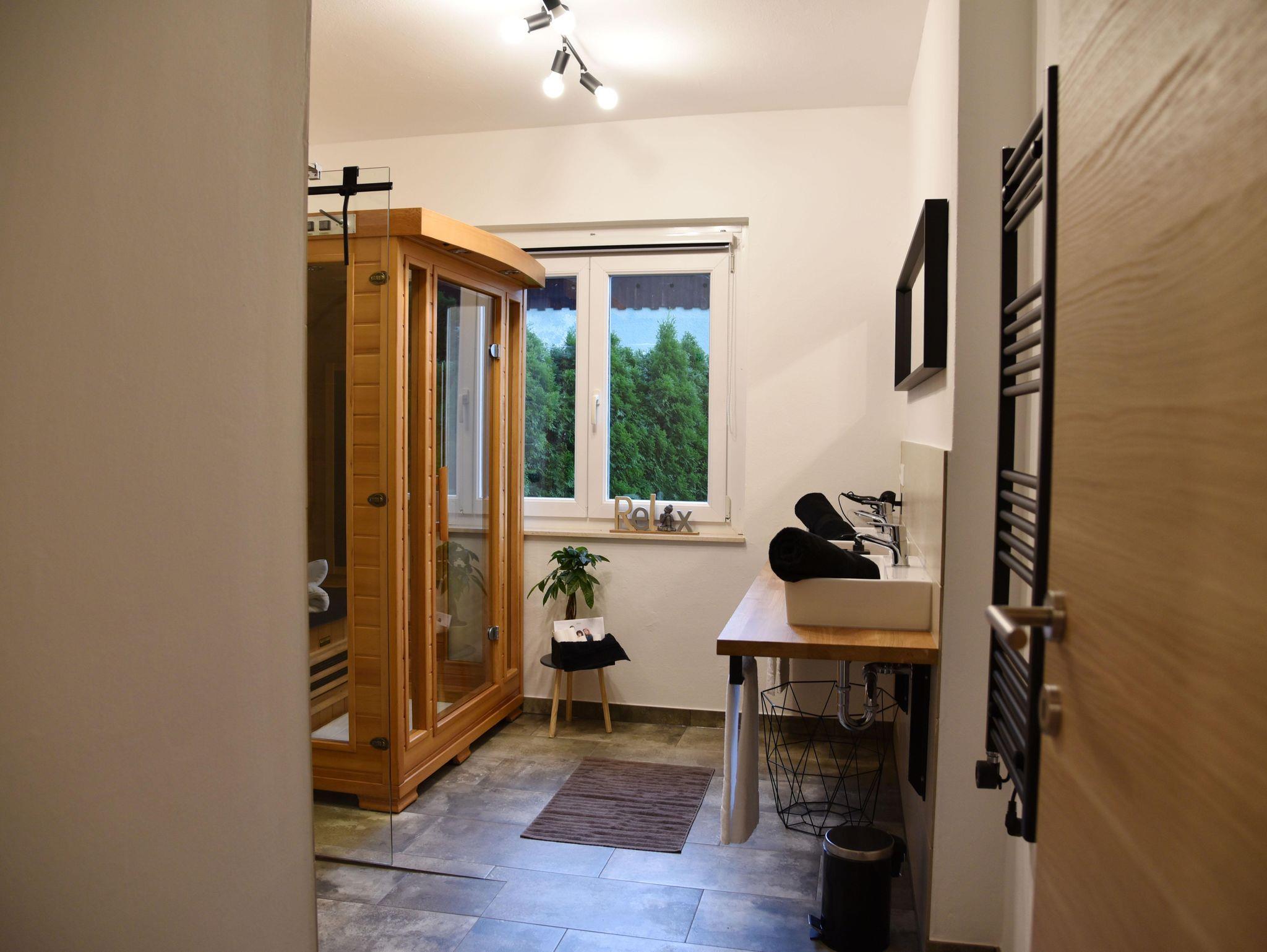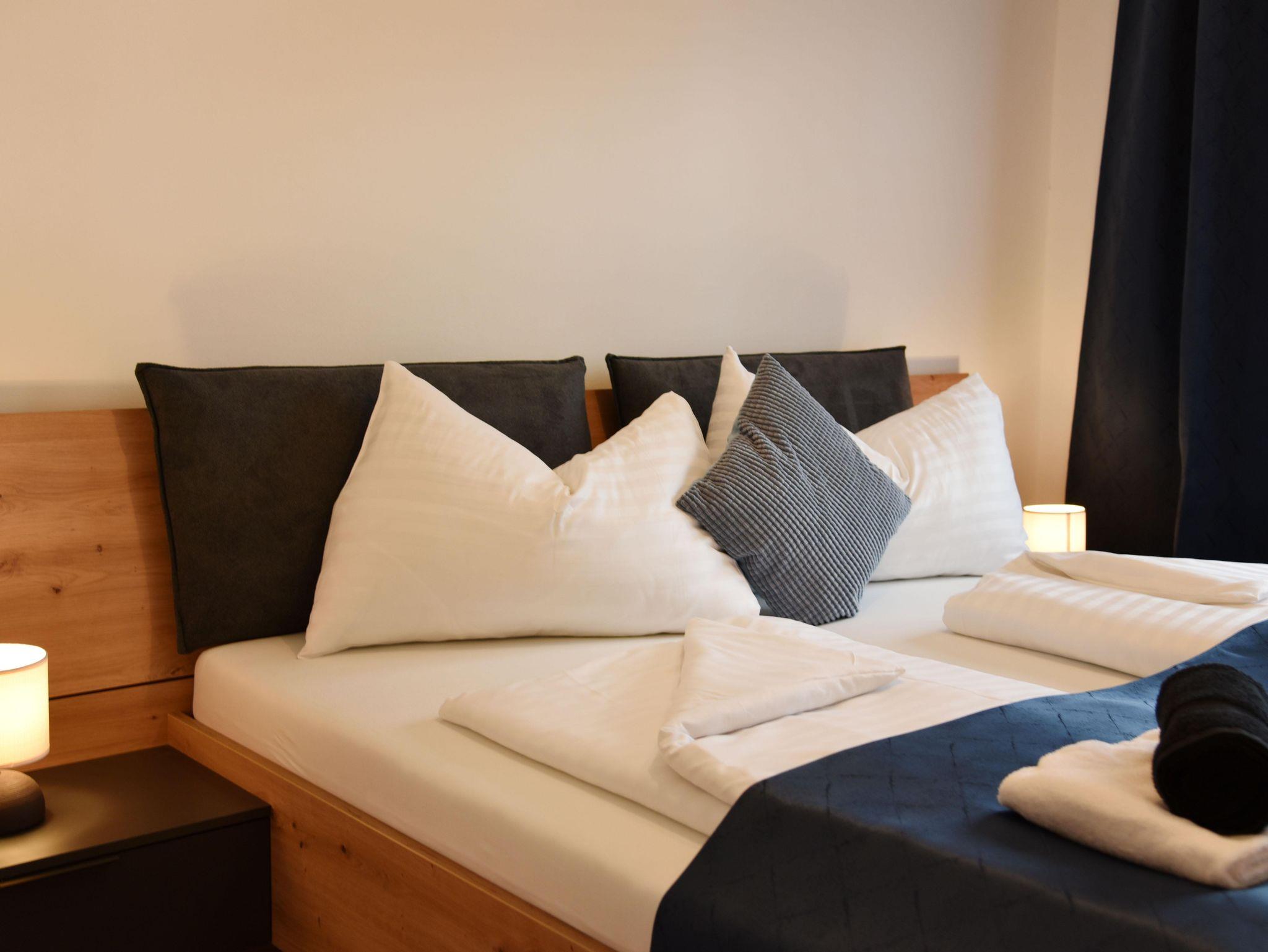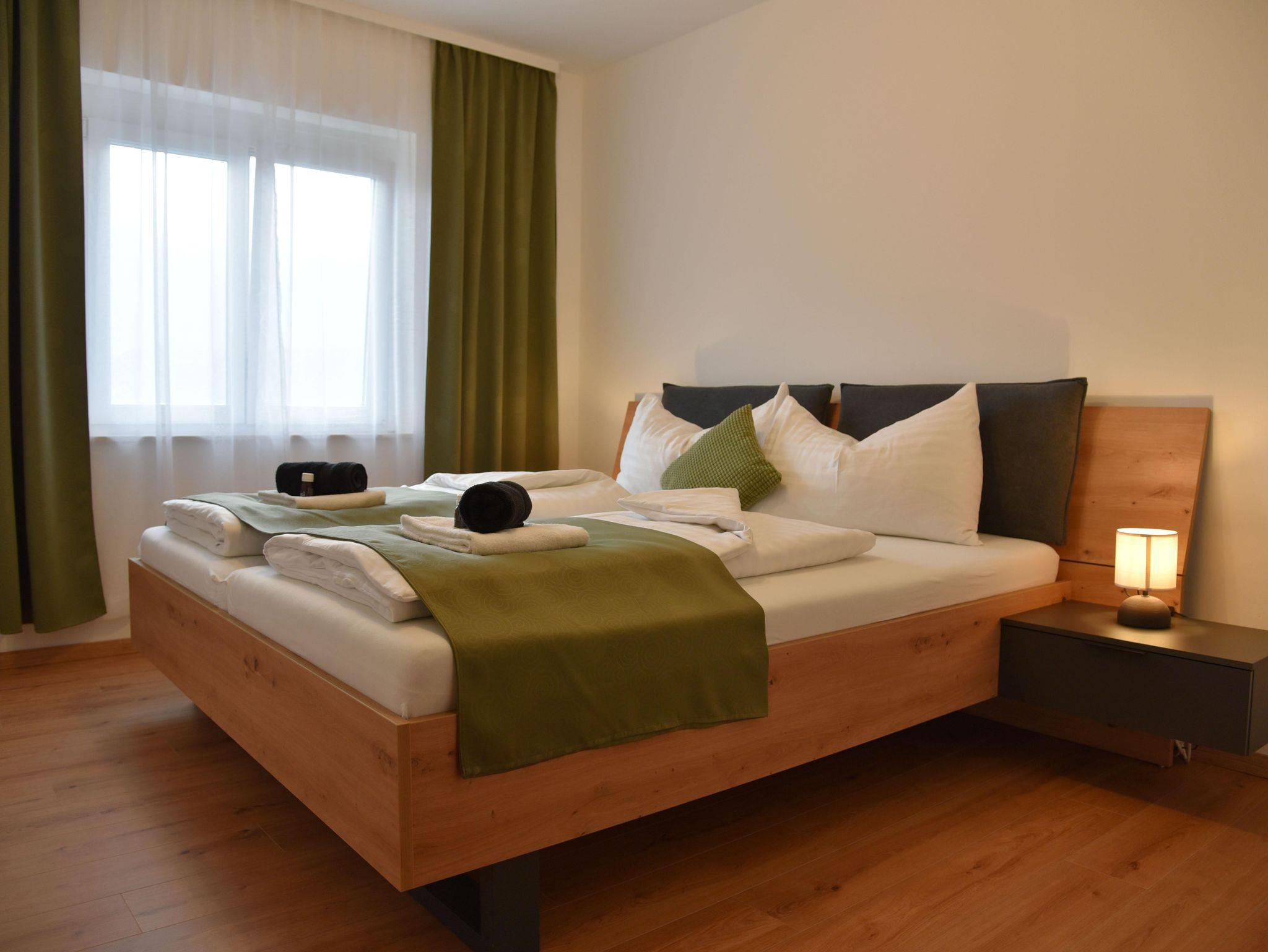 Es bietet einen Küchen-Wohnraum mit ausziebarer Couch, 2 Schlafzimmer mit Doppelbett und Kasten, Dusche mit Infrarotkabine, separates WC und einen Balkon.
