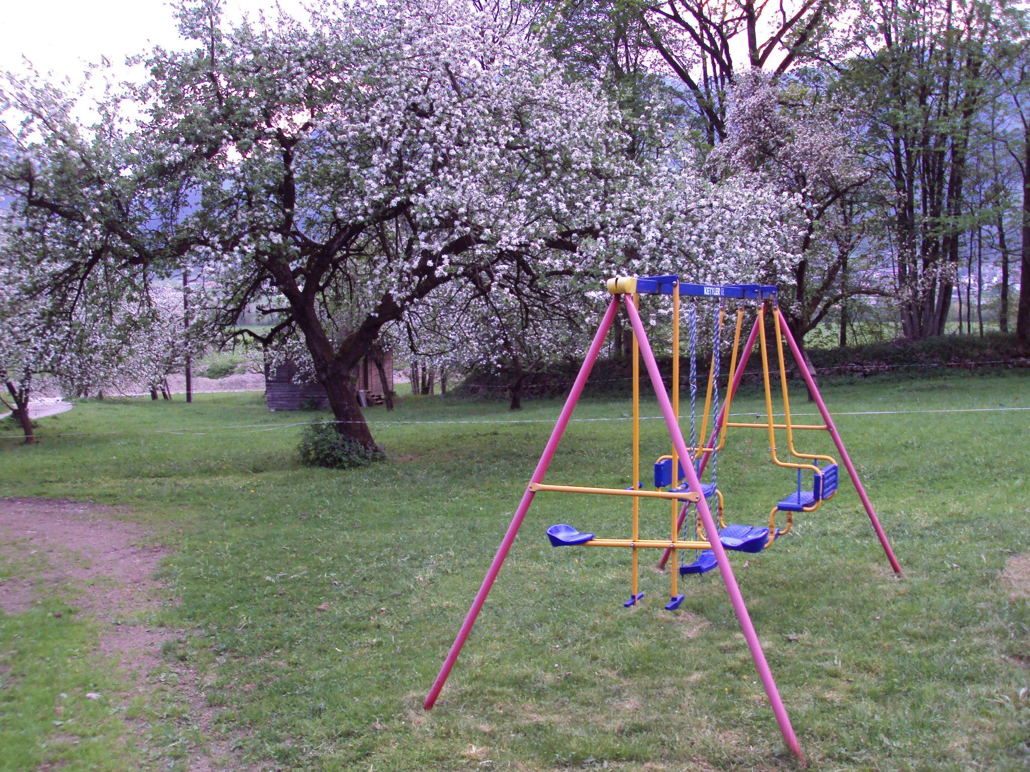 in the outdoor area there is a large plot with old apple trees and a swing for the children....
