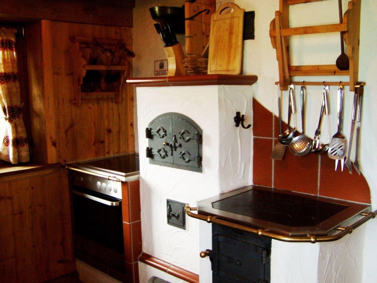 Voll ausgestattete Küche: Elektroherd mit Backofen, Kühlschrank mit Gefrierfach, Kaffeemaschine, Toaster, Wasserkocher, Holzofenherd & Aufschnittmaschine