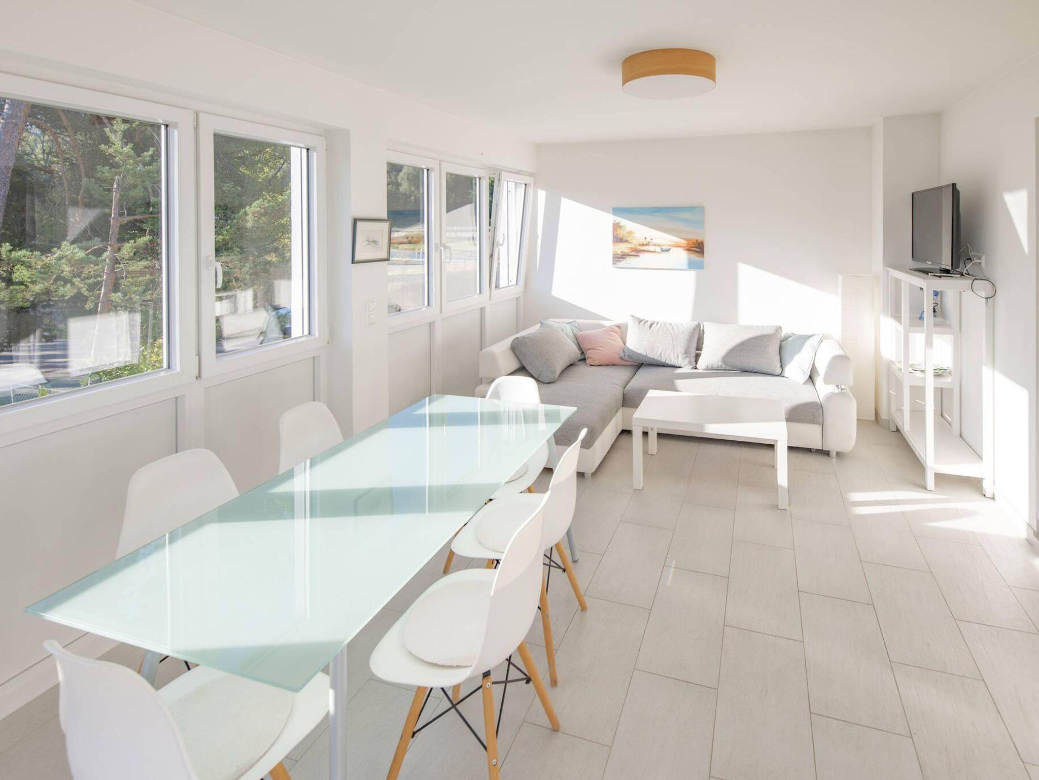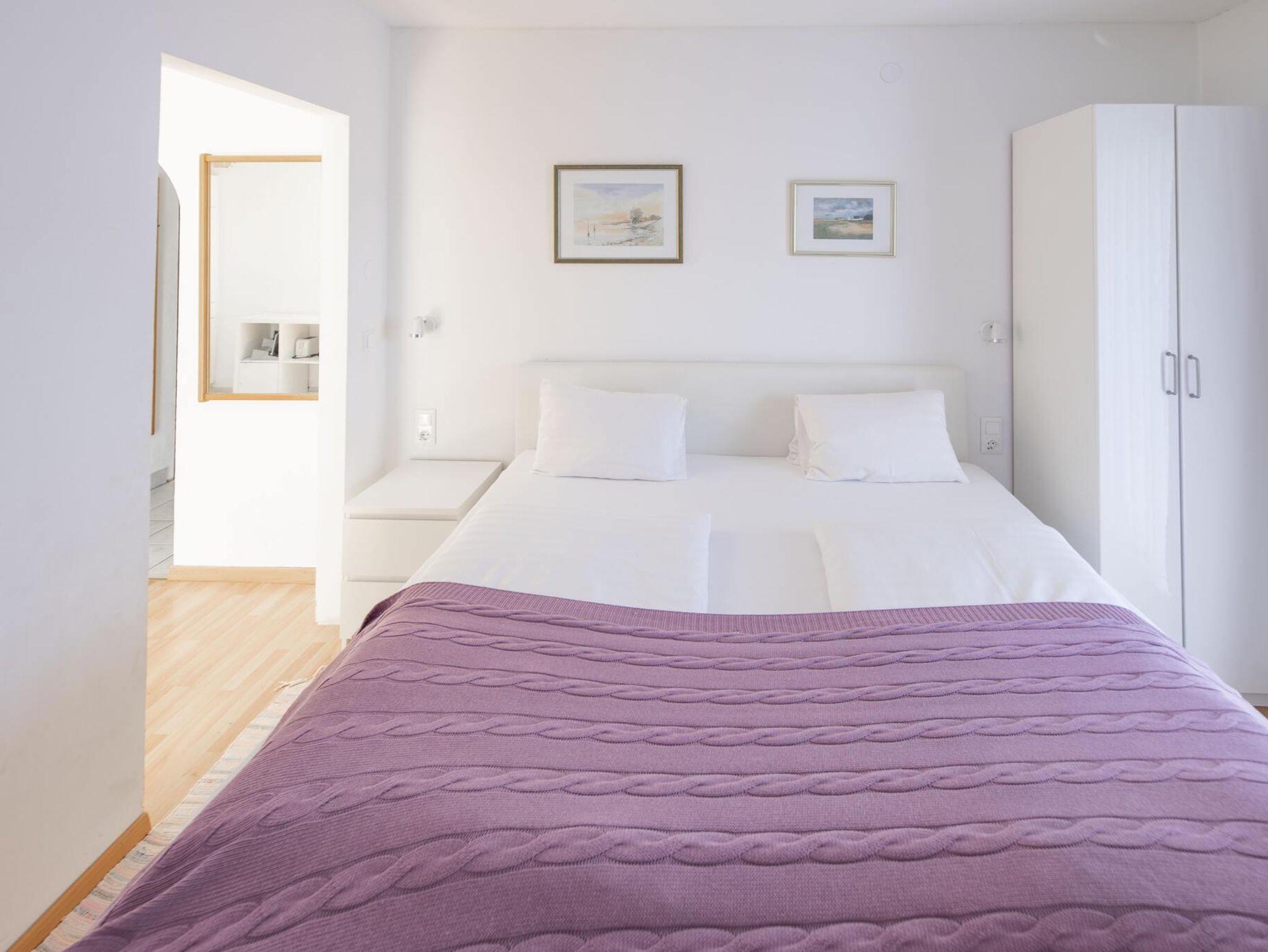 Unser schönstes und größtes Appartment, mit breiter Fensterfront im Wohnraum, Kamin und Couch zum Wohlfühlen. Natürlich sind auch hier alle Möbel in weiß gehalten, die Schlafzimmer mit Boxspringbetten ausgestattet.