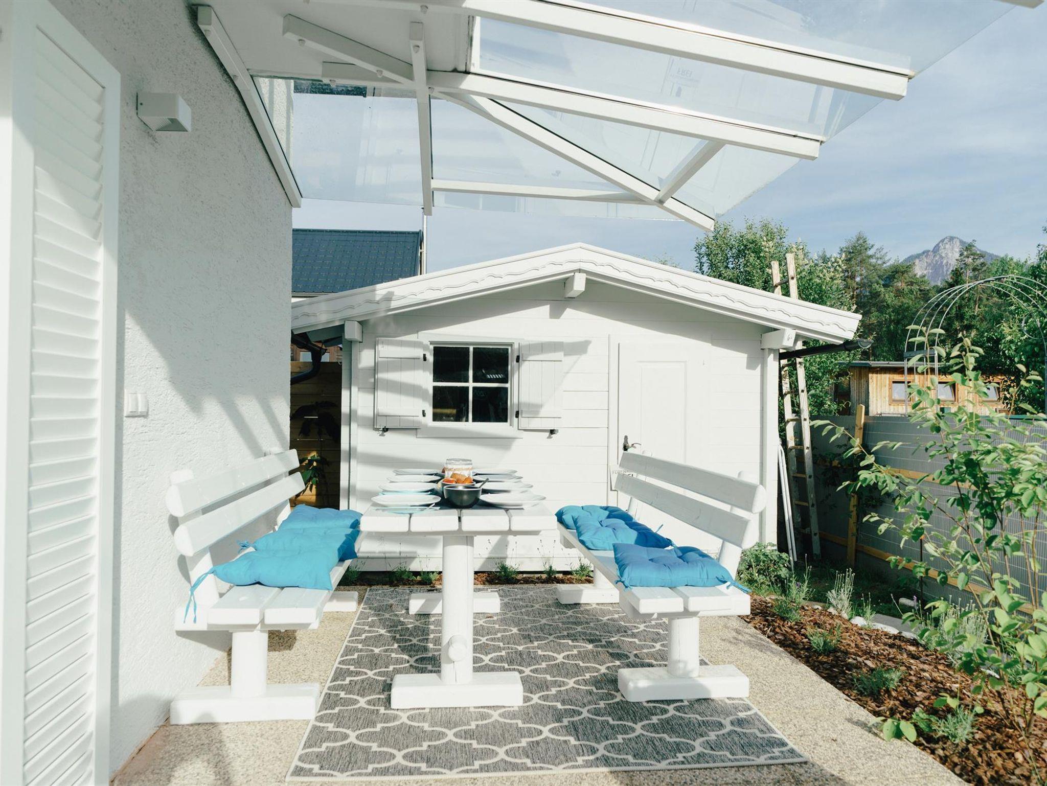 • überdachte Terrasse mit großer Outdoor-Sitzgruppe und abnehmbaren Sonnensegel