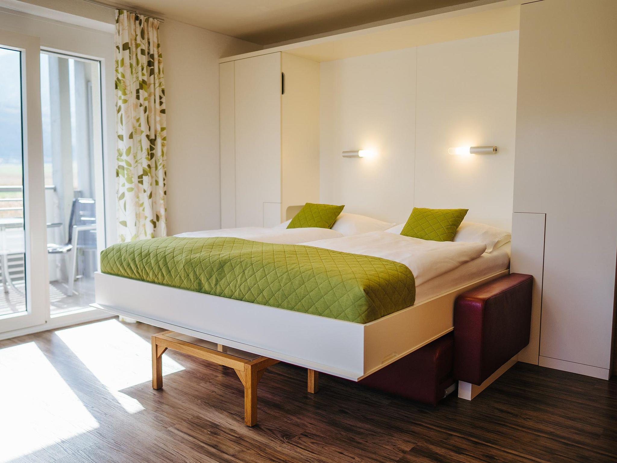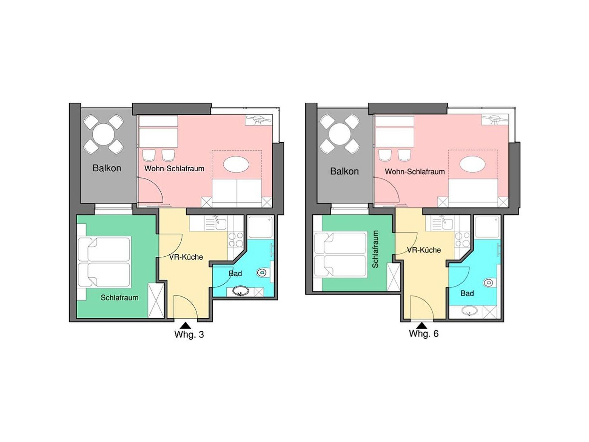 Diese komplett NEUEN und MODERNEN Wohnungen bestehen aus je einem Vorraum mit Küche, Wohn/Schlafraum (mit keiner ausziehbaren Couch - sondern mit einem frei schwebendem Schrankbett für 2 Personen = normales Ehebett), separatem Schlafzimmer, Badezimmer mit Dusche/WC und je einem herrlichen Balkon.