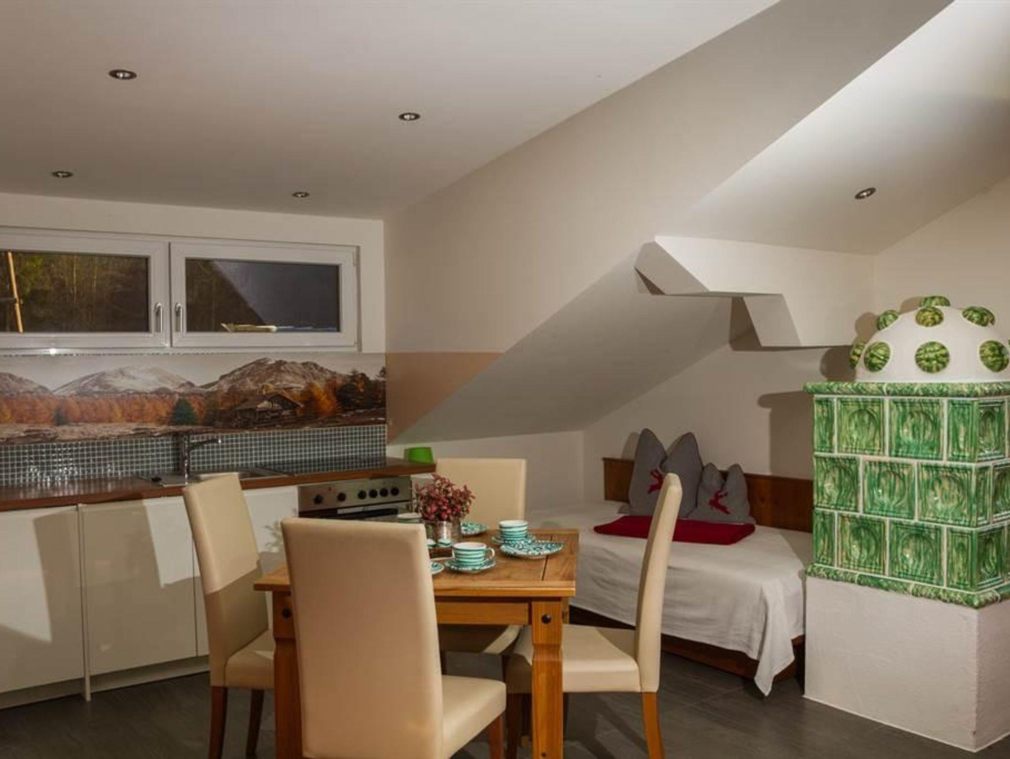 • große helle Wohnküche mit komplett eingerichteter Küche, Essbereich, Kachelofen mit Bank, TV