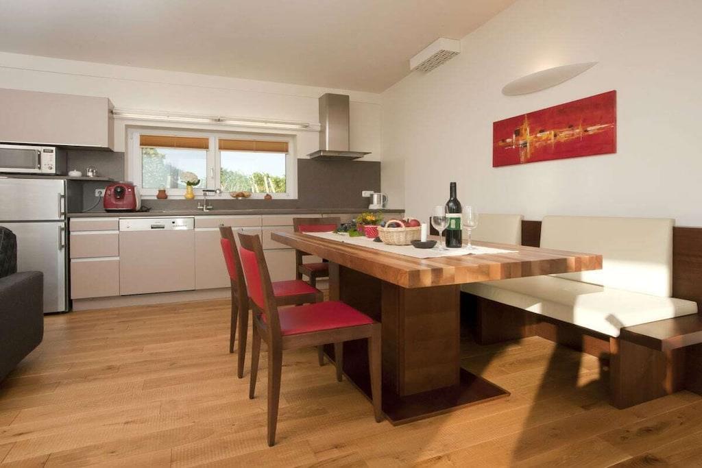 "Das Nussberg", et moderne feriehus i hjertet af vores vingård, tilbyder ideel komfort for 2 voksne (maks. 5 personer). Vi værdsætter kvalitet: smukt tømrerarbejde, fine trægulve, en privat sauna i feriehuset med udsigt over vinmarken. En rummelig terrasse med siddepladser og liggestole fungerer som udendørs opholdsstue. Morgenmad er tilgængelig på vores gårdferiehus, Kürbishof i landsbyen! Regional gårdbutik på Kürbishof: gårdens egen græskarkerneolie, snackfrø, regionale juicer (fersken, jordbær, æble, hyldebær, gulerod) og kvalitetsvine, marmelade, honningspecialiteter, urteprodukter, fin spiritus, gaveartikler osv.
